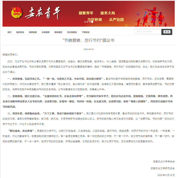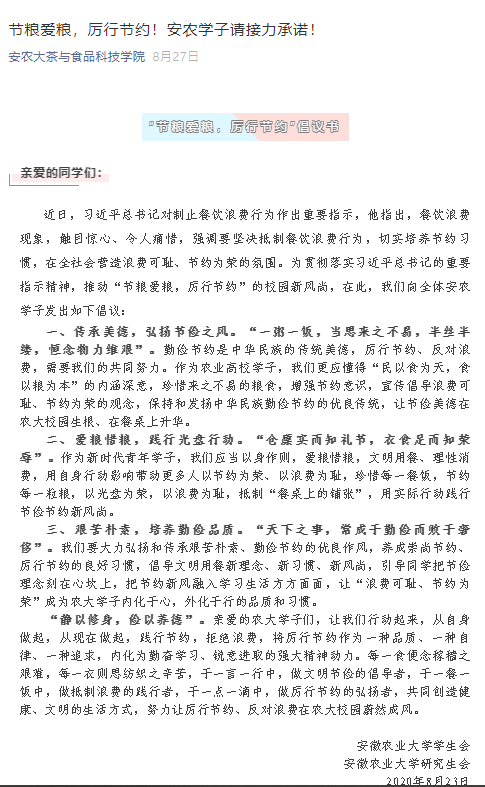 校学生会、研究生会于8月23日联合向全校学校发出“节粮爱粮,厉行节约”倡议书,随后各学院学生分会倡议书也陆续发布。倡议活动中,同学们纷纷表示:现如今,虽然我国的经济总量扩大了,但国家建设需要办的事还很多。我们必须坚持厉行节约,反对浪费的方针,努力培养自己的节约意识,大到压缩到各种经济开支,小到一粒粮食,都要树立勤俭节约关荣铺张浪费为耻的观念……