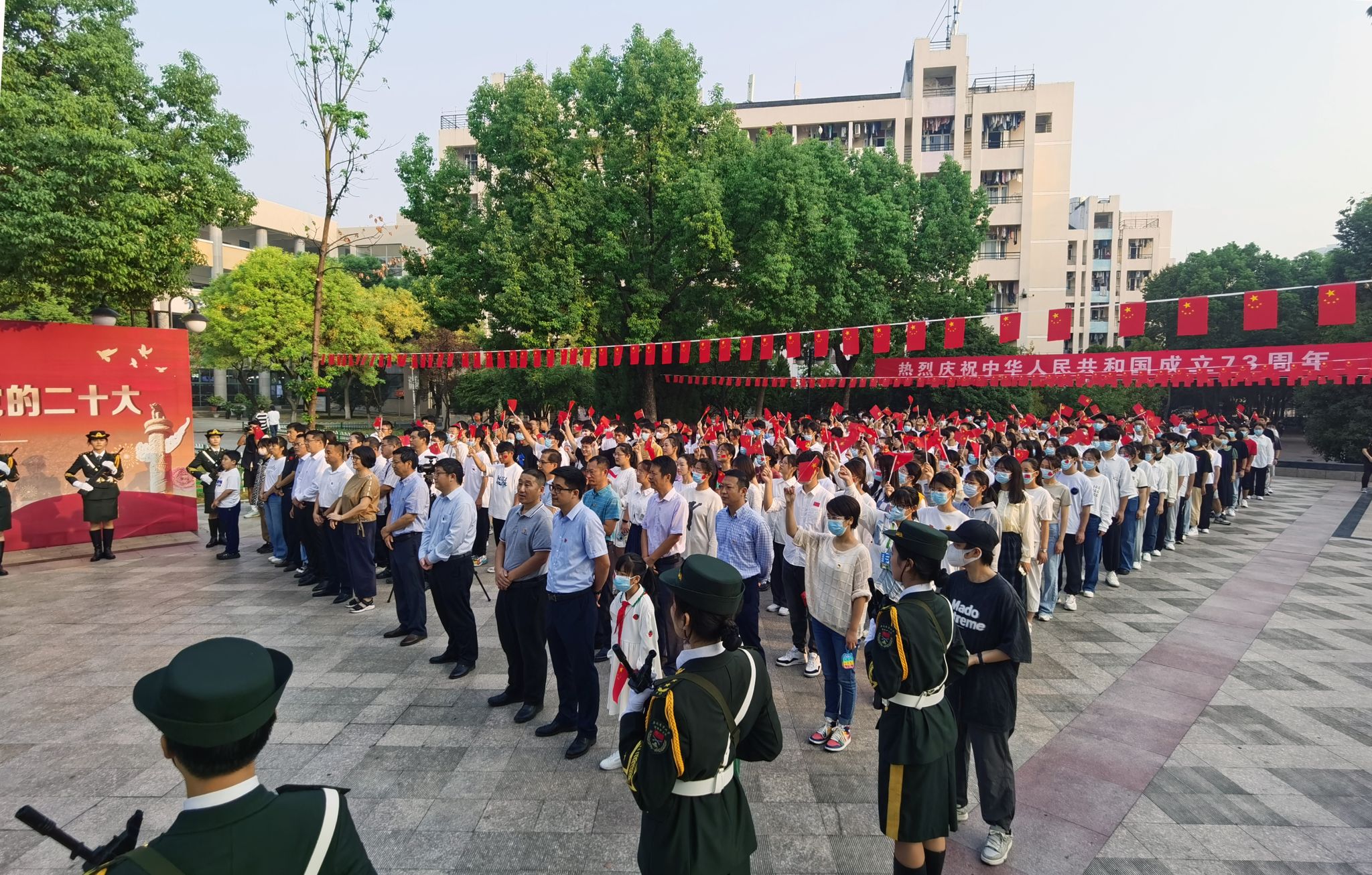 仪式在合唱声中缓缓落下帷幕,全体师生挥舞手中的国旗,一起祝福伟大祖国繁荣昌盛,喜迎党的二十大胜利召开。