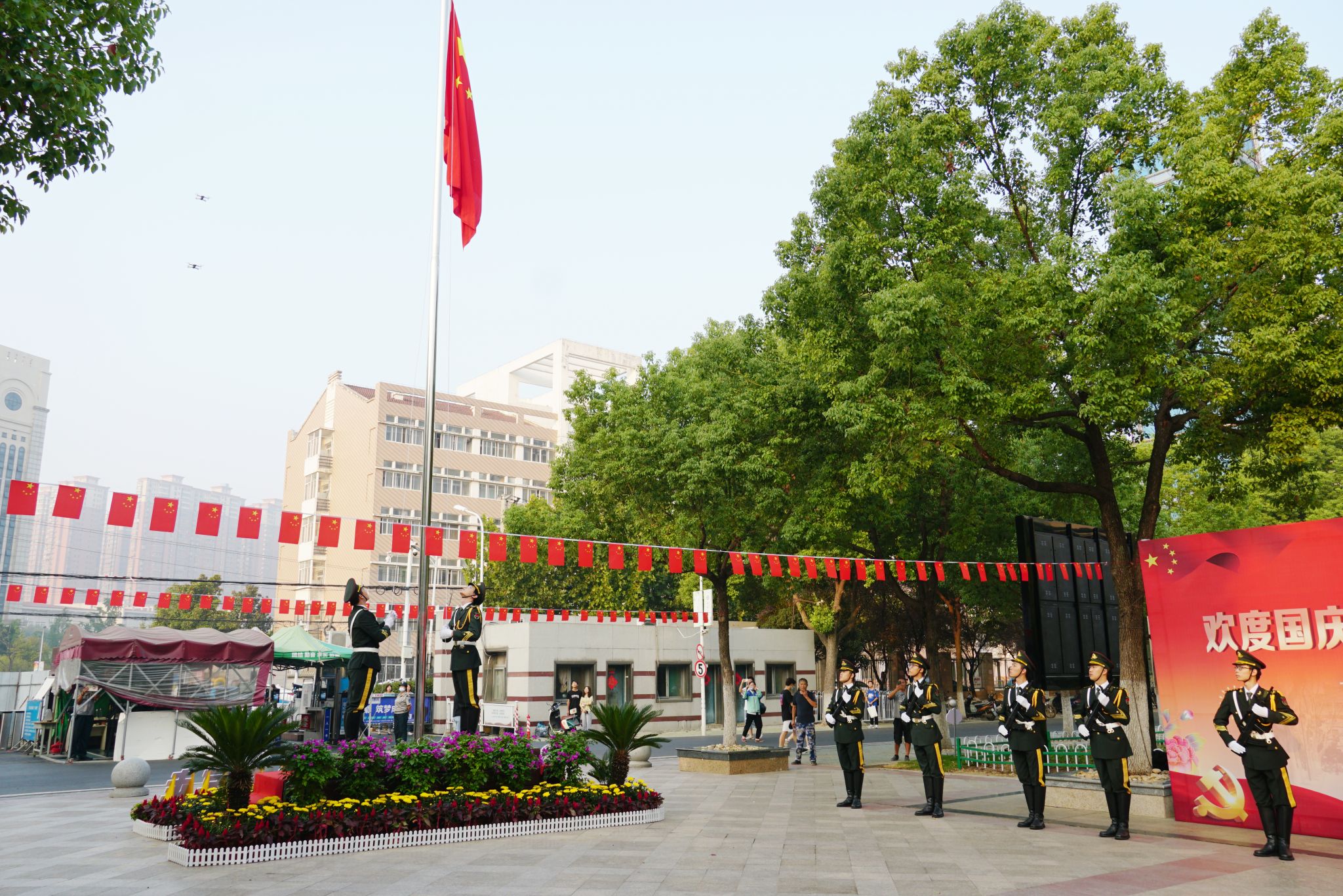 升旗仪式庄严肃穆,校国旗护卫队标兵精神抖擞、正步铿锵。7时整,伴随雄壮的国歌,五星红旗冉冉升起、迎风飘扬。全体师生庄严肃立、瞩目国旗,齐声高唱国歌,每个人的心中油然而生一股对祖国母亲73岁生日的祝福。