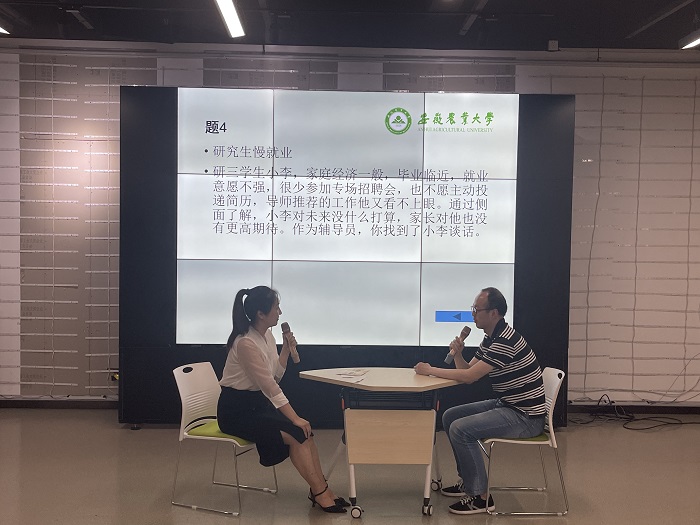 决赛阶段共有案例研讨、谈心谈话两个比赛环节。其中案例研讨两名辅导员抽签成组,采用“你提问,我回答”的方式进行交互式问、答,主要考察辅导员老师综合运用理论进行分析问题、研讨问题、解决问题的能力;谈心谈话主要考察辅导员对相关理论政策、学生特征、学生成长成才规律的了解把握及对问题的解决能力和对学生的教育引导能力。决赛中,选手们围绕辅导员工作职能,在问与答中分析原因、研讨对策,在辩与论中把握技巧、总结规律,在引导和误导中既当对手、又成帮手,在攻和守中出招、拆招……比赛过程精彩纷呈,高潮迭起,彰显了辅导员素质能力多元化、实战化的新风尚。茶与食品科技学院党委书记唐红萍对大赛做了精彩点评。