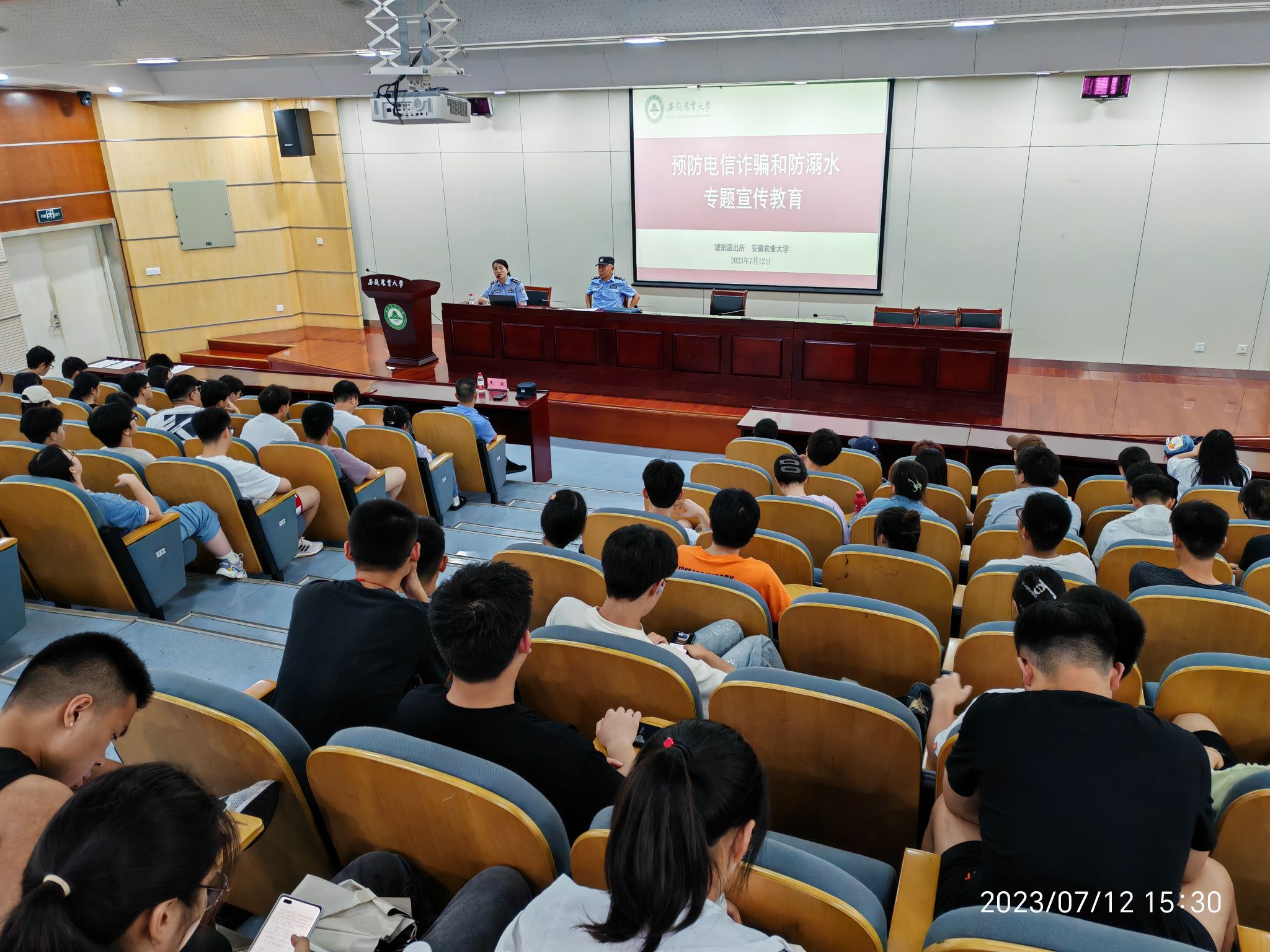 本网讯 7月12日下午,学工部(处)邀请琥珀派出所副所长王波、警长孙健民、刑警三队警长燕莹来校开展了预防电信诈骗和防溺水安全知识进校园活动,200名假期留校学生代表参加了活动。