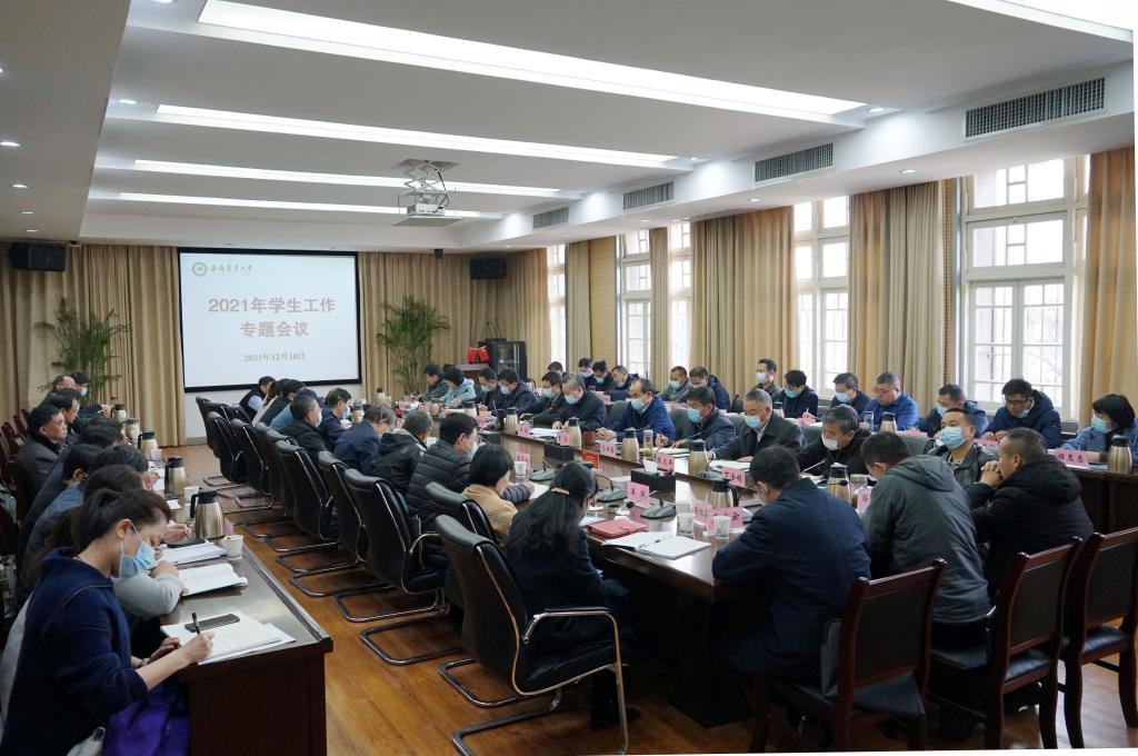 本网讯 12月10日上午,我校在第三会议室召开2021年学生工作专题会议。校领导江春、夏涛、裴树东、马传喜、韩军、陈文兵出席会议。校党委副书记裴树东主持会议。
