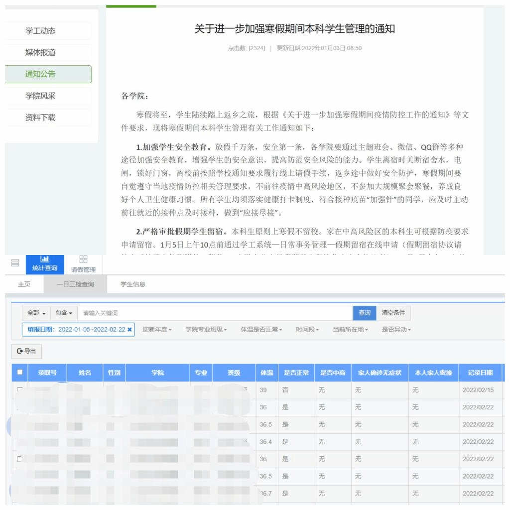 寒假期间,发布了《关于进一步加强寒假期间学生管理的通知》,加强学生安全教育,严格落实健康打卡制度。寒假的43天,每日健康打卡成了全校研究生和本科生每天必完成的作业,也成了辅导员、班主任每天与学生沟通交流的必聊话题,在老师和学生的努力下,寒假43天健康打卡始终做到100%。老师们通过健康打卡的数据了解学生的位置和健康状况,为返校精准摸排积累了第一手资料和数据。