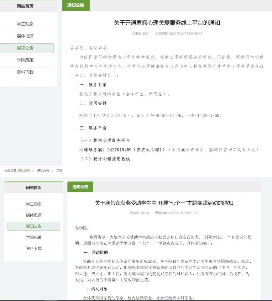 为帮助返乡学生保持良好的学习和生活状态,校心理健康教育中心在寒假开通学生心理关爱服务线上平台,全天候给同学们提供心理支持和帮助,保障心理关爱服务无假期,寒假期间共为 15人提供心理咨询。在经济帮扶方面,校学生资助管理中心为27名孤儿发放2.7万元过年红包,发布《关于寒假在获奖受助学生中开展“七个一”主题实践活动的通知》,组织全体获奖受助学生根据自身实际情况,从“参与一次志愿服务”“开展一场资助政策宣讲”“准备一份新年礼物”“拍摄一张全家福”“与父母谈一次心”“观看一部红色影片”“阅读一本经典好书”中选择适合自己的活动参与,真正让寒假“忙”起来,让冬季“暖”起来。