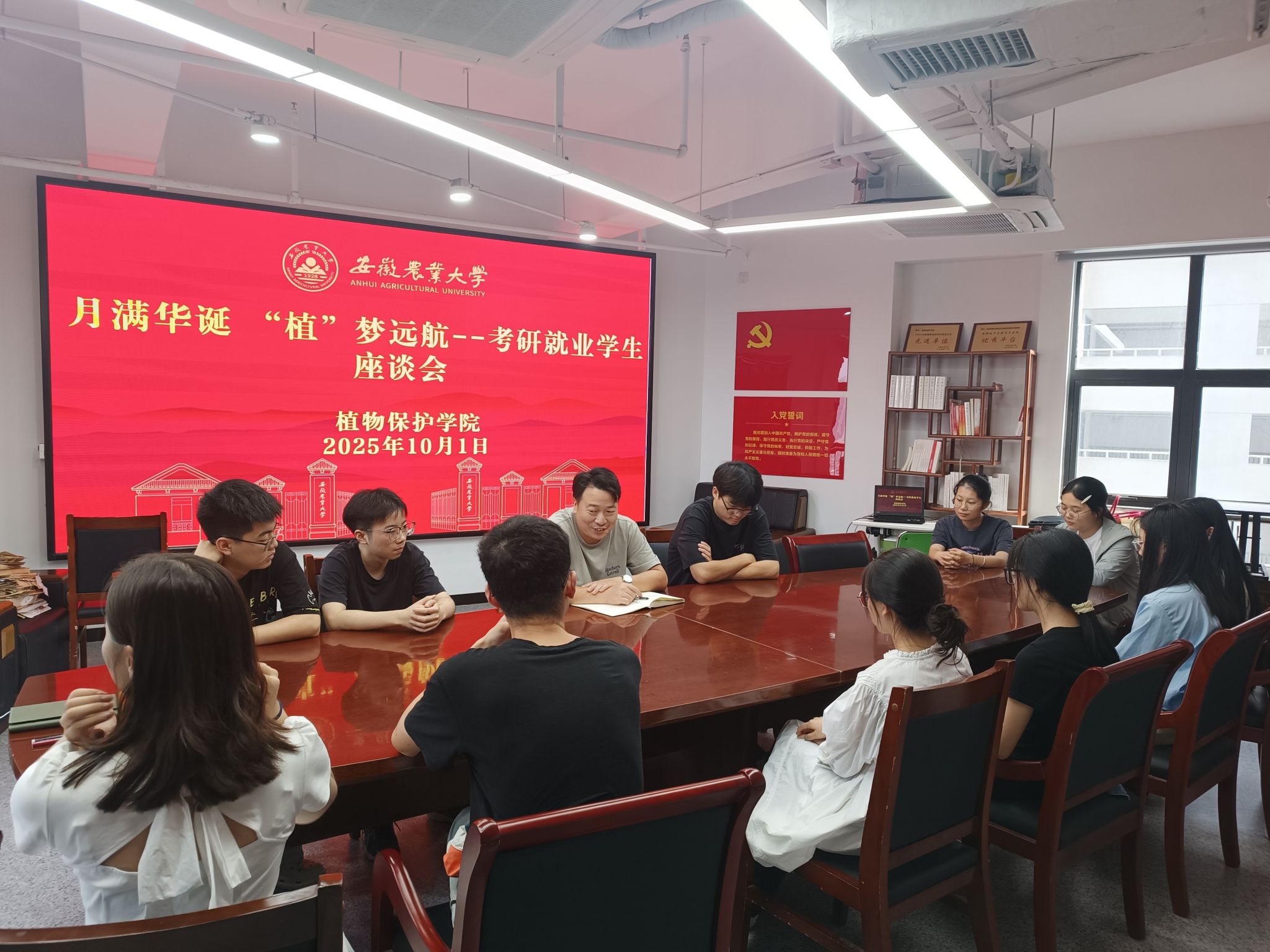 本网讯 在中秋佳节与国庆华诞双庆之际,为掌握本科毕业班学生近期思想动态,助力学子规划未来,递送学院关怀与温暖。10月1日下午,学院在1501室开展了“月满华诞,‘植’梦远航”为题的考研就业师生座谈会。