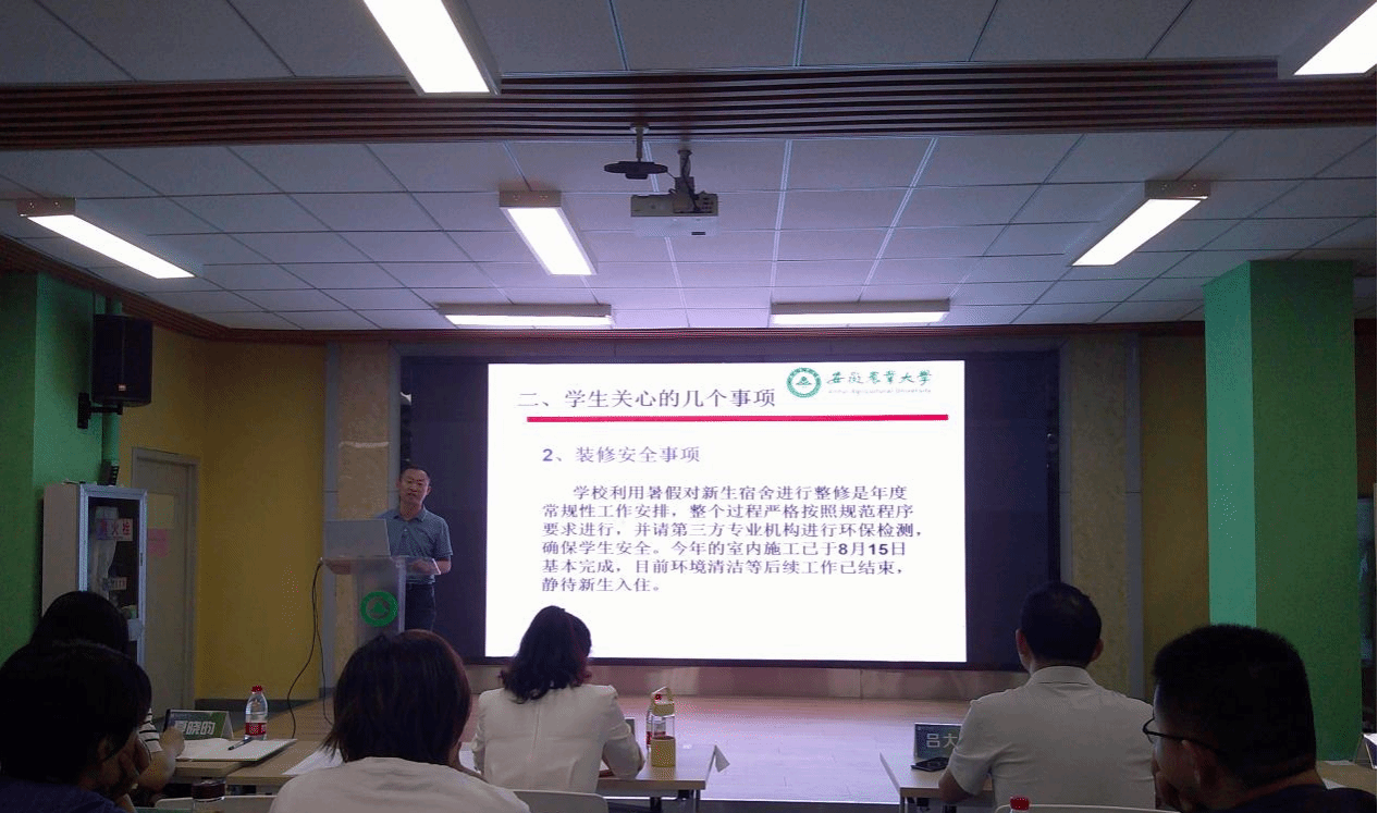 总务部副部长史青松根据国家相关政策的解读,围绕本校暑期总务相关工作进展、学生宿舍相关概况、师生关注的宿舍安全、各项事务讲解以及未来关于校内扩容、校外扩展的展望给我们进行了透彻的分析,旨在培养学生良好习惯为目标、积极开展关于学生内务的重大改革,不断增强师生的认同感、获得感和幸福感。