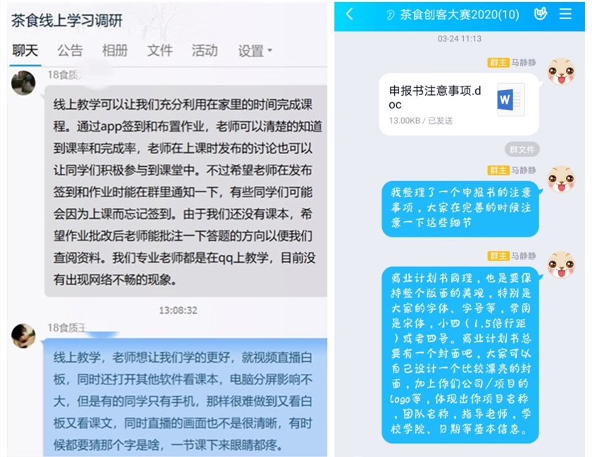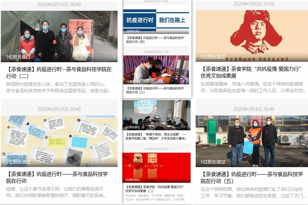 面对延长的假期,除了保障健康和安全,如何让大学生宅家不宅志,“疫”起上“好”课是她特别关注的话题。她牵头组建了“茶食线上学习调研群”,通过学生骨干们的反馈,及时了解到线上教学出现的问题、学生需求、网络设施等情况,力争让每位同学都获得好的学习体验,让学生身处家中也能感受到课堂的氛围,学有所获。同时她也积极做好网络辅导和心理疏导,认真摸排网络学习困难学生情况,制定帮扶方案,引导学生正确认识网络教学的必要性与重要性,引导学生遵守在线教学秩序;同时,结合学生实际情况积极做好线上教学、毕业生论文指导、就业信息发布、考研复试等工作。