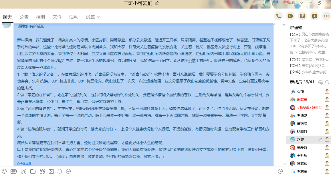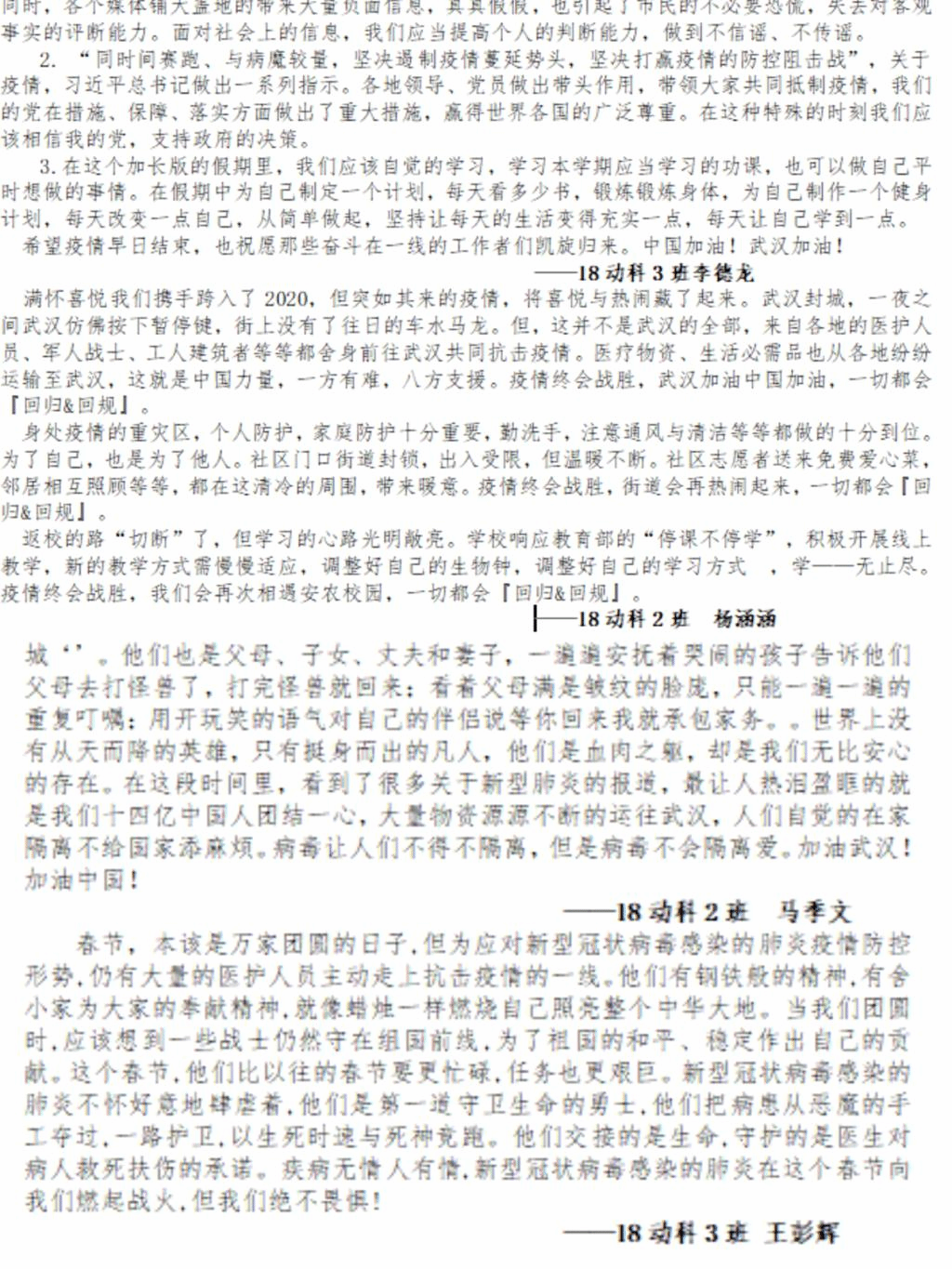 新冠肺炎疫情发生以来,动物科技学院坚持以学生为本,本着对学生生命安全、身体健康和成长成才高度负责的态度,通过积极的教育引导和思想引领,形成了师生携手、群防群控疫情的合力。以文字形式记录疫情期间感悟,提升学生们的家国情怀,引导学生敬畏自然、热爱生命、培养学生规范意识、规则意识。增强社会责任感和担当精神。