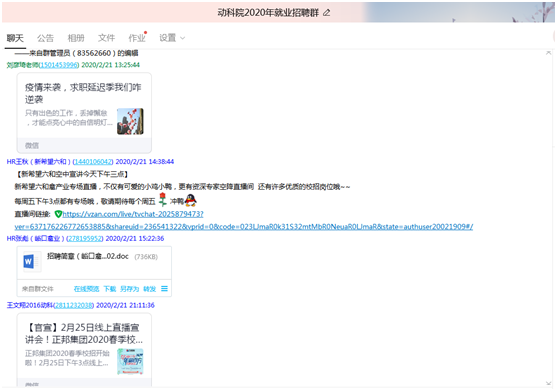 作为学院的就业联络员,刘彦琦老师为促进毕业生充分高质量就业,建立线上qq、微信群,其中qq群有用人单位45家,微信群有用人单位70家,共有368名毕业生入群,截止目前,已向毕业生推送就业招聘网站4个,共有40家企业发布了就业信息,空中宣讲招聘会10余场,推送招聘信息100余条,招聘岗位150余个。