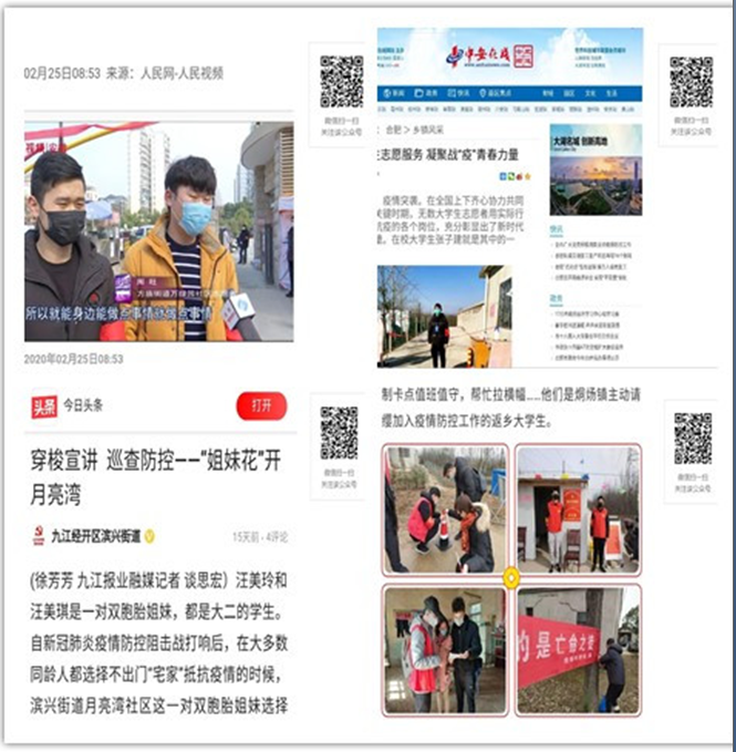为切实发挥朋辈教育、典型示范的力量。学院官微上推送了持续参与30天防控一线工作并写下入党申请书郭钊阳同学、转发“穿梭宣讲 巡查防控--姐妹花开月亮湾”的汪美琪同学、介绍家乡镇政府将表扬信邮寄给学校的沈安然同学,此外还有张子健、王思慧、周旺、郑梦如等15名同学志愿参与家乡抗“疫”一线防控工作的学生先进事迹。