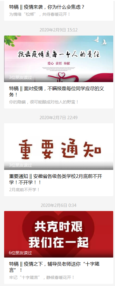 疫情发生后,工学院依托“耕读安农”省辅导员名师工作室项目,整合线上资源,突出以点带面,积极“网聚”学院辅导员抗疫正能量。以微信公众号为载体,强化思想引领,工作室推出《疫情之下,辅导员老师送你“十字箴言”》《面对疫情,不瞒报是每位同学应尽的义务》等11篇原创网文,累计阅读量突破10万次,点赞量近1000次,被高校思政网、中国教育干部网络学院等转载300余次,在全国辅导员、全校学生中间产生了较大反响。以微信群、QQ群为依托,搭建交流平台,学院辅导员组织开展线上知识竞赛,线上主题班会、主题团日活动,实现了班级全覆盖。 同时,针对上学期挂科科率较高的科目,学院辅导员组建4个学业辅导群,由任课教师开展线上学业辅导、专业答疑。针对毕业班就业考研,学院辅导员组建2个考研调剂、就业信息发布群,每天推送相关信息,帮助毕业生顺利升学就业。以易班在线为平台,提升工作实效,针对学生“宅”家无聊的实际,工作室推出生活小技能微视频5期,深受学生欢迎。