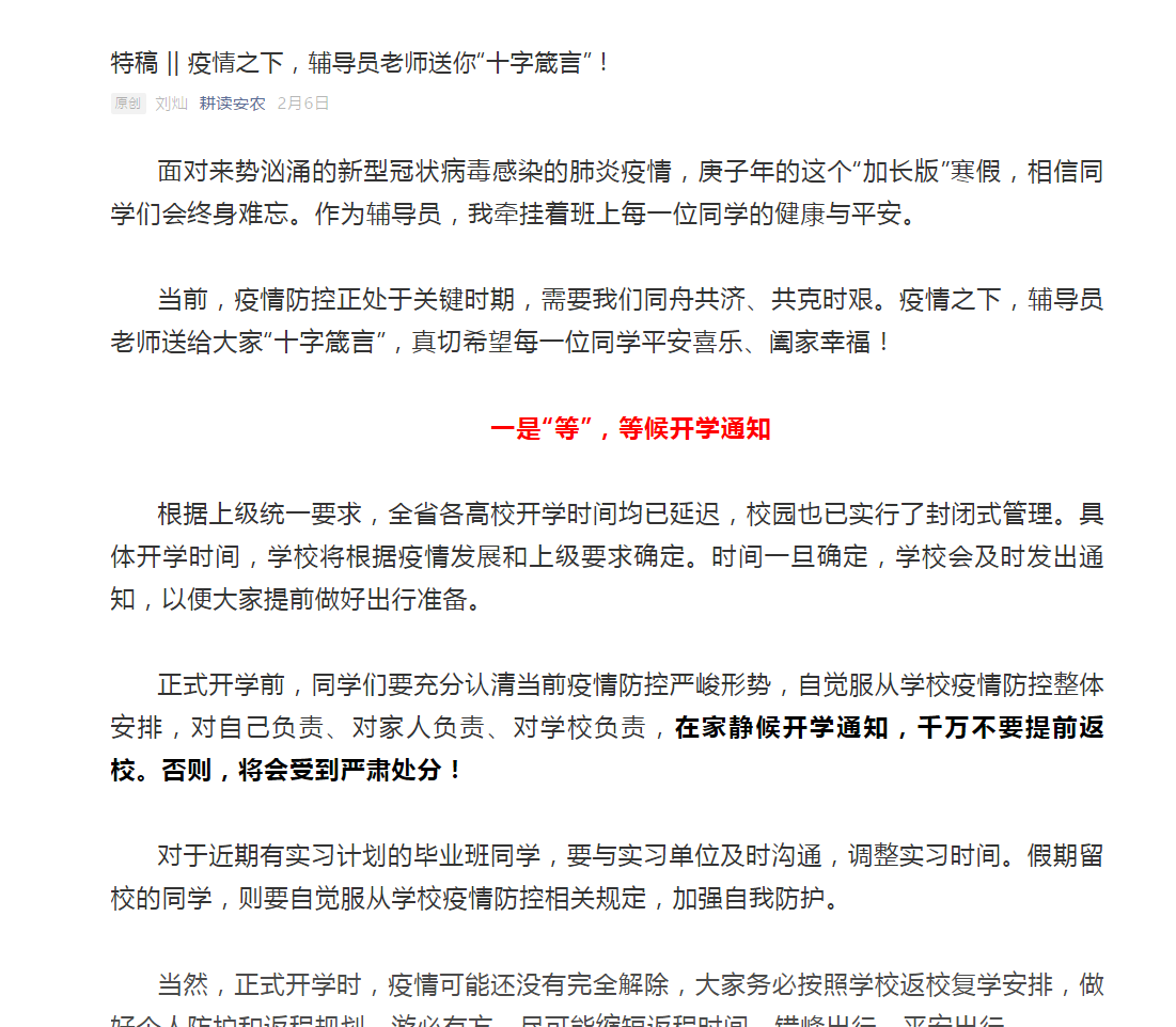 编者按:自新型冠状肺炎疫情发生以来,我校学工系统迅速行动,多措并举、精准施策,不间断向学生传递学校的关怀与温暖,不间断开展积极有效的教育和沟通。这里有一支特别有责任讲奉献、懂学生爱学生的辅导员队伍,他们在信息精准摸排、宣传教育、思想引领、心理疏导及网络学习等方面做了大量细致的工作,切实保障了广大学生的身体健康和校园安全稳定。为进一步凝聚力量、发挥作用,不断增强辅导员的使命感和荣誉感,展示我校辅导员积极抗“疫”群体画像,近期,学工部联合学院围绕以下五个专题陆续推出辅导员在疫情防控中教育学生、关爱学生、团结学生、依靠学生、的真实故事。