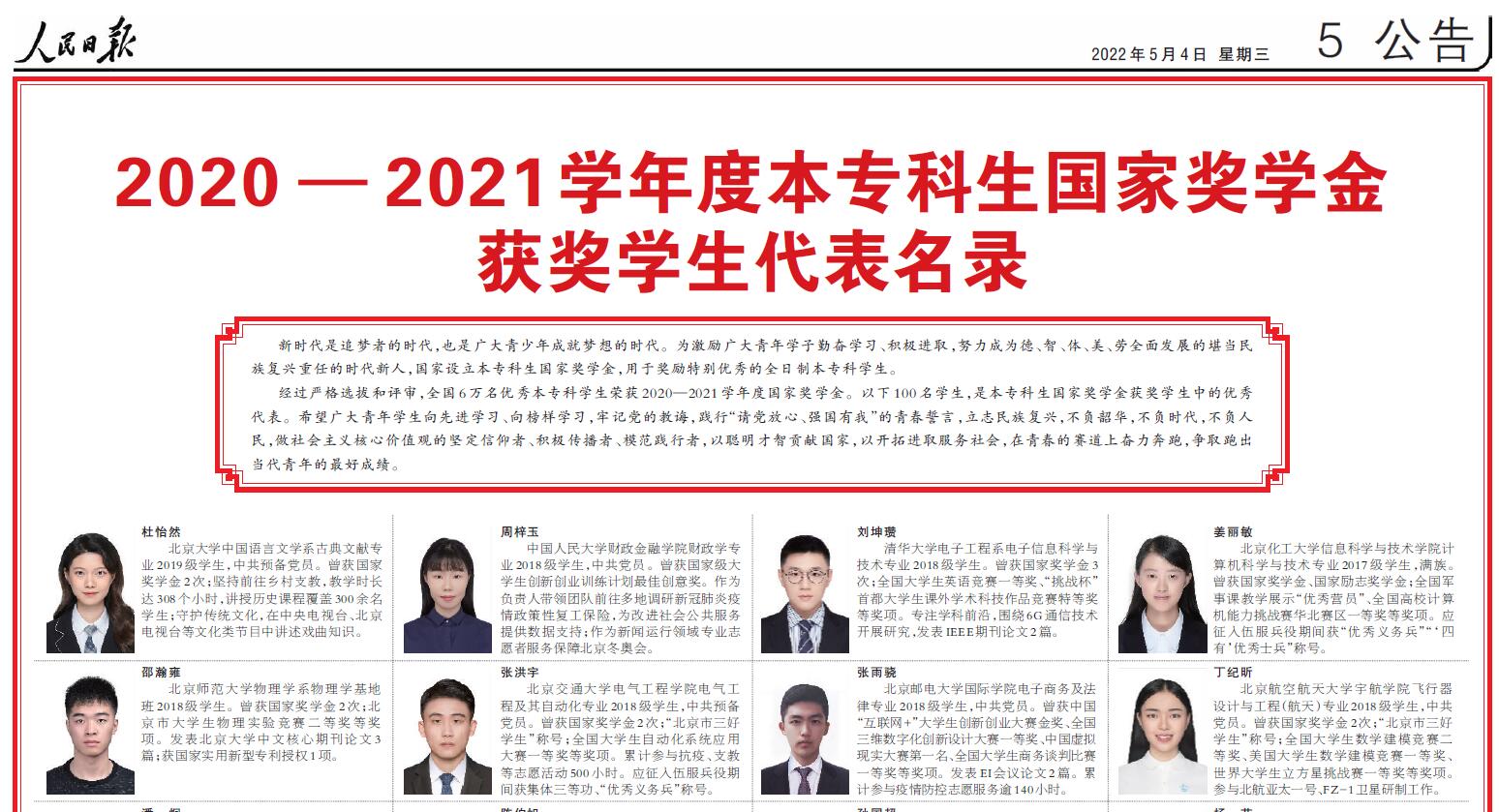 本网讯 5月4日,《人民日报》(2022年05月04日第五、第六版)刊发了《2020-2021学年度本专科生国家奖学金获奖学生代表名录》,名录中展示的100名学生是全国6万名荣获2020-2021学年度国家奖学金本专科学生中的优秀代表。我校吴轶祺同学是安徽省本专科高校唯一入选的获奖代表,这也是我校学子在近三年内的第二次入选。