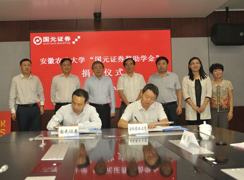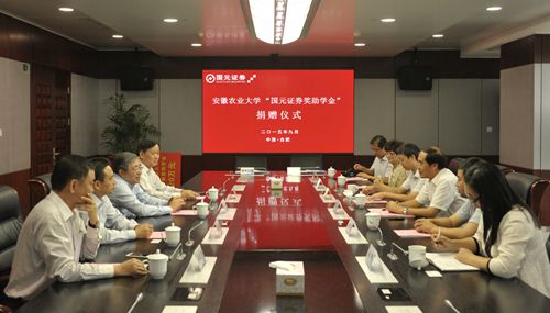 本网讯 9月29日上午,安徽农业大学“国元证券奖助学金”捐赠签字仪式在国元证券股份有限公司举行。公司党委书记、董事长蔡咏,监事会主席朱楚恒,党群办公室主任李克木,我校党委副书记李恩年及校监察室、财务处、学生处等部门负责同志参加了签字仪式。捐赠签字仪式由国元证券党委副书记、纪委书记蒋希敏主持。