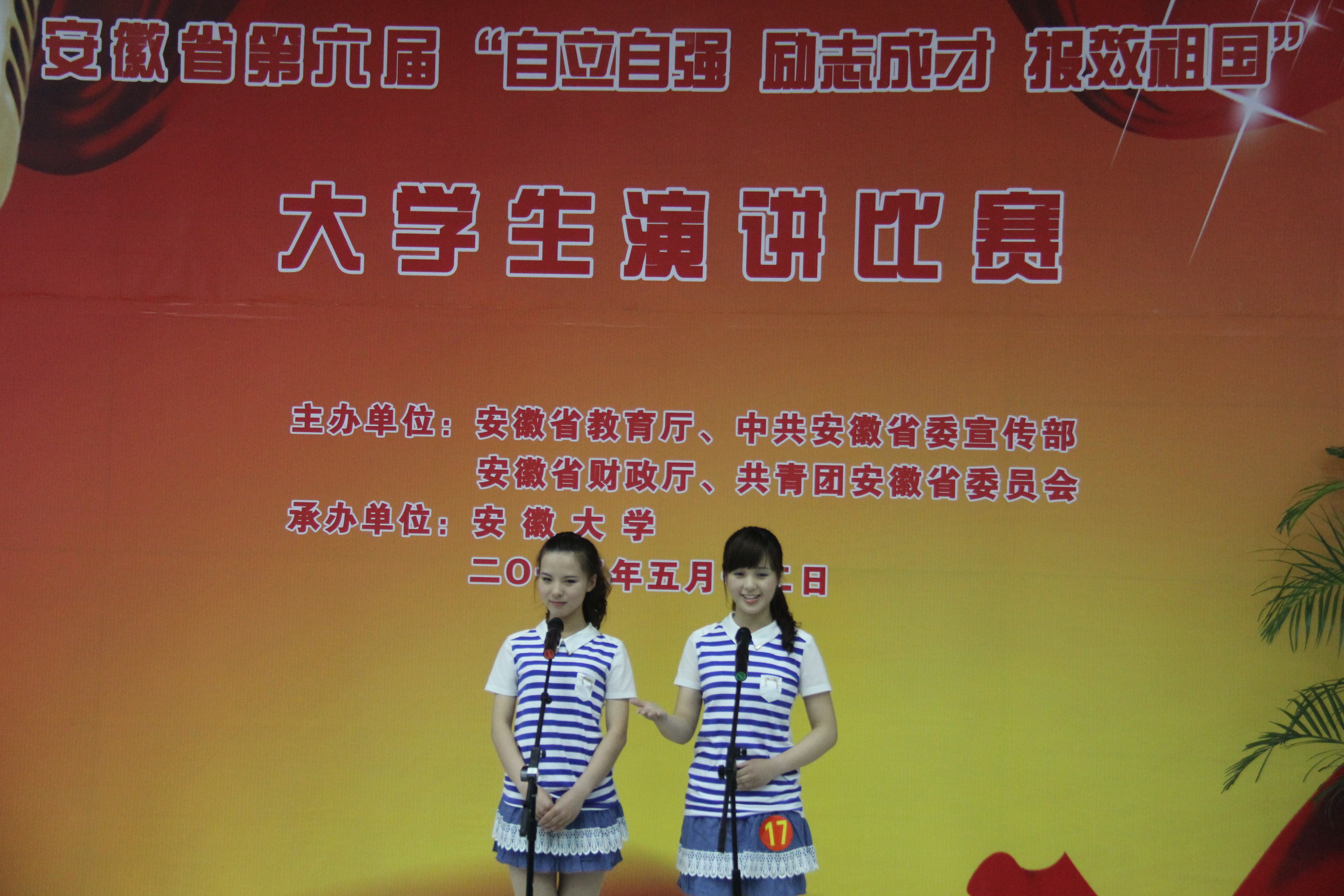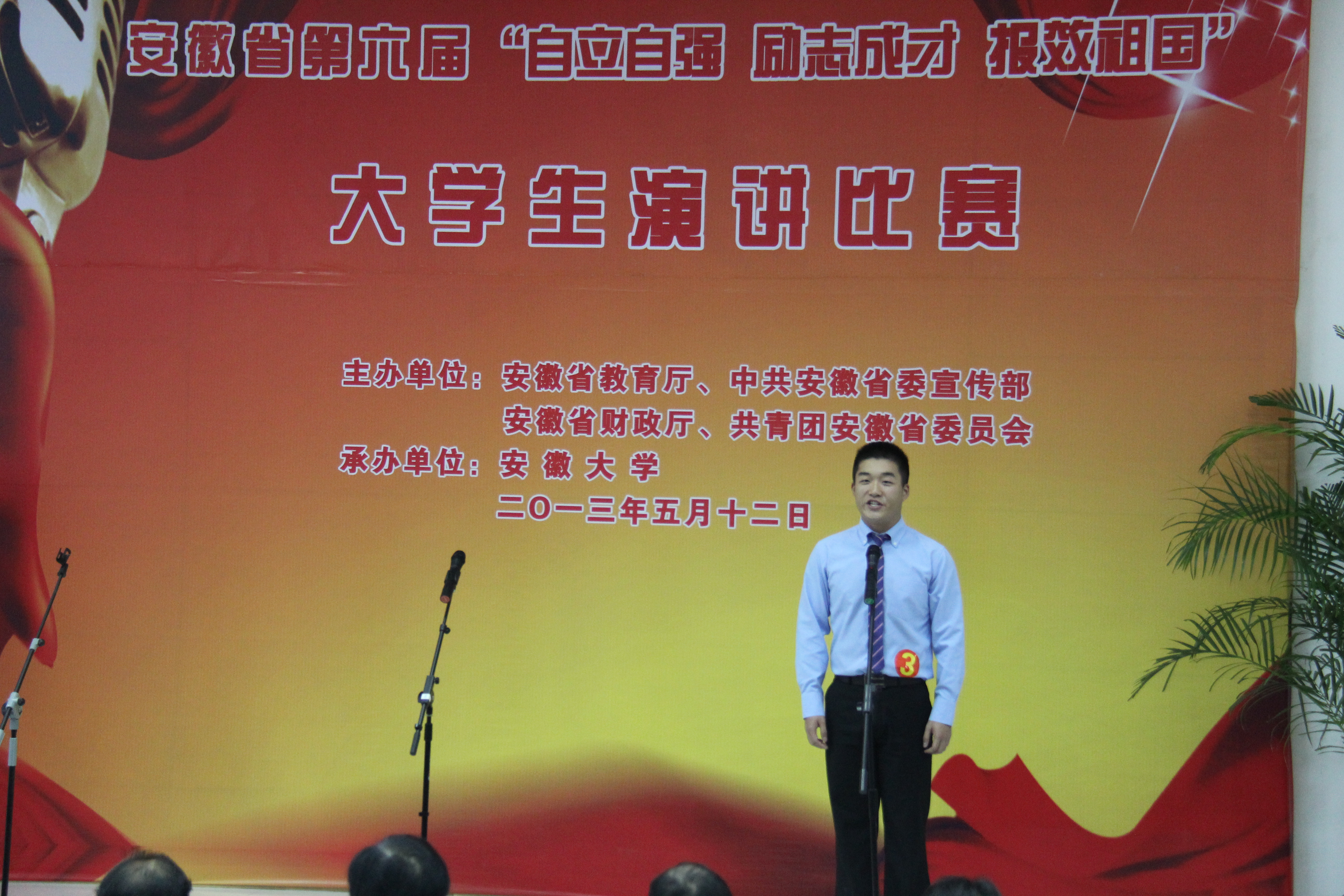 5月12日,由省教育厅、省委宣传部、省财政厅、团省委联合主办的第六届安徽省大学生“自立自强 励志成才 报效祖国”演讲比赛决赛在安徽大学圆满结束。本届演讲比赛共有全省109所高校的247名选手参加,比赛分为半决赛和决赛,4月28日全省分三个片区同时开展了半决赛比赛,我校选送的2010级园林董柳岑、2011级财务管理李雪的《二十万个台阶的承诺》和2010级电气工程及其自动化俞凡的《我的梦,中国梦!》两组都顺利进入决赛。决赛中,我校两组选手发挥出色,分获一等奖和二等奖,同时我校也喜获优秀组织奖。(学生处:周涛)