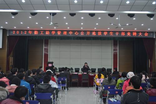 12月13日晚,校勤工助学管理中心第十一届主要学生干部竞聘大会在欣苑餐厅四楼学生活动中心多功能厅举行。校学生处副处长王琼及学生处相关老师作为评委出席了会议,校勤工助学管理中心全体成员参加了大会。