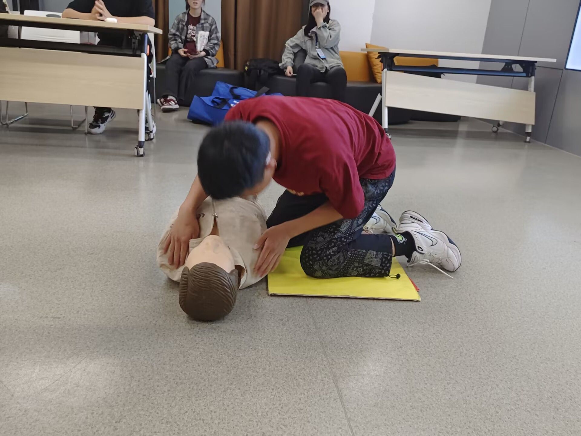 何立新作为安徽省健康服务业协会公共急救分会第一届委员会常务委员、安徽省红十字会培训中心授课教师有着非常丰富的急救经验。本次授课主要围绕心脏骤停、食道异物堵塞、中暑、烧伤、烫伤等情景讲授相关急救知识,重点讲授徒手心肺复苏的全过程及操作要领,急救过程中如何清理口腔异物,人工呼吸、胸外按压等急救规范动作,现场利用人体模型进行模拟急救实操。何老师还与同学们深入互动,让同学们上台进行徒手心肺复苏“实战”演练,从环境评估到胸外按压再到人工呼吸,何老师在旁边细心指正,严格按照标淮步骤与动作,让同学们切实掌握实操技能。