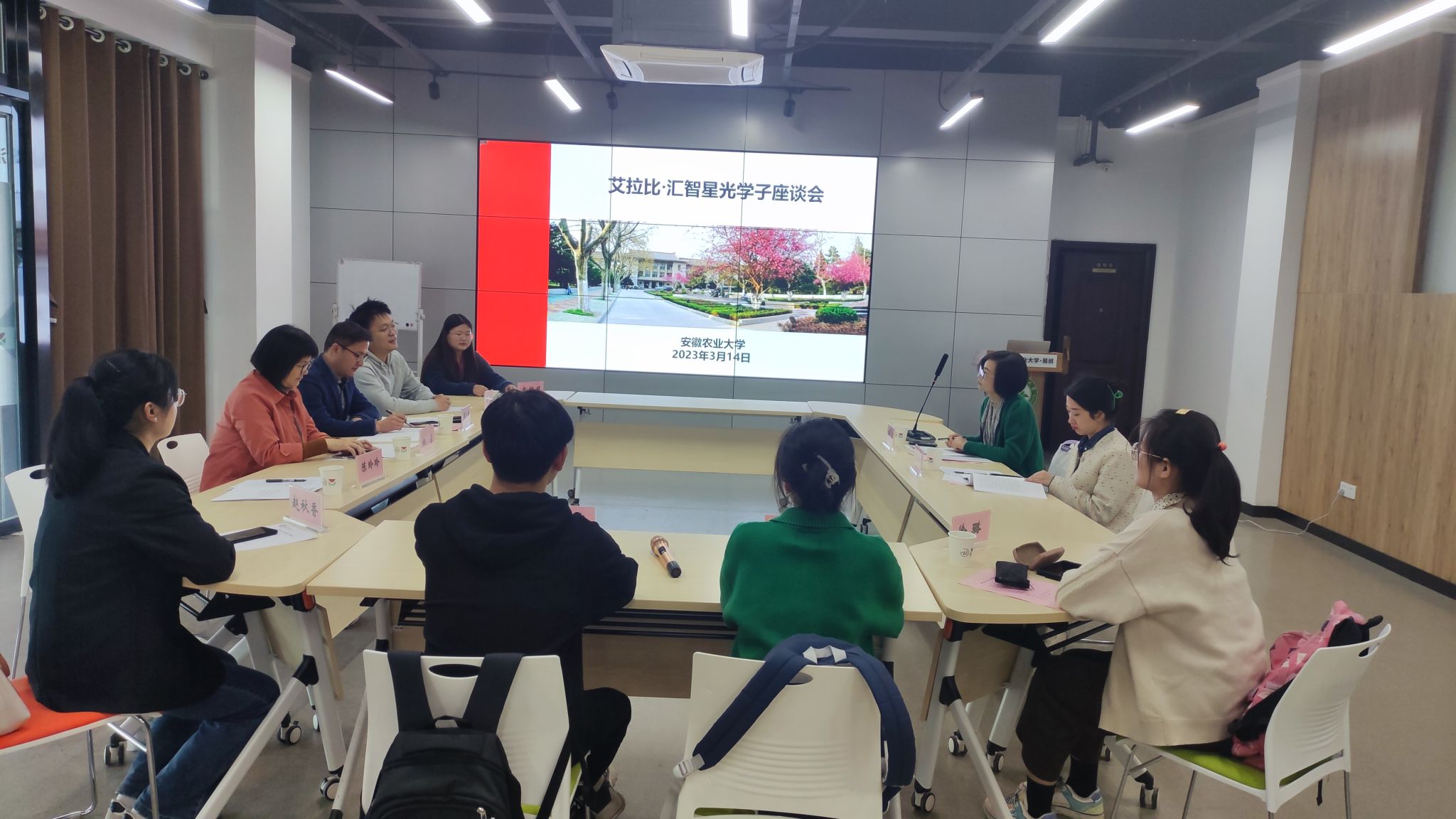 本网讯 3月14日上午,我校“艾拉比·汇智星光”受资助学子座谈会在易班发展中心举行。上海艾拉比智能科技有限公司副总裁李辛,艾拉比公司合肥分公司人事专员斯妍妍,校学工部(处)处长姚莉,副处长、学生资助管理中心主任周涛和受资助学生代表参加了交流会。