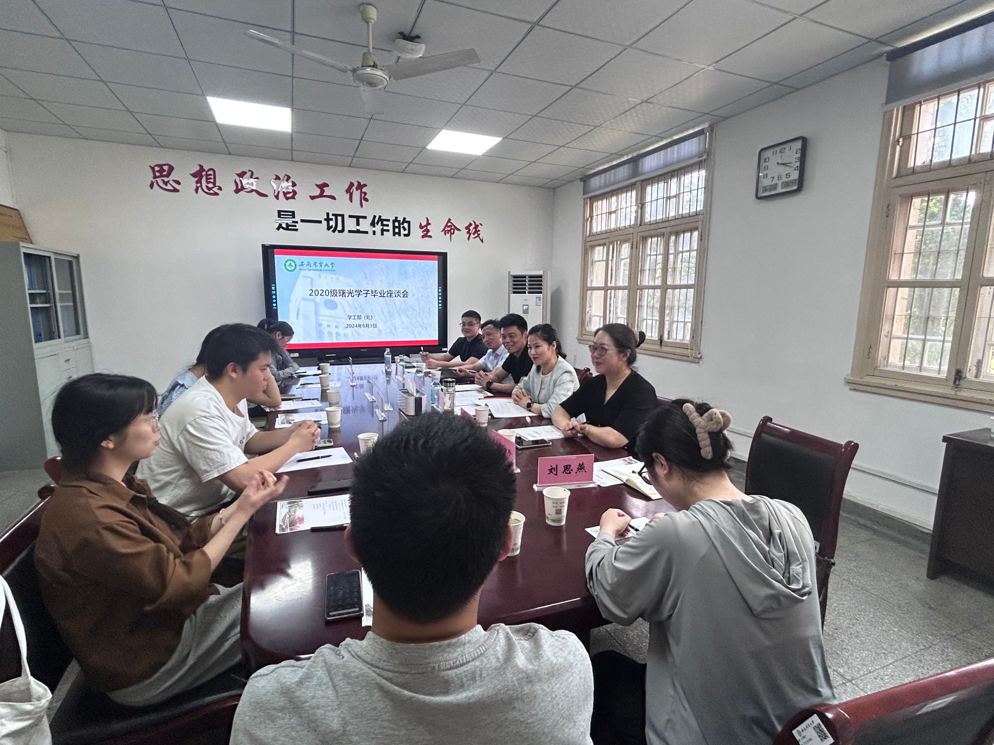 本网讯 6月3日下午,2024届曙光学子毕业座谈会在校学生处会议室举行。百胜餐饮(安徽)有限公司公共事务部经理许勇、副经理宁向尚,校党委学工部(处)处长任琪、2024届和往届曙光学子代表参加了活动。