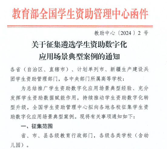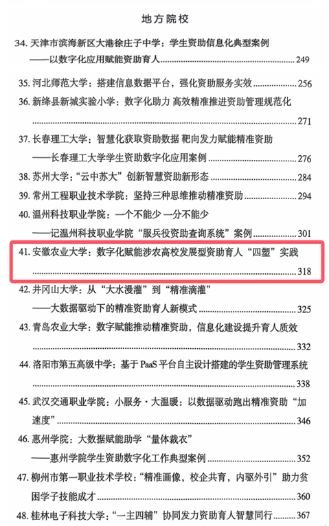 本网讯 近日,由教育部全国学生资助管理中心组织的“全国学生资助数字化应用场景典型案例”遴选结果公布,全国共53个经典案例入选,其中省市(县)案例20个,中央高校案例13个,地方高校案例11个,职业院校案例4个,中小学幼儿园案例5个。我校推送的《数字化赋能涉农高校发展型资助育人“四塑”实践》学生资助工作案例成功入选,这是安徽省首次且唯一入选的高校学生资助工作案例。