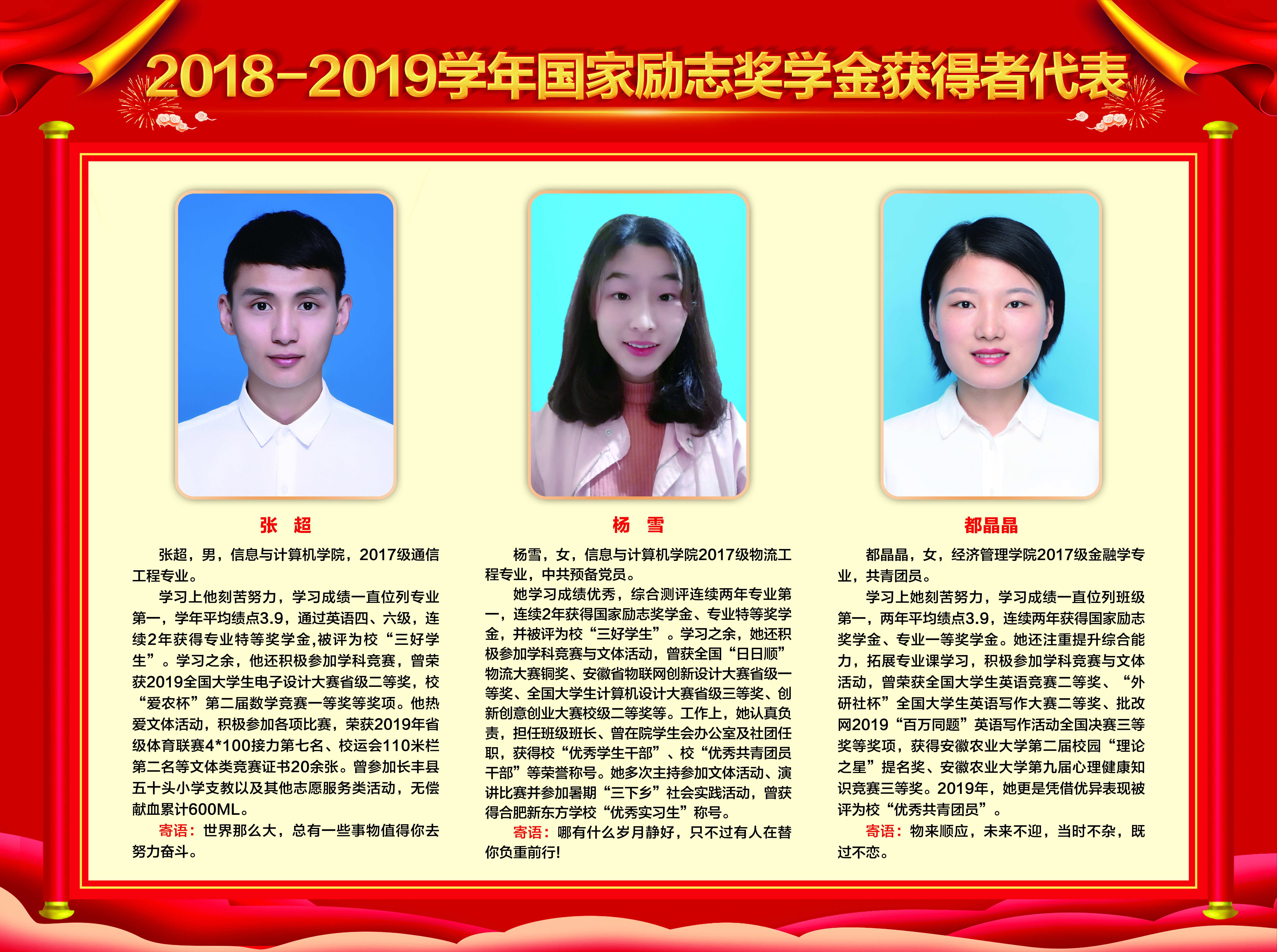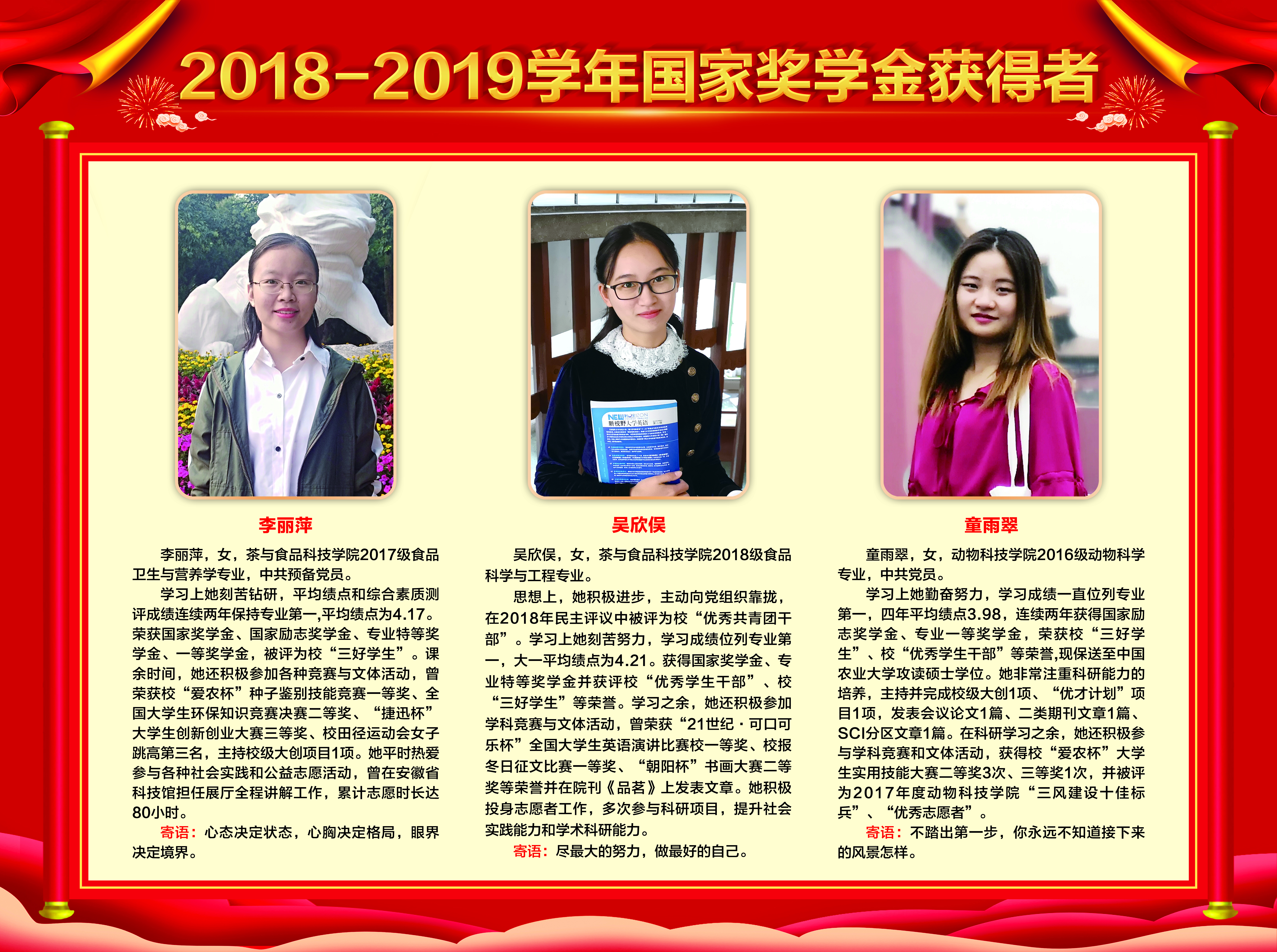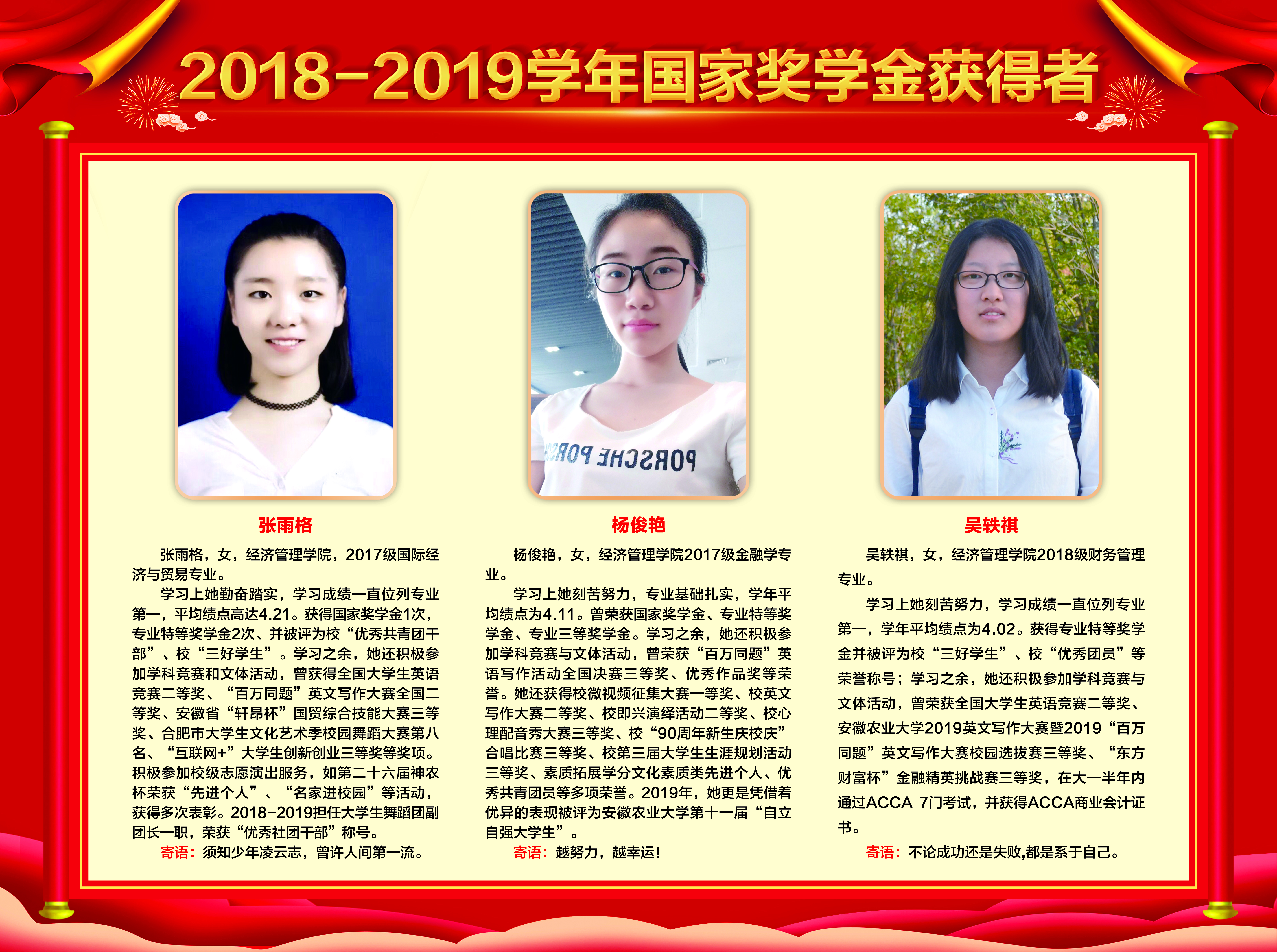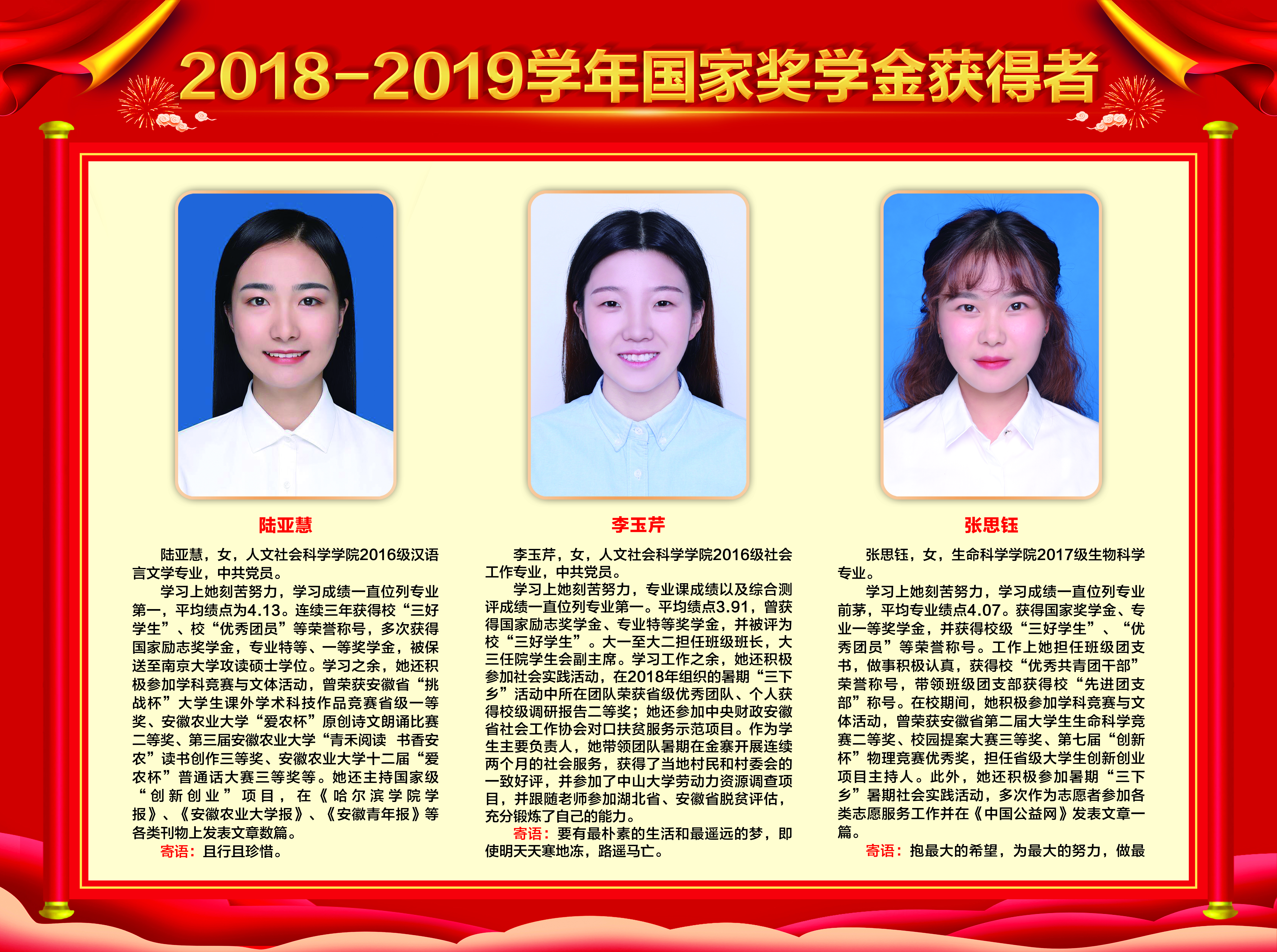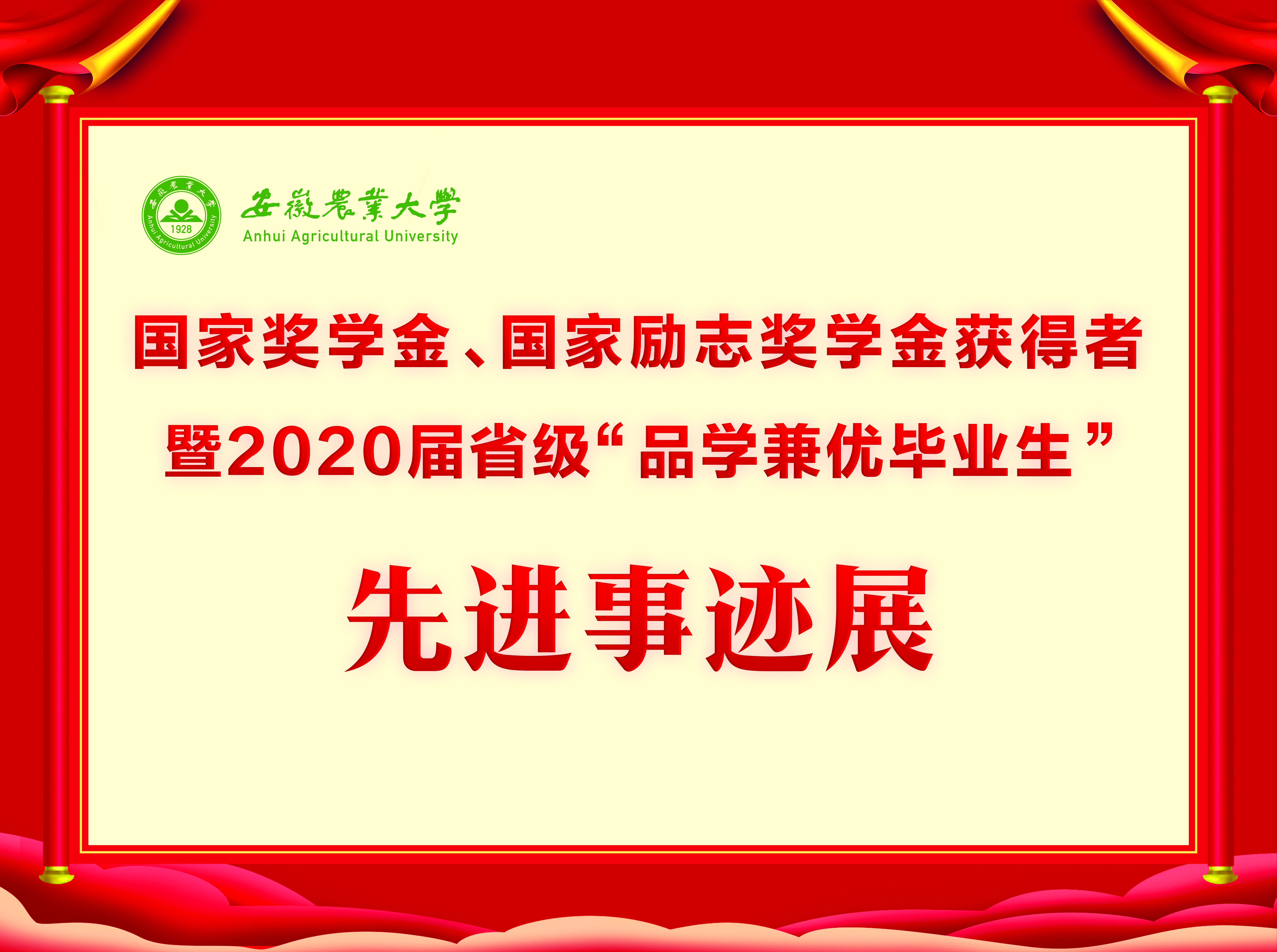 上一条:2019-2020学年国家奖学金、励志奖学金获得者代表暨2021届省级优秀毕业生风采展 下一条:安徽农业大学2017-2018学年国家奖学金、国家励志奖学金暨第十一届“自立自强大学生”风采展