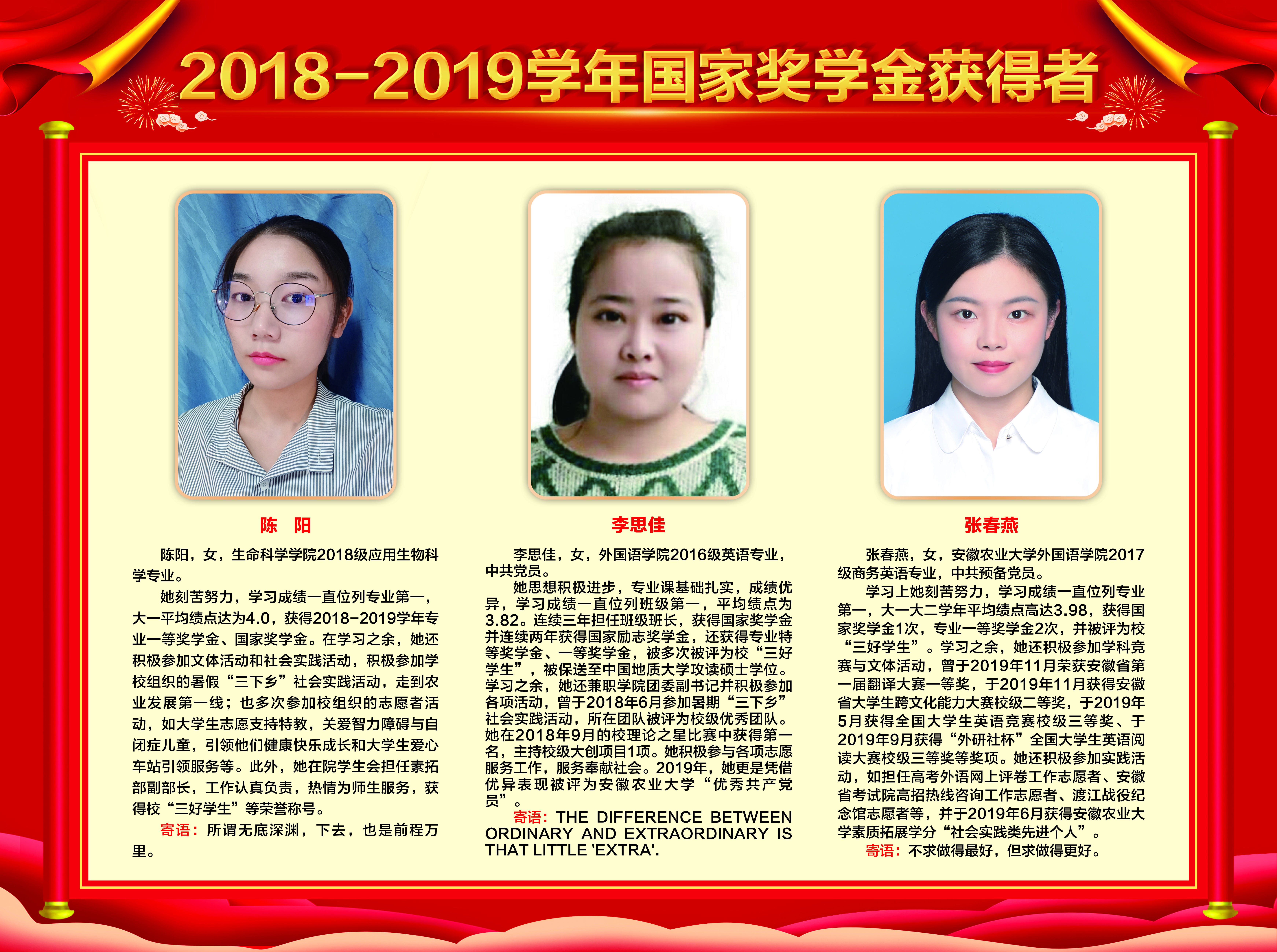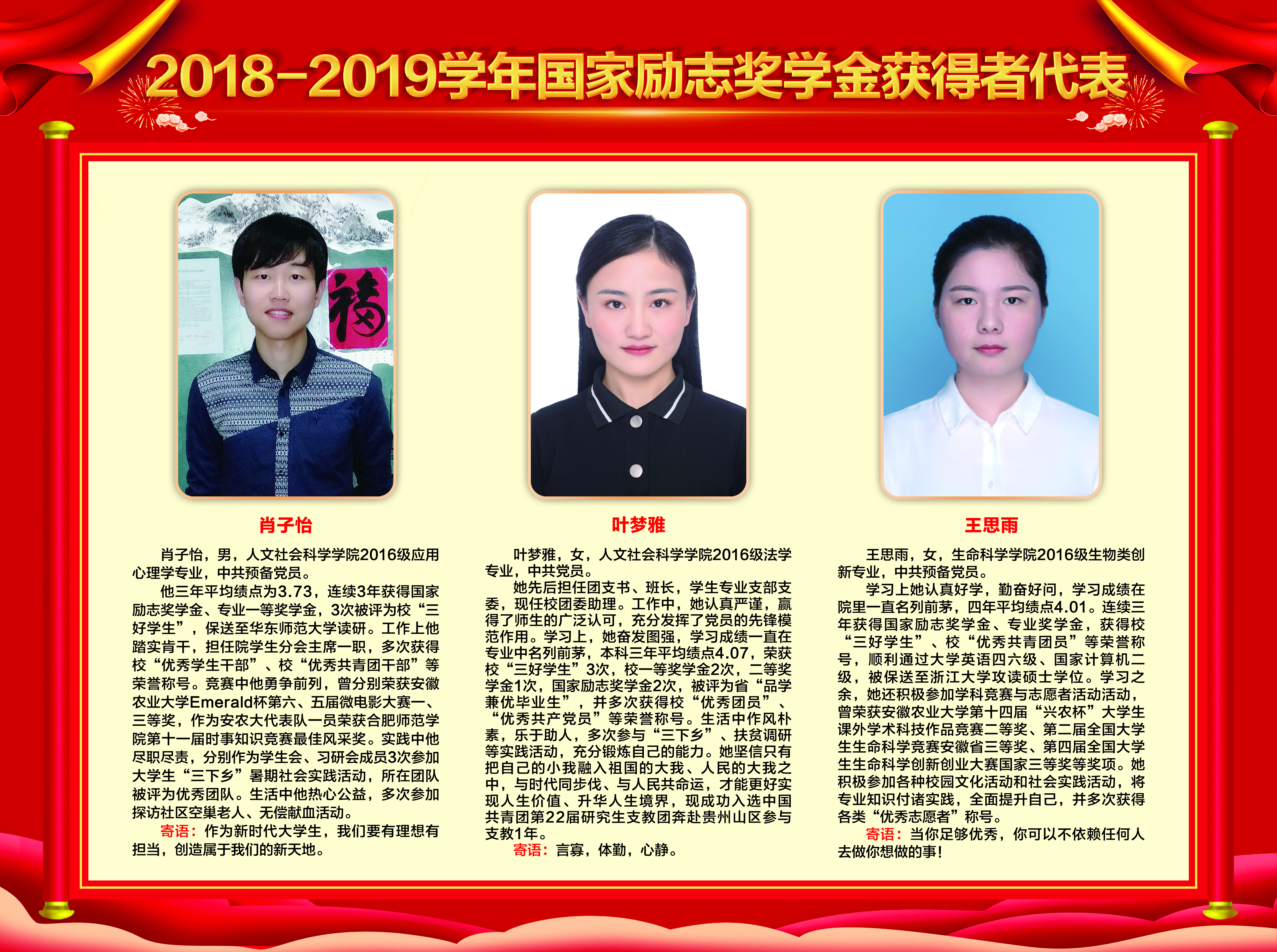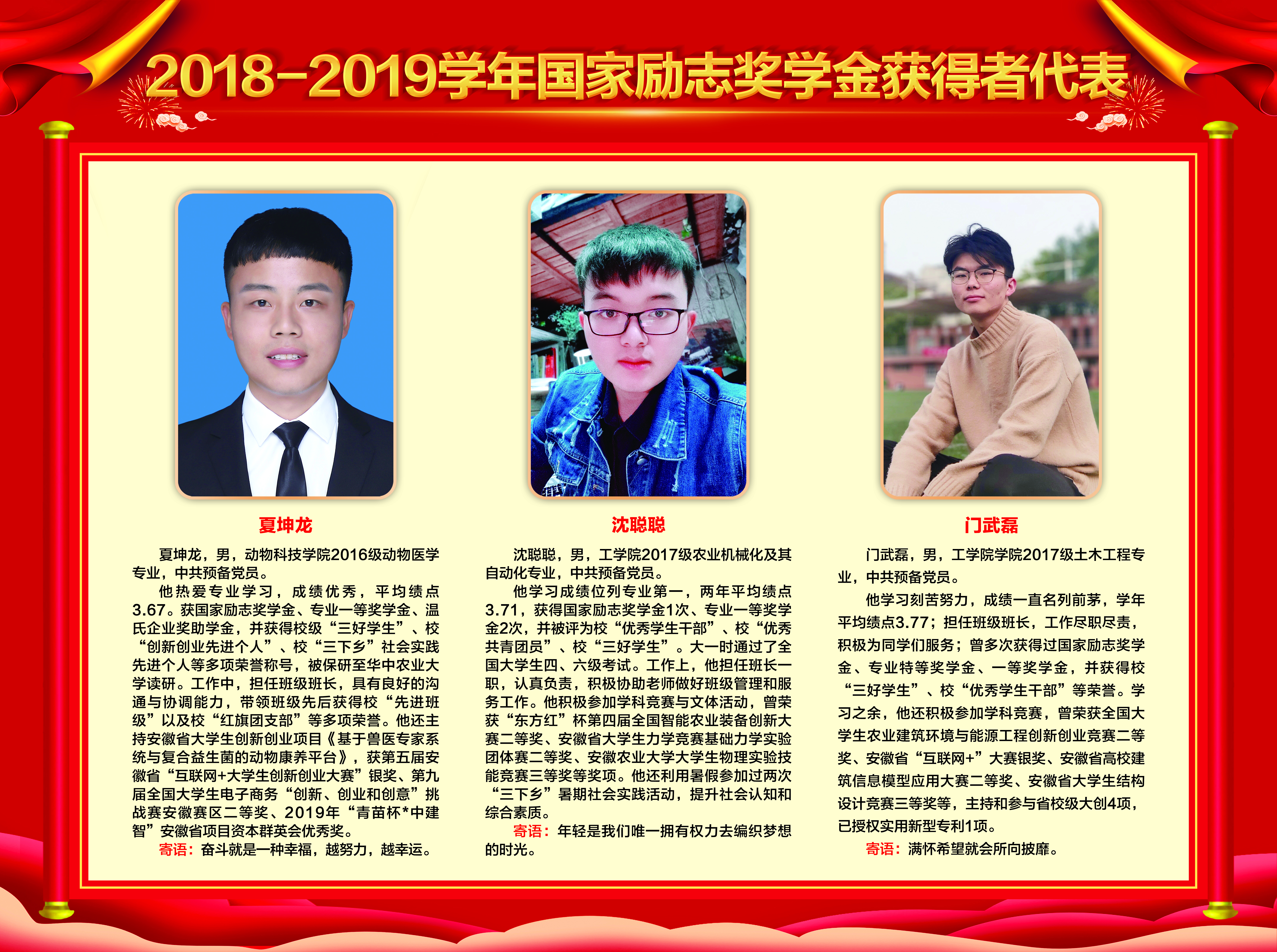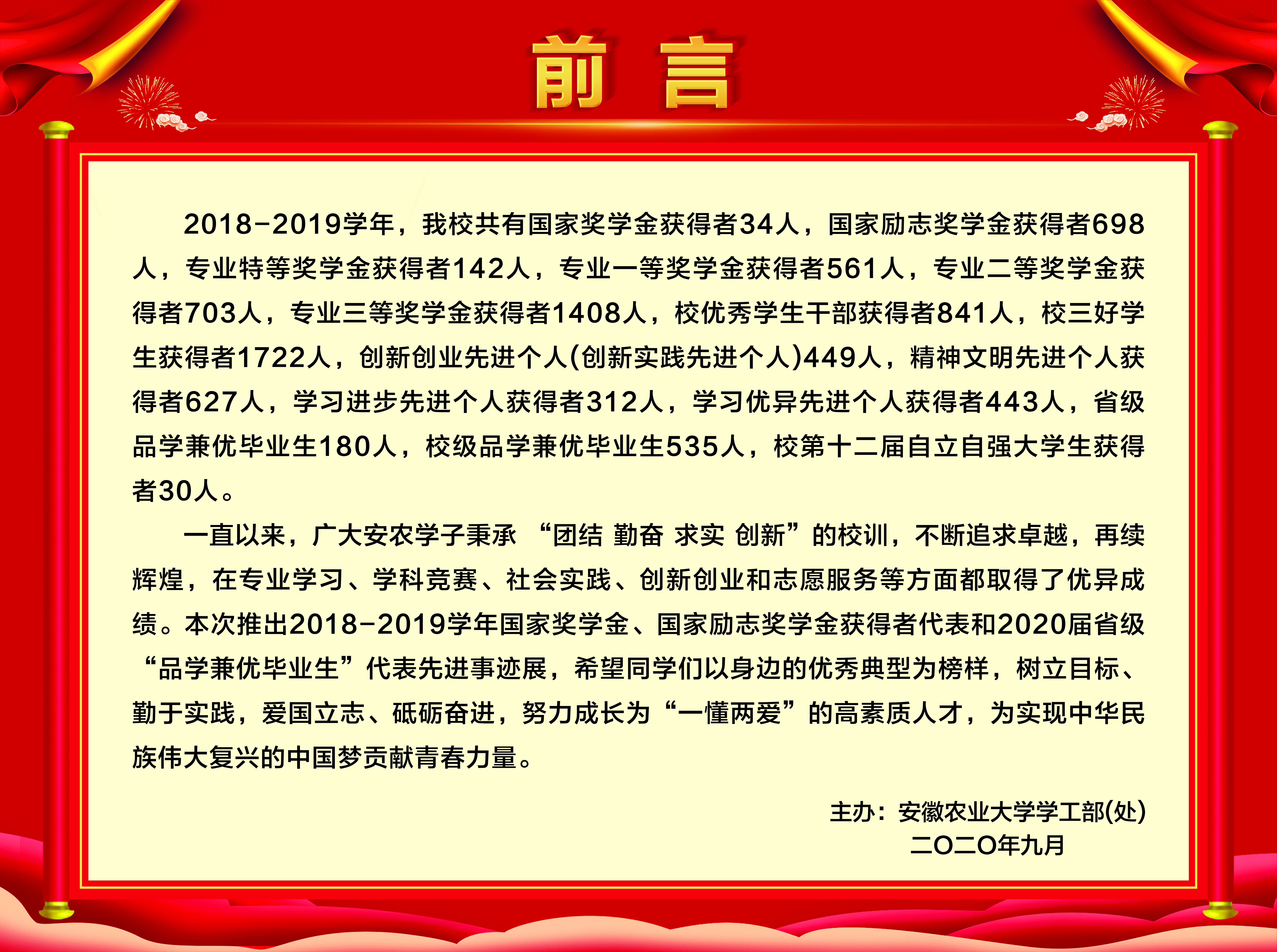 上一条:2019-2020学年国家奖学金、励志奖学金获得者代表暨2021届省级优秀毕业生风采展 下一条:安徽农业大学2017-2018学年国家奖学金、国家励志奖学金暨第十一届“自立自强大学生”风采展