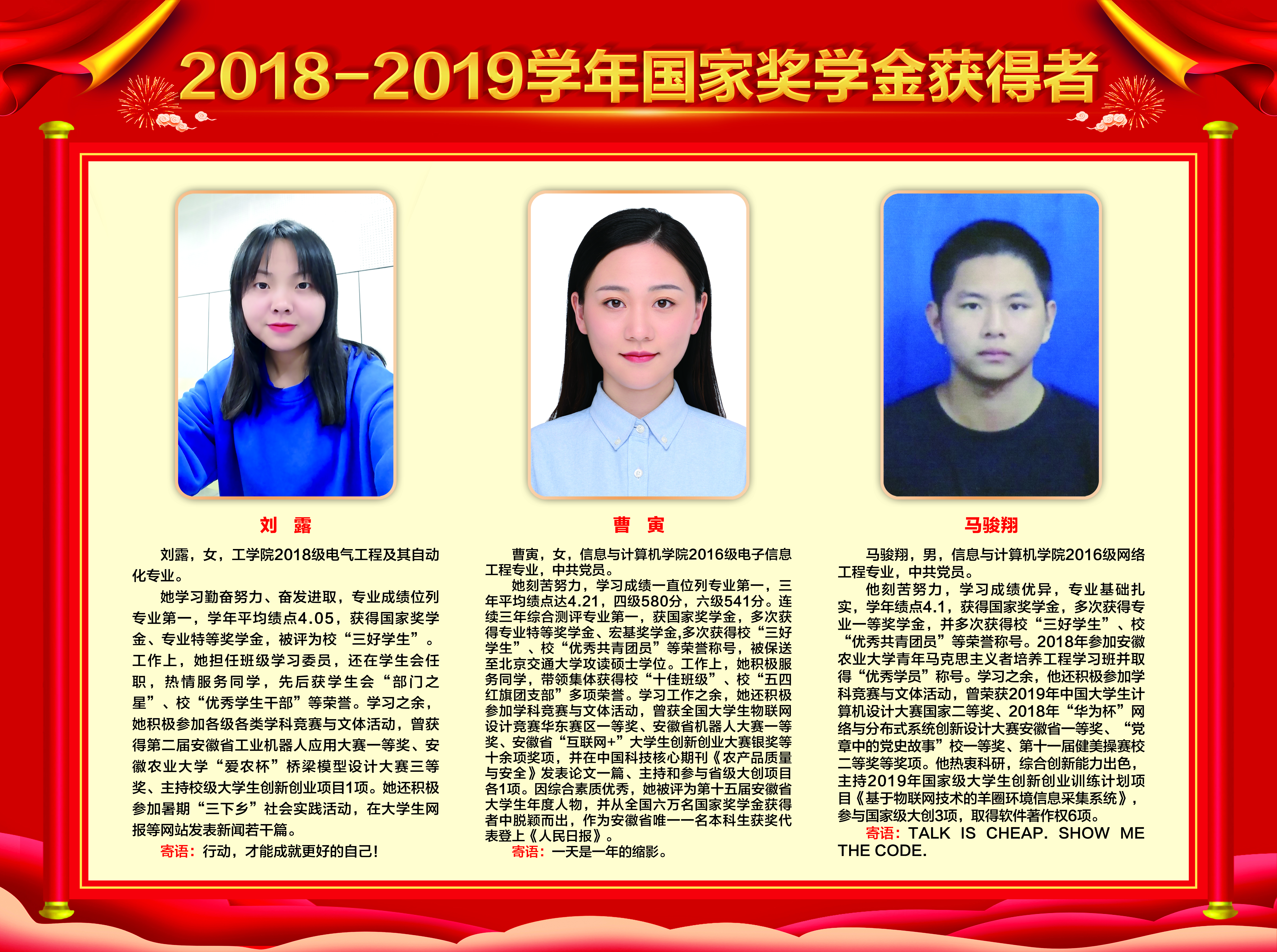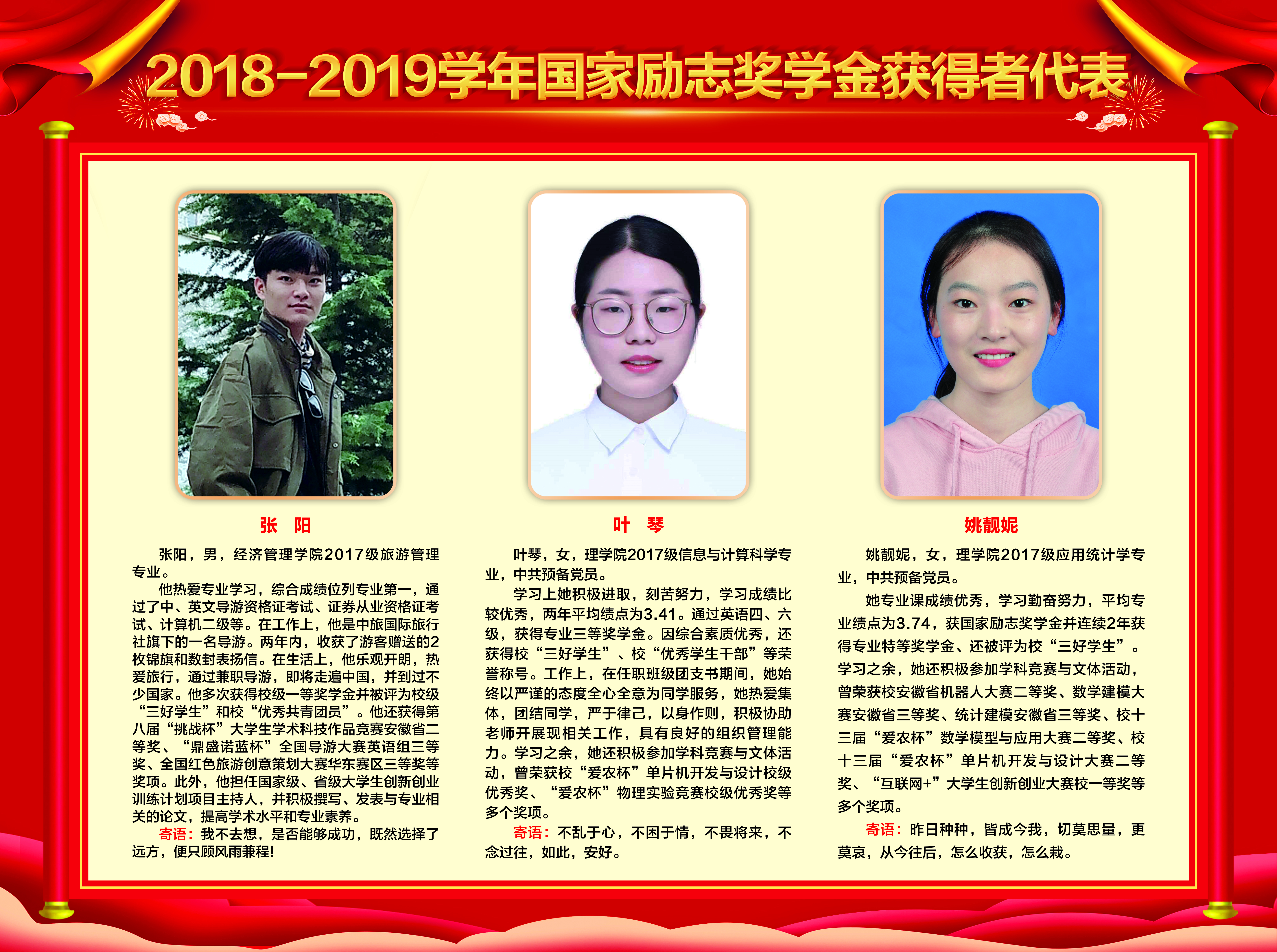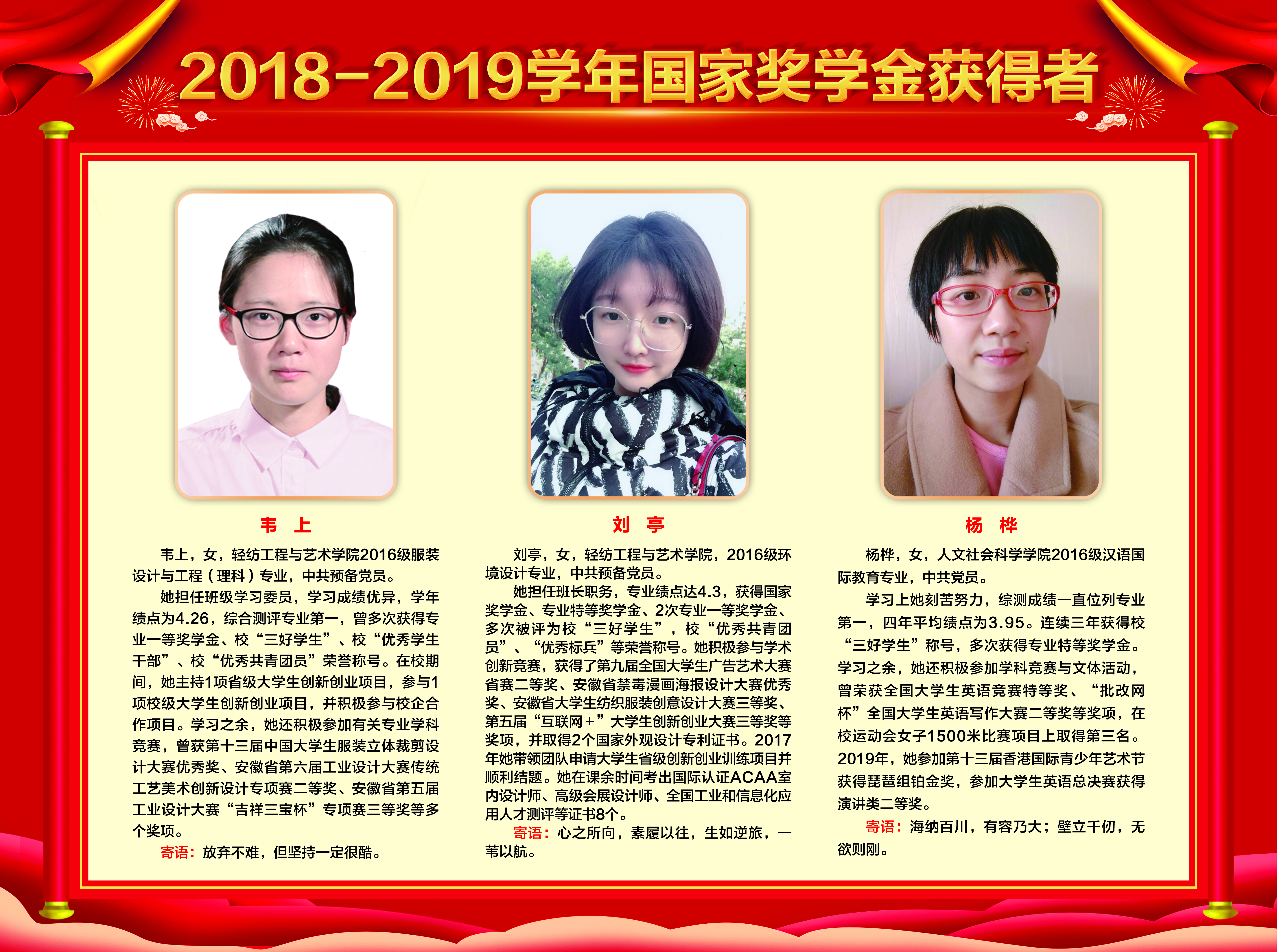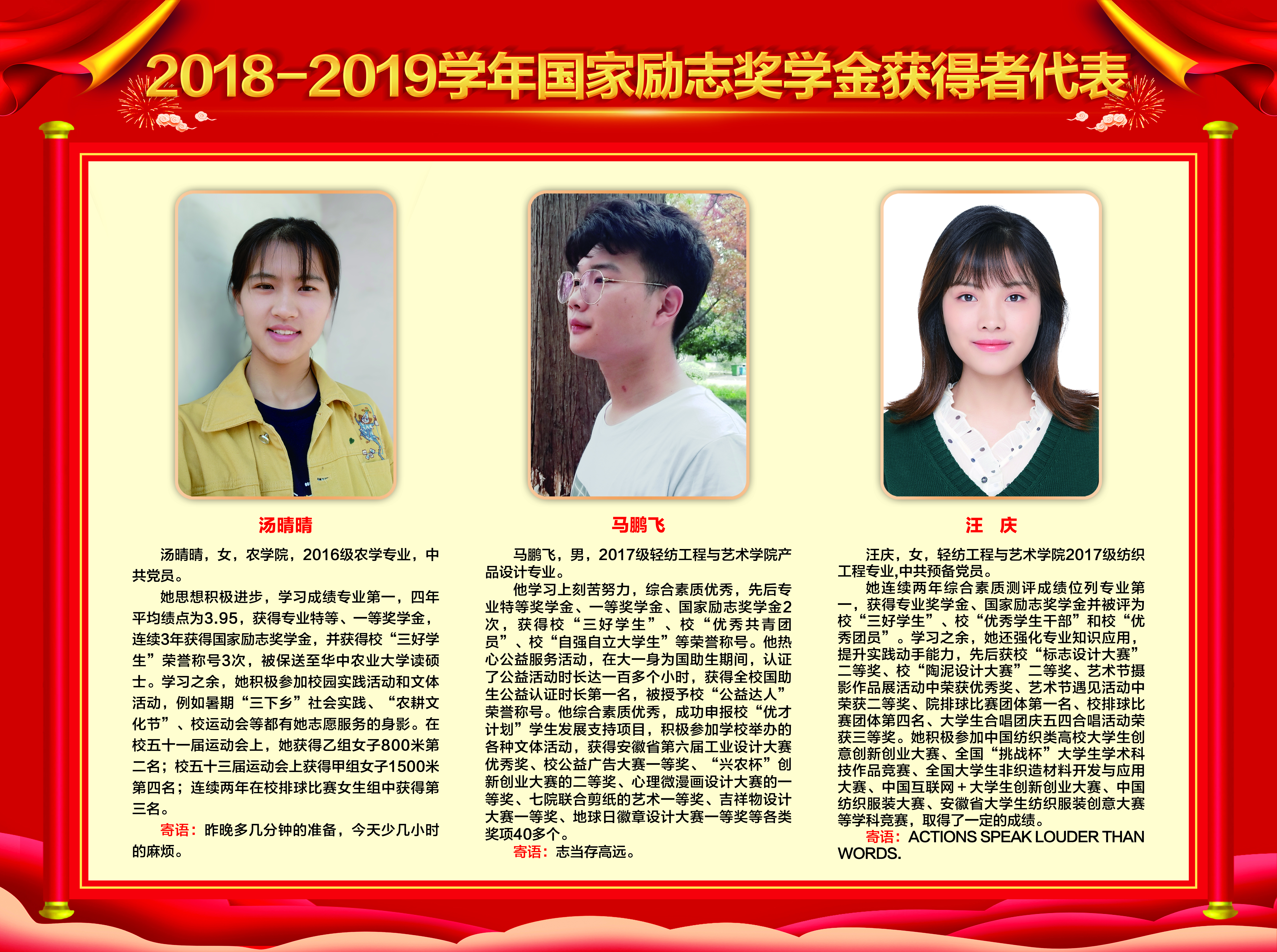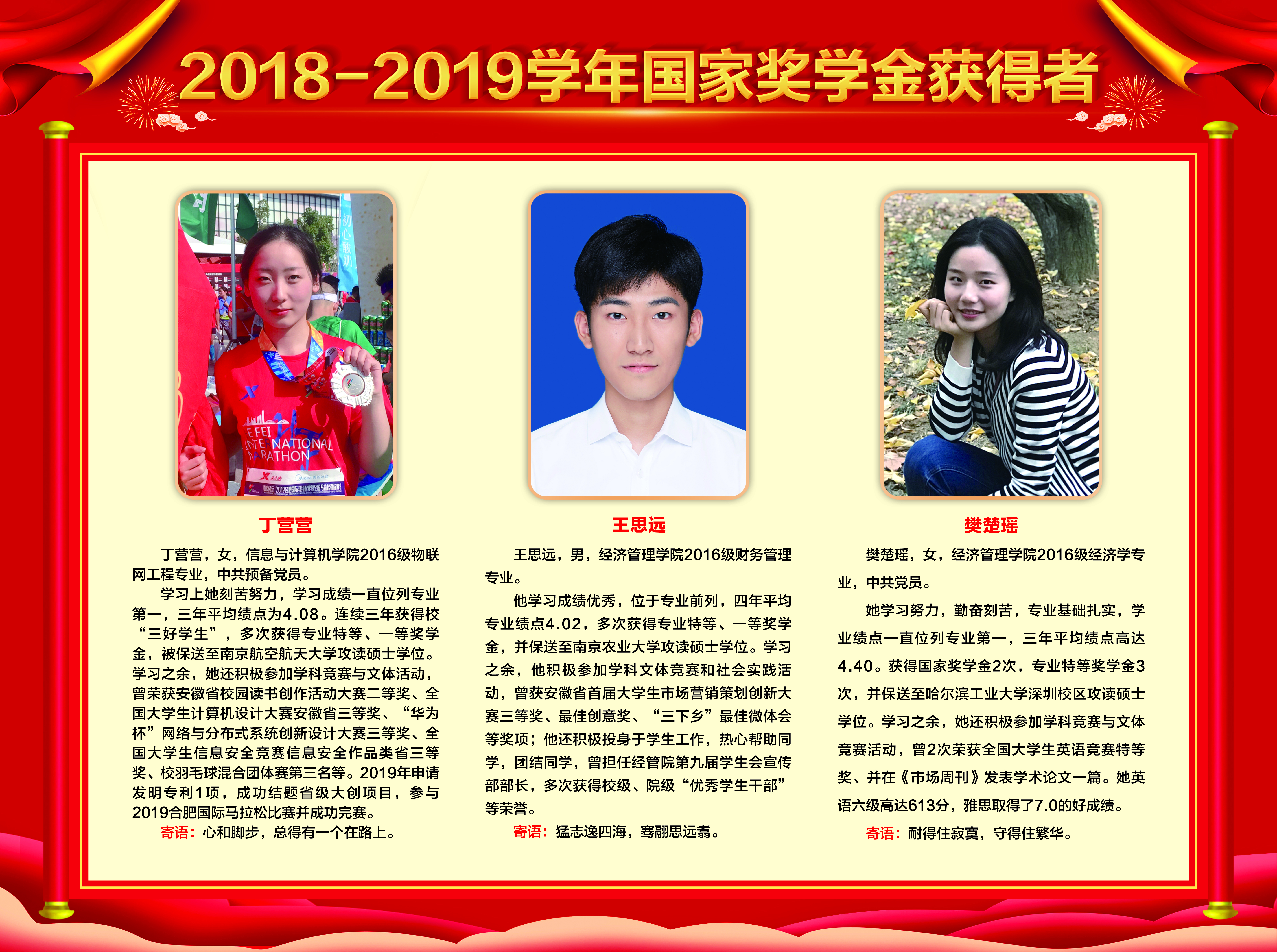 上一条:2019-2020学年国家奖学金、励志奖学金获得者代表暨2021届省级优秀毕业生风采展 下一条:安徽农业大学2017-2018学年国家奖学金、国家励志奖学金暨第十一届“自立自强大学生”风采展