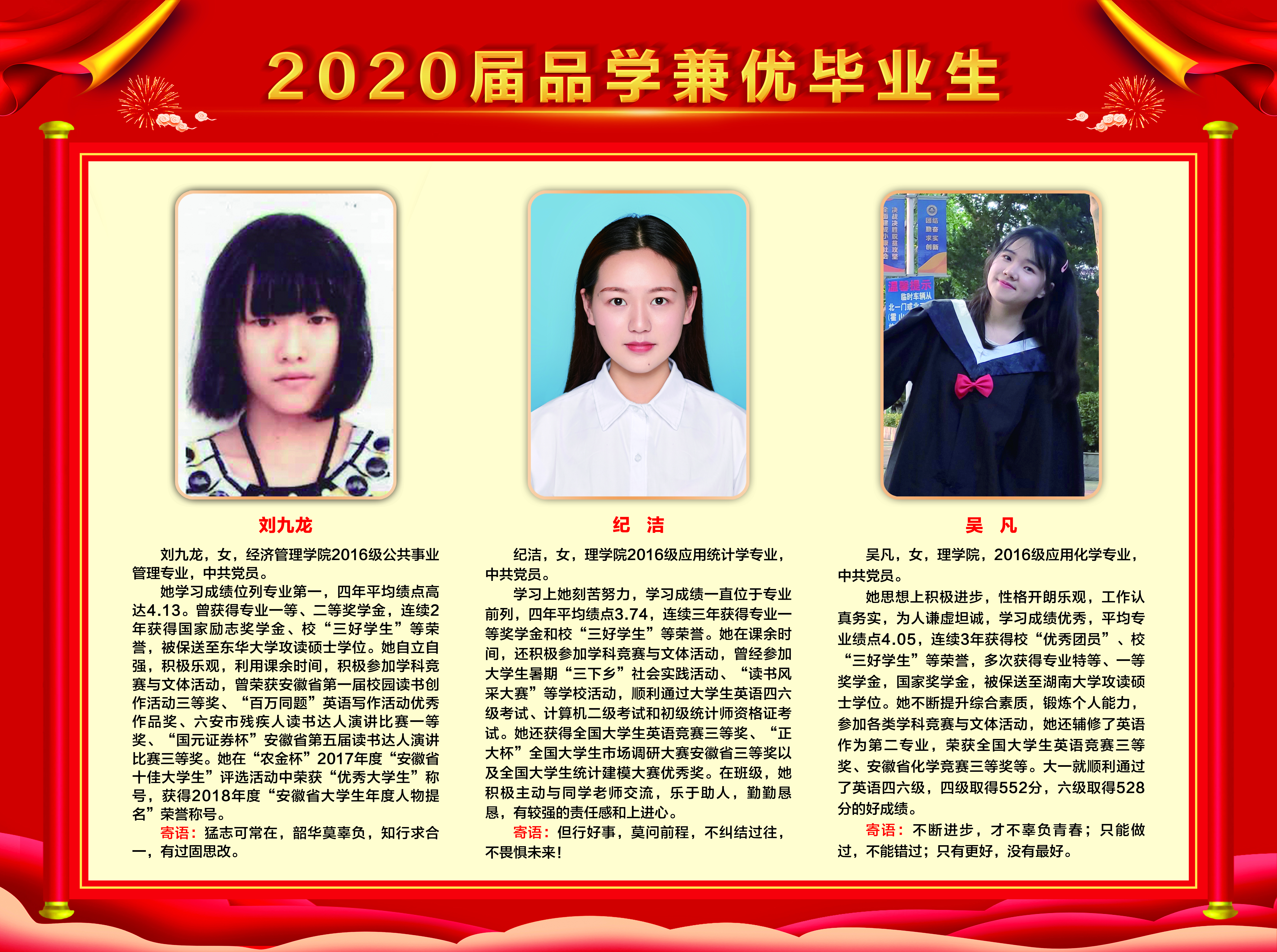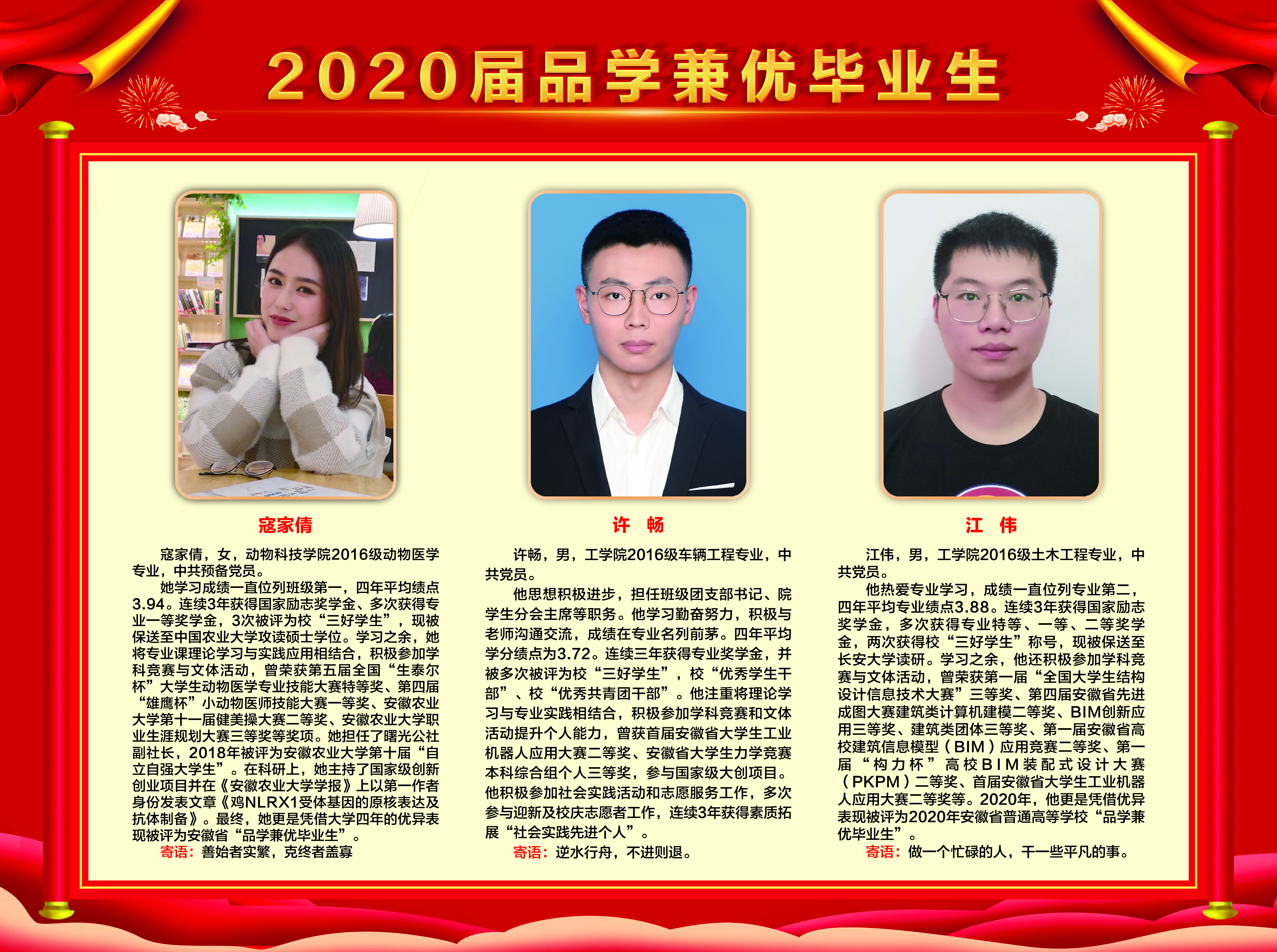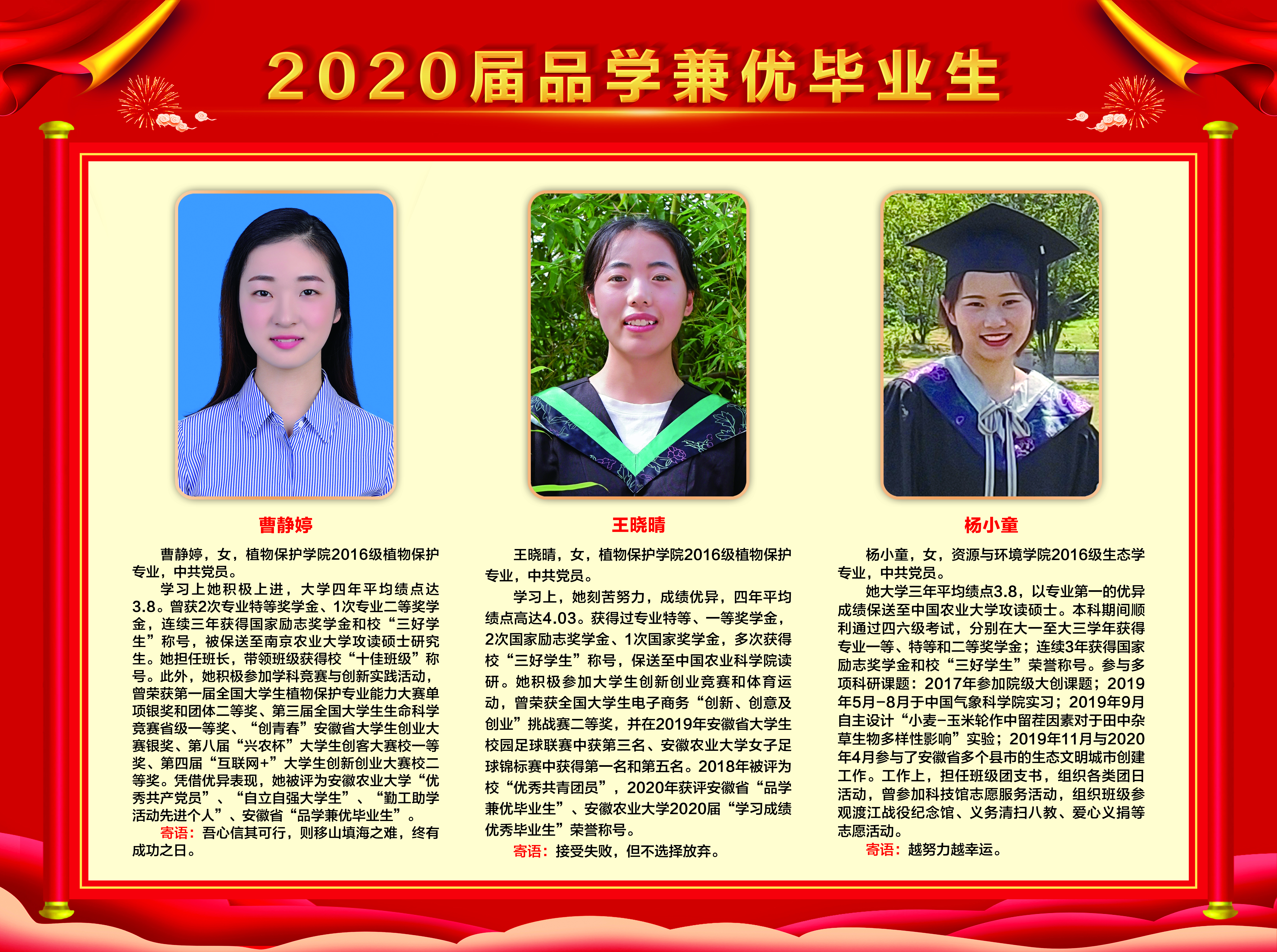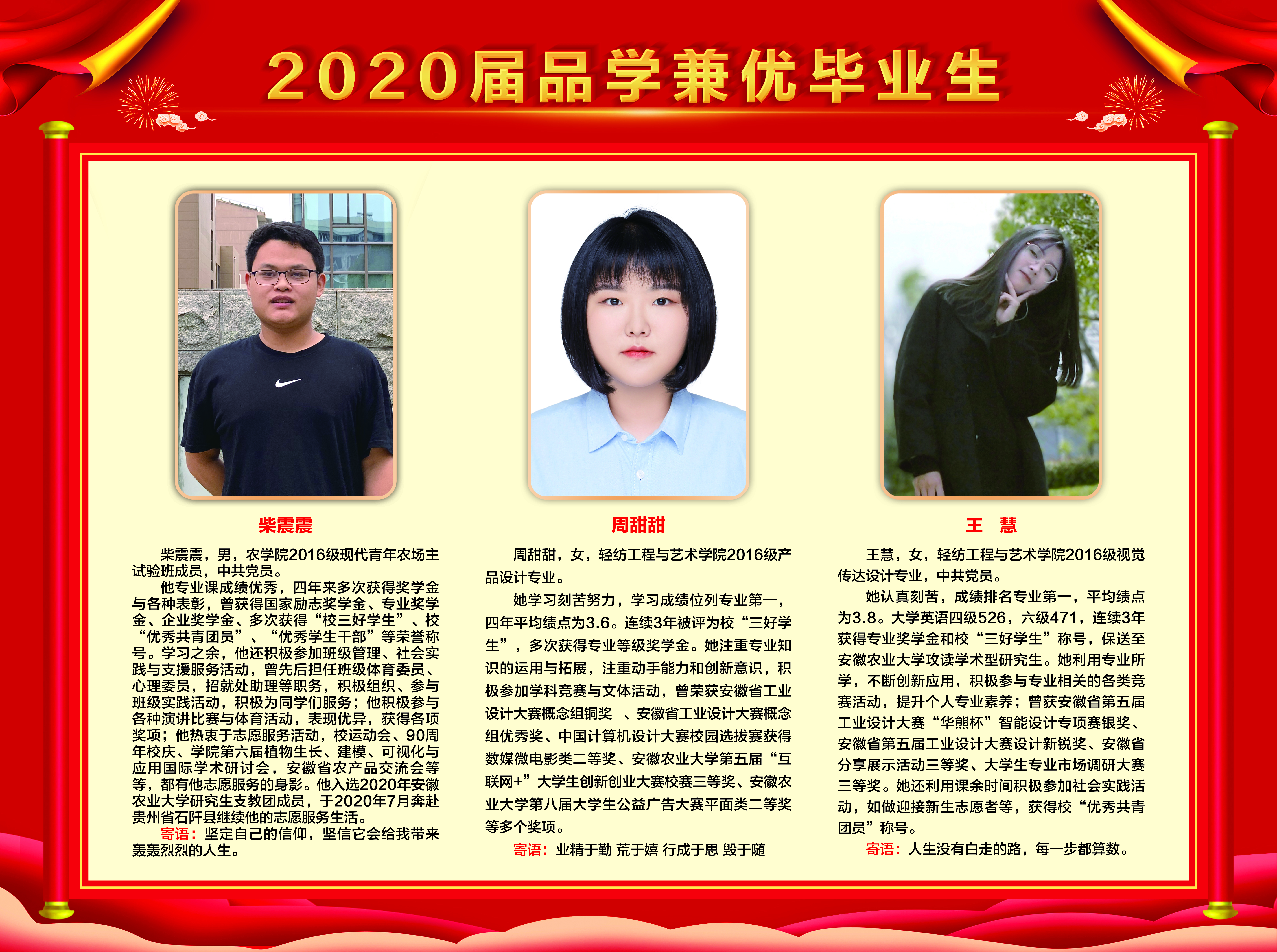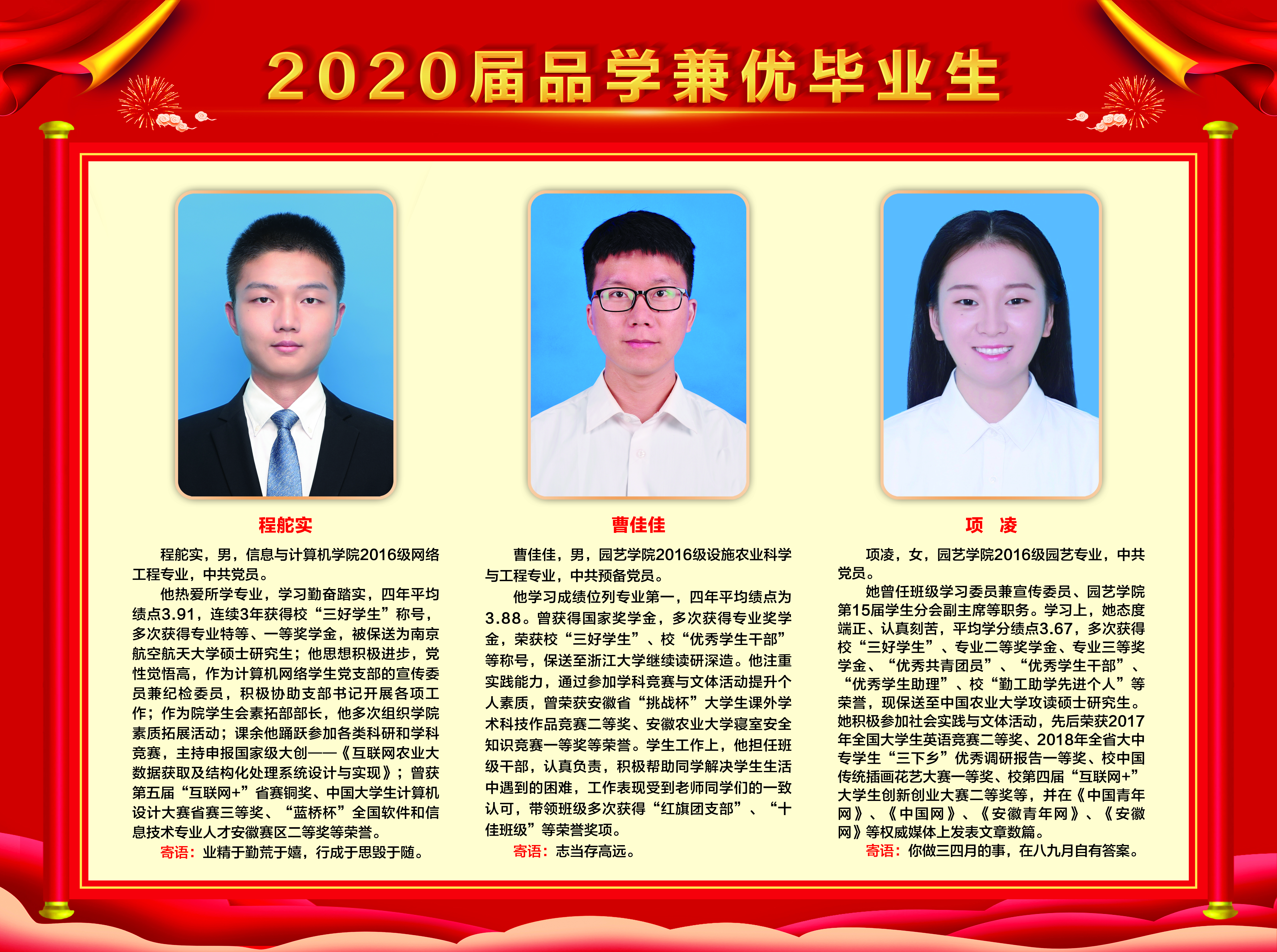 上一条:2019-2020学年国家奖学金、励志奖学金获得者代表暨2021届省级优秀毕业生风采展 下一条:安徽农业大学2017-2018学年国家奖学金、国家励志奖学金暨第十一届“自立自强大学生”风采展
