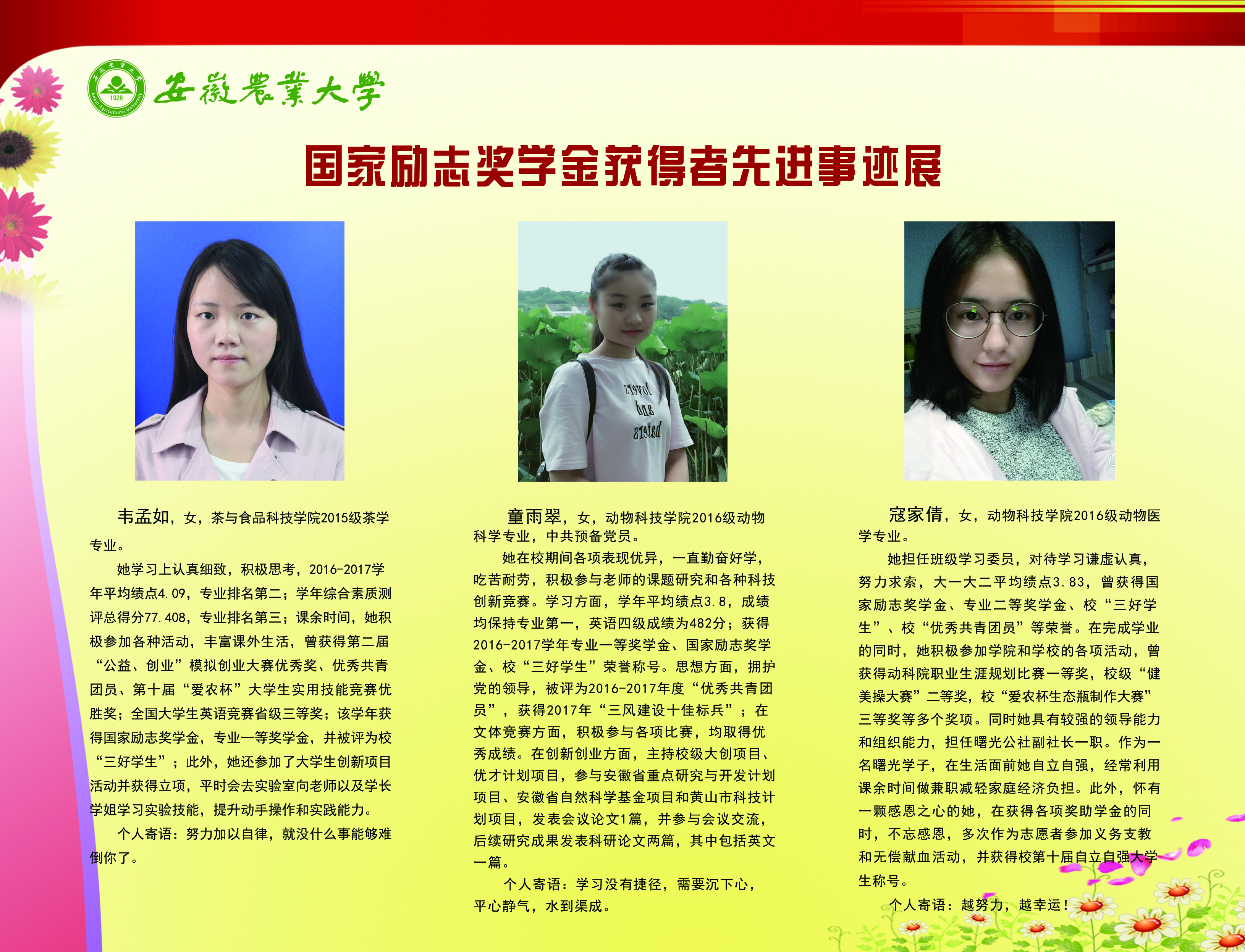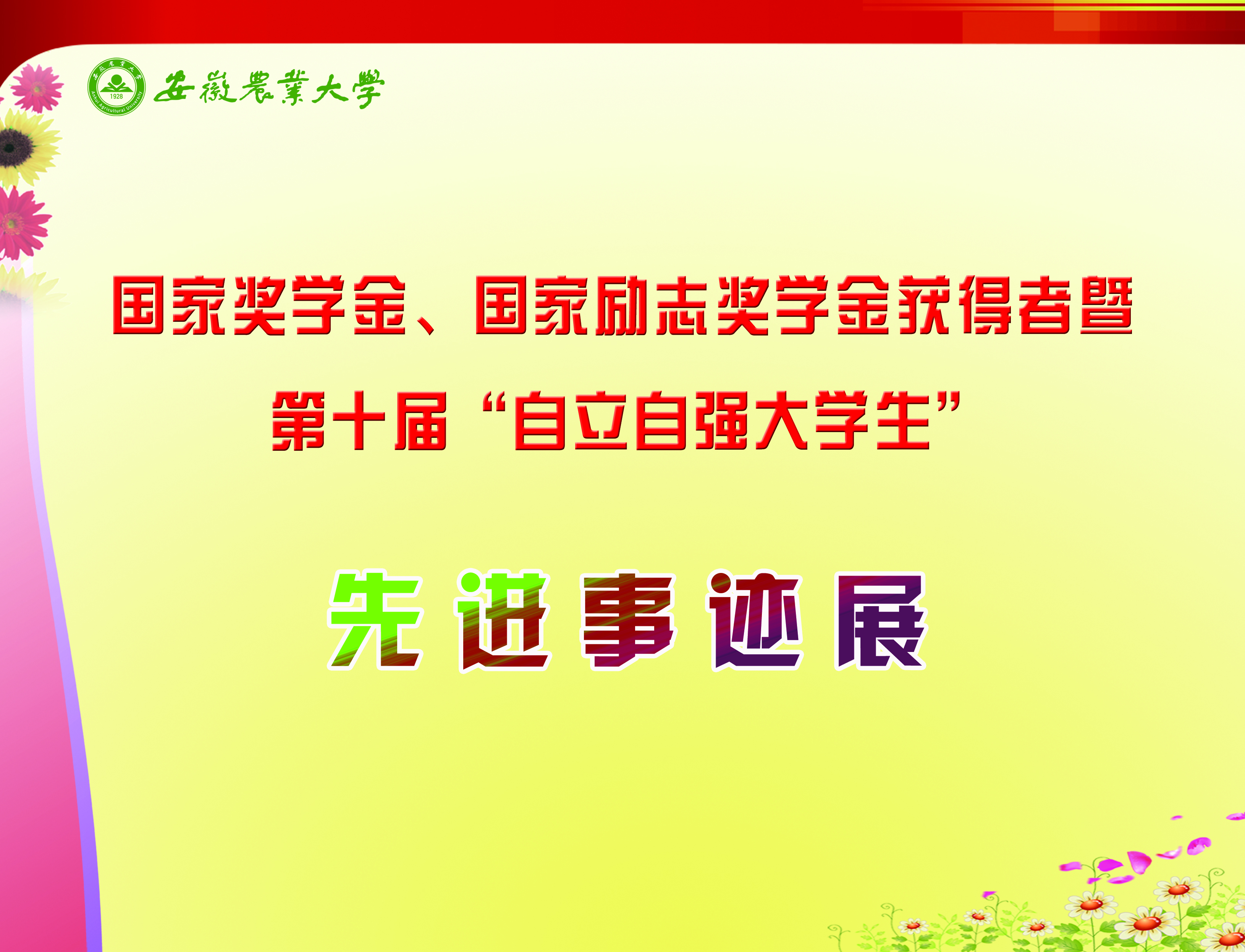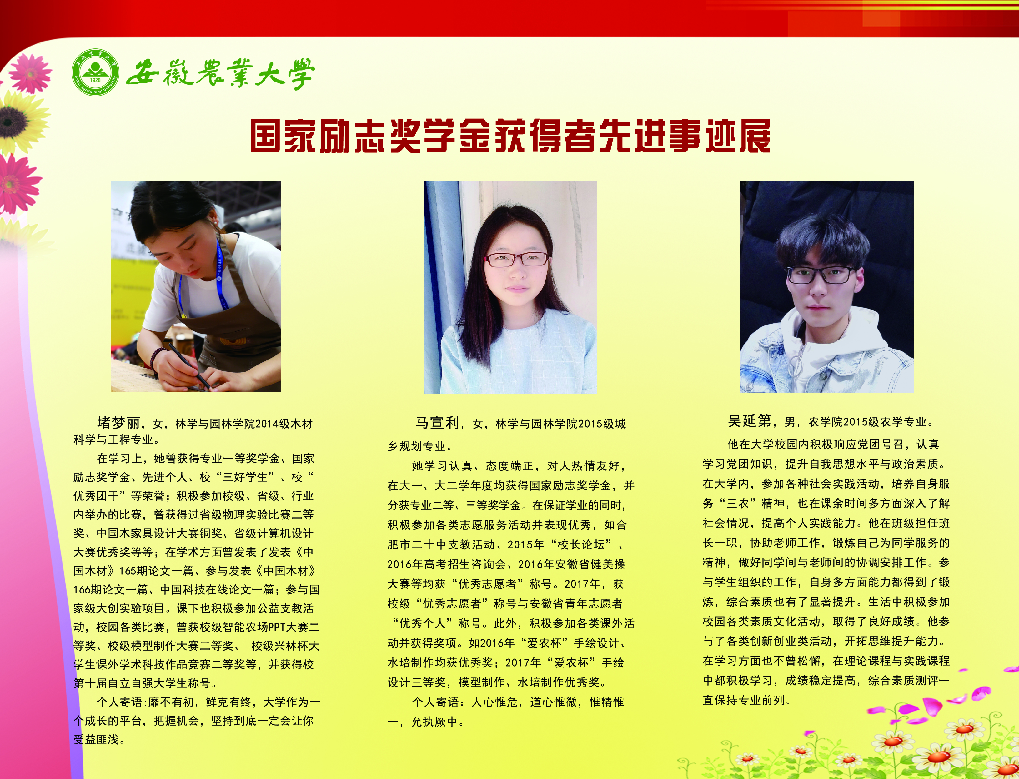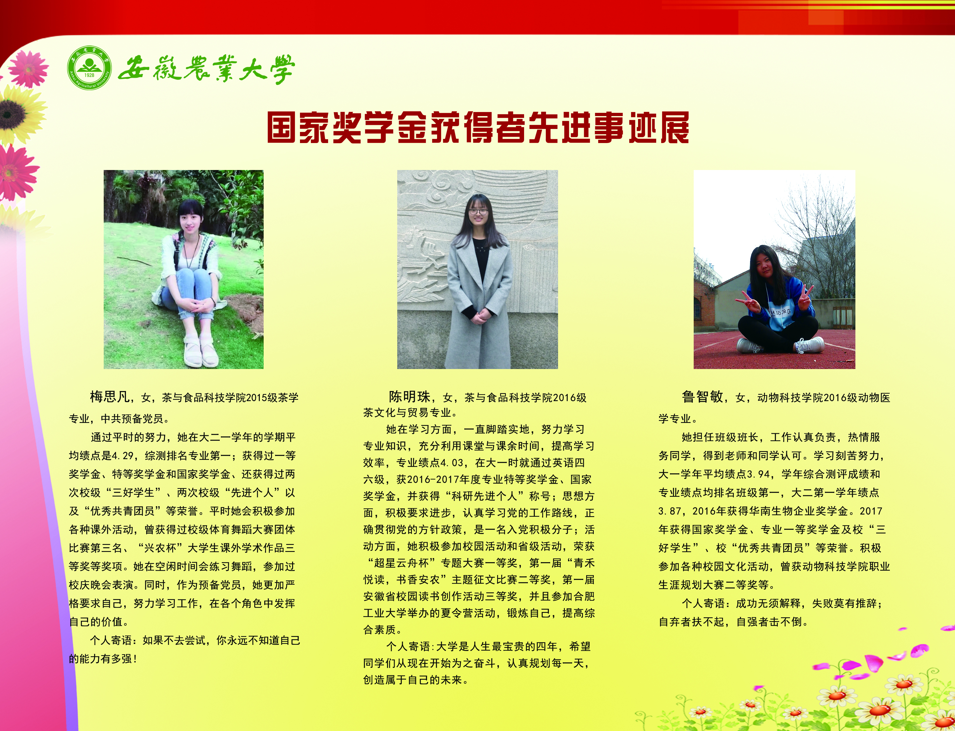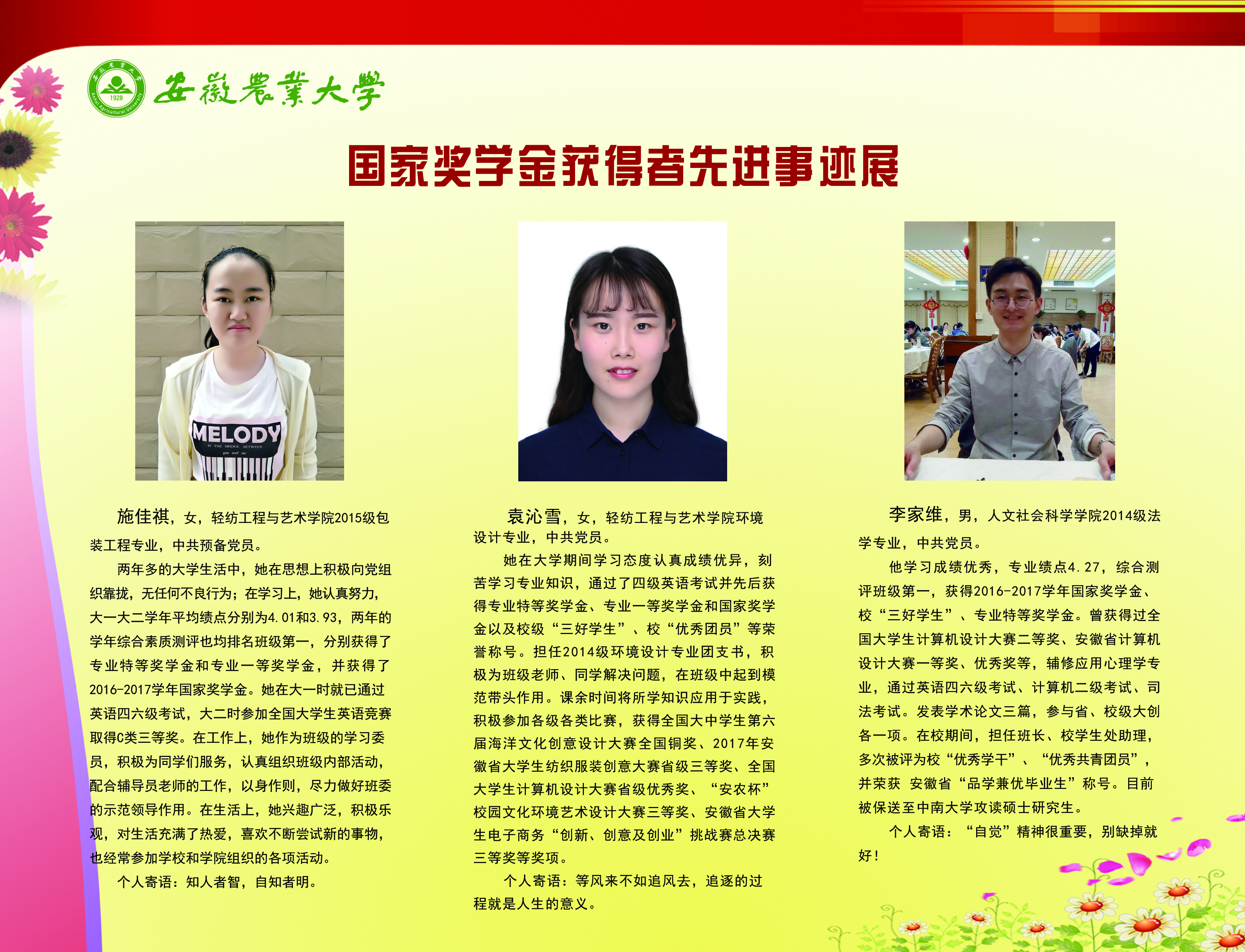 上一条:安徽农业大学2017-2018学年国家奖学金、国家励志奖学金暨第十一届“自立自强大学生”风采展 下一条:安徽农业大学 2012-2013学年“国家奖学金、国家励志奖学金获得者” 暨第六届“自立自强大学生”先进事迹展