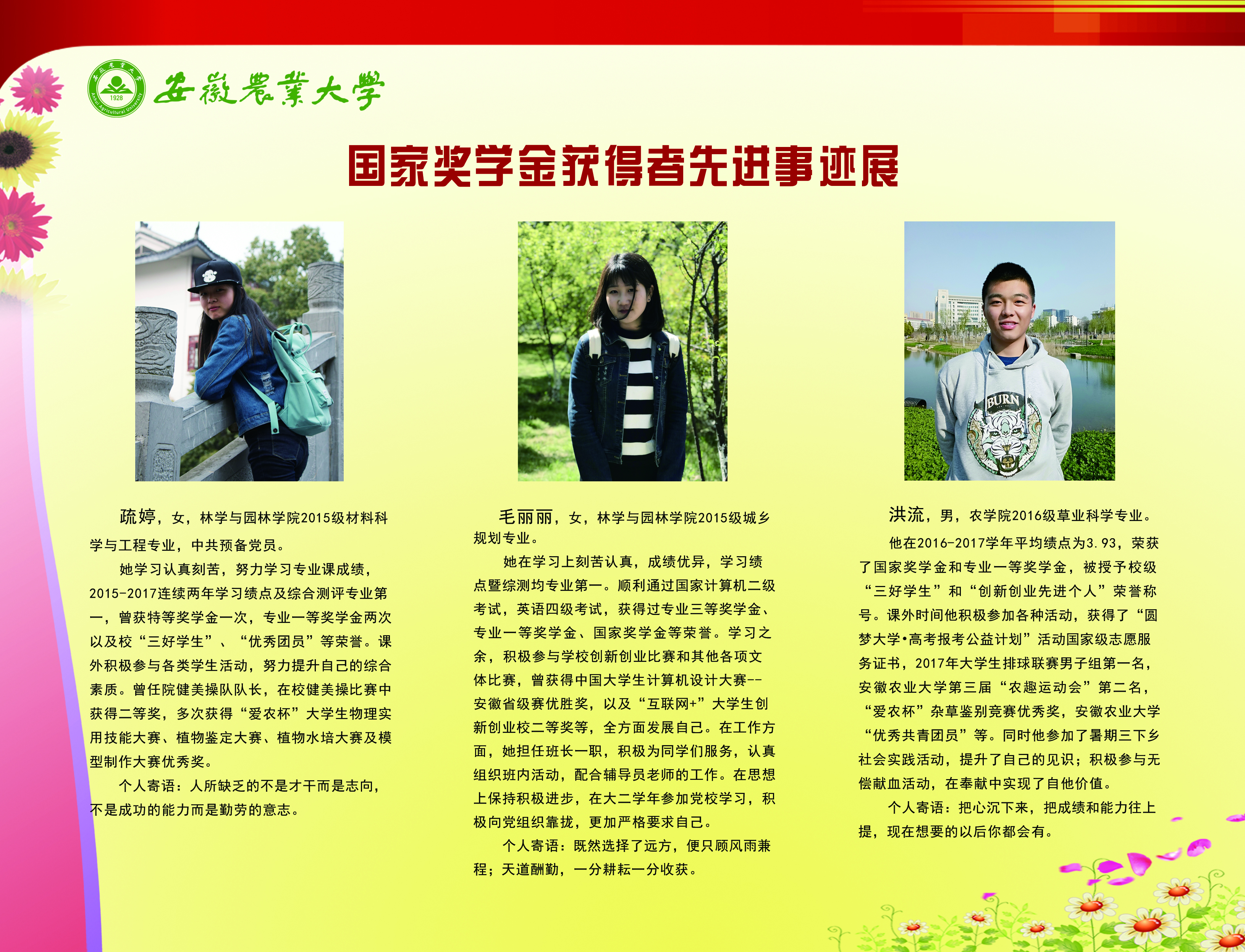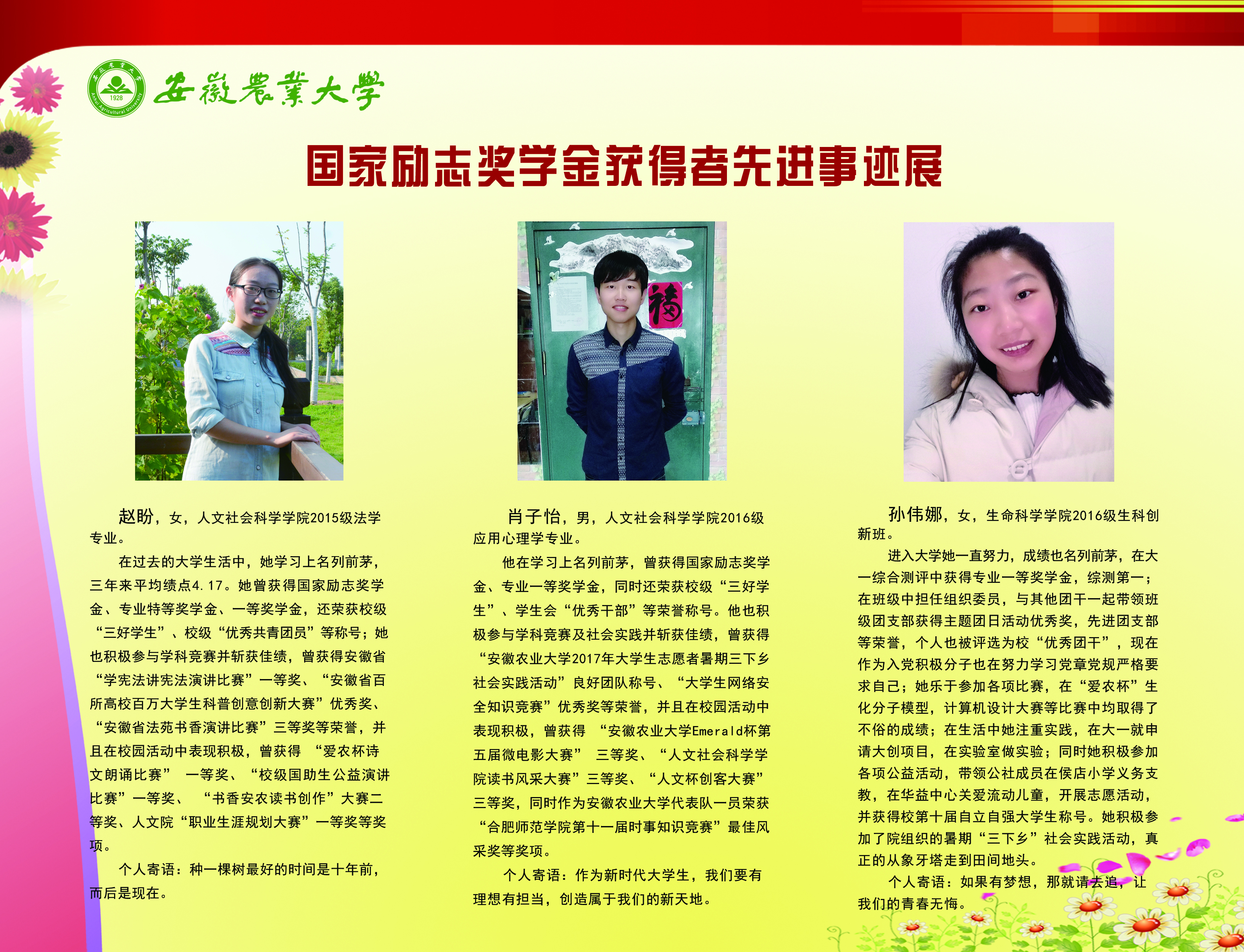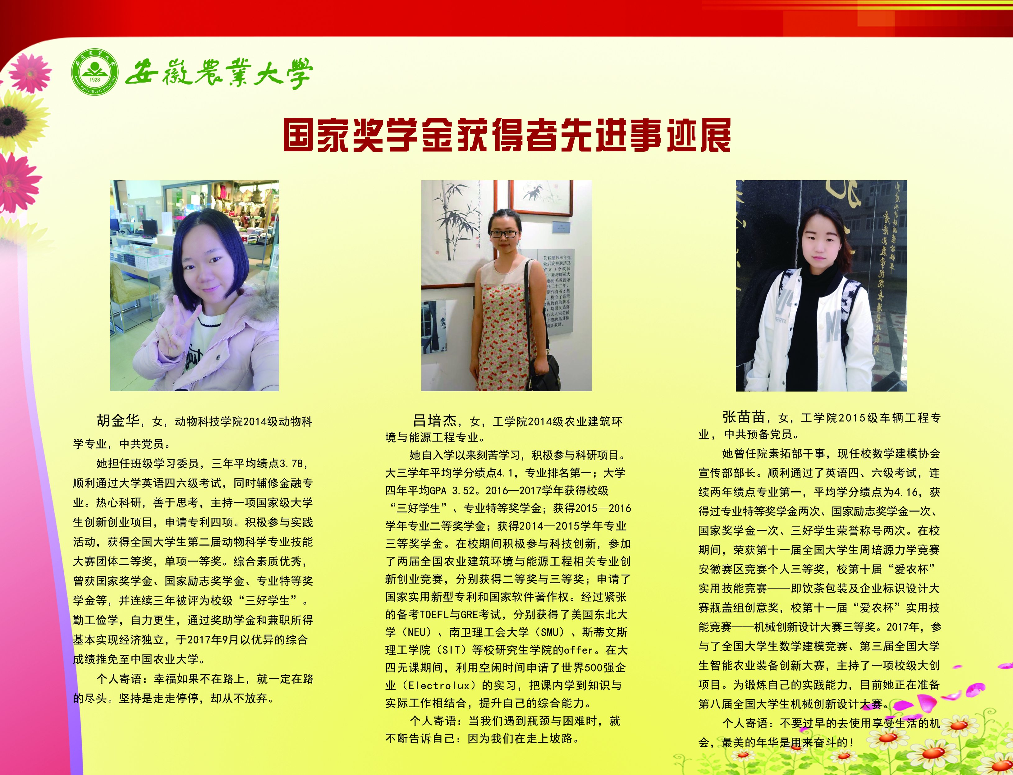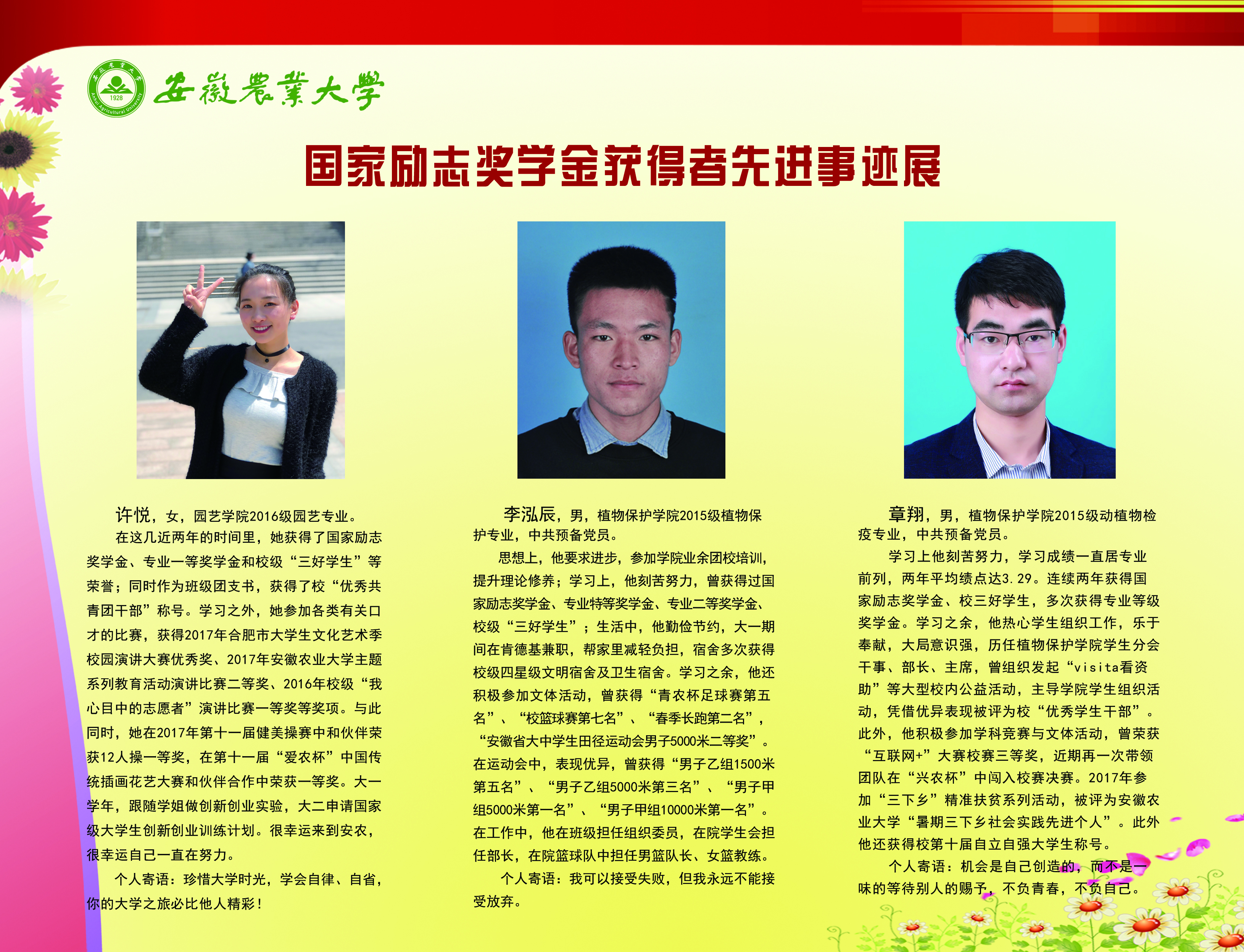 上一条:安徽农业大学2017-2018学年国家奖学金、国家励志奖学金暨第十一届“自立自强大学生”风采展 下一条:安徽农业大学 2012-2013学年“国家奖学金、国家励志奖学金获得者” 暨第六届“自立自强大学生”先进事迹展