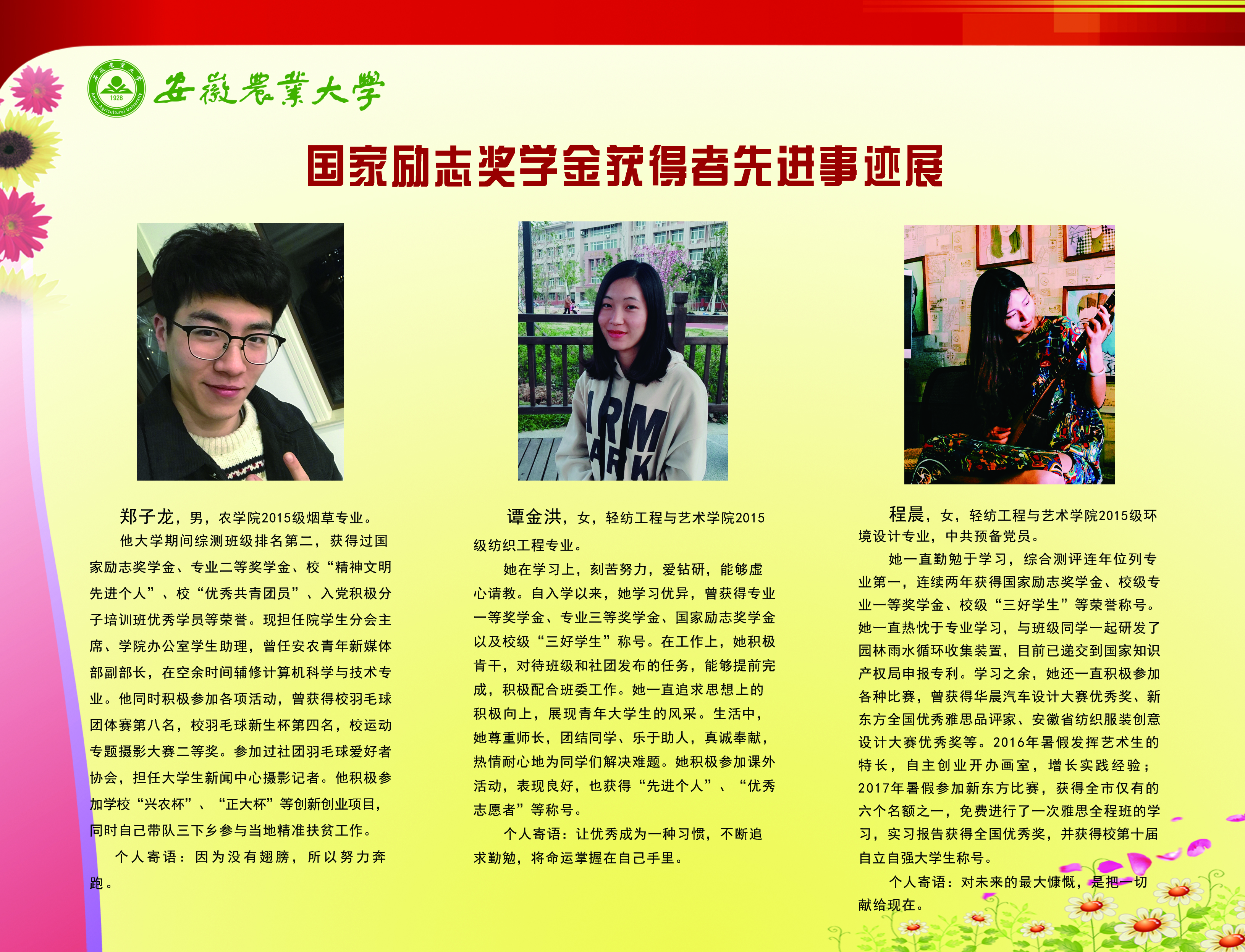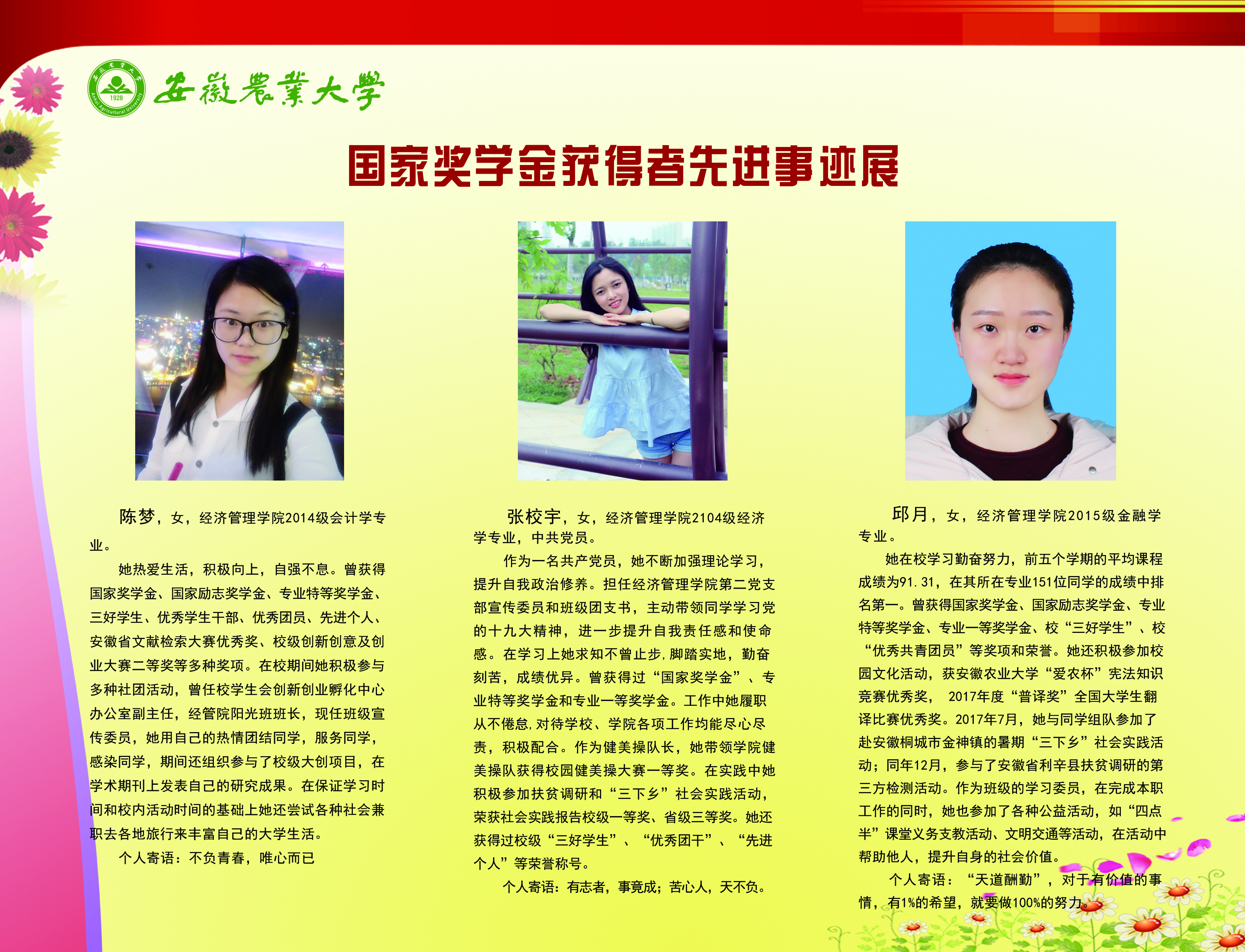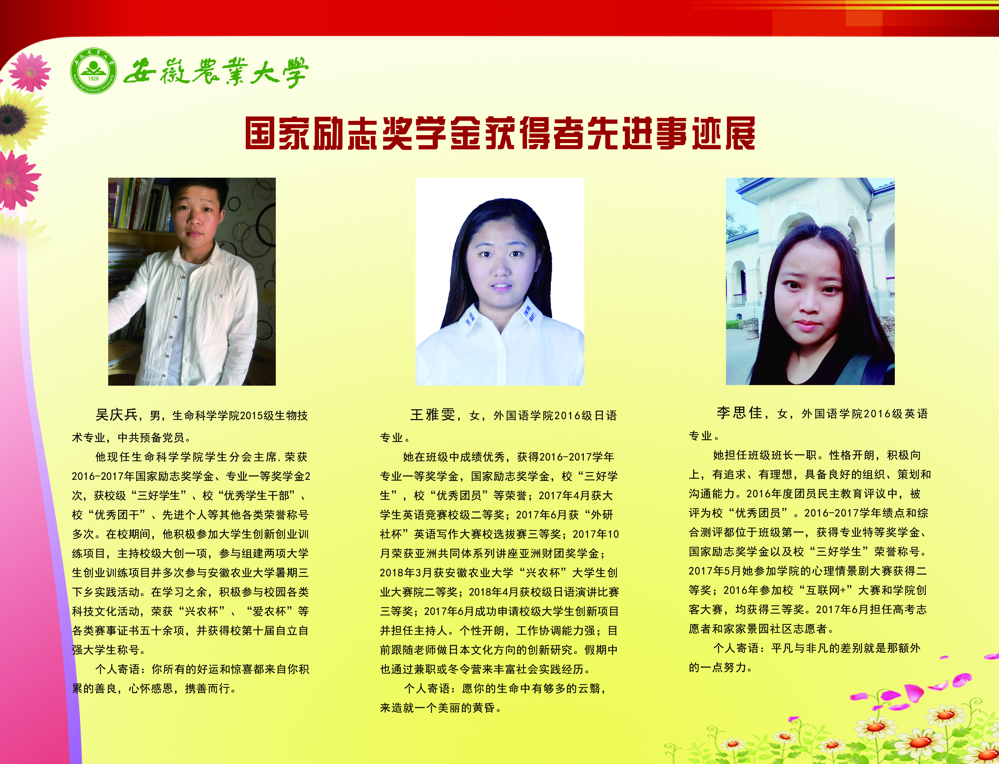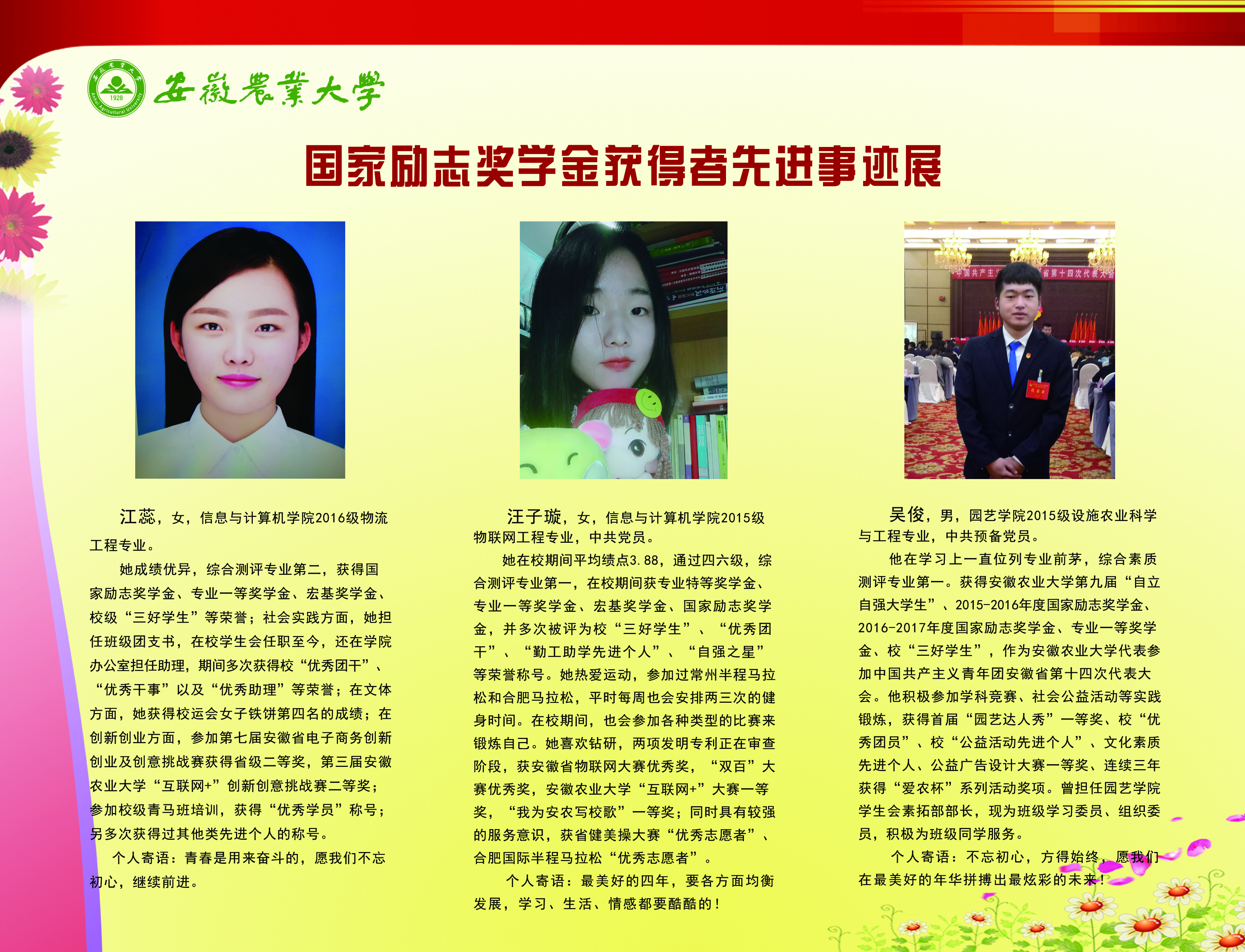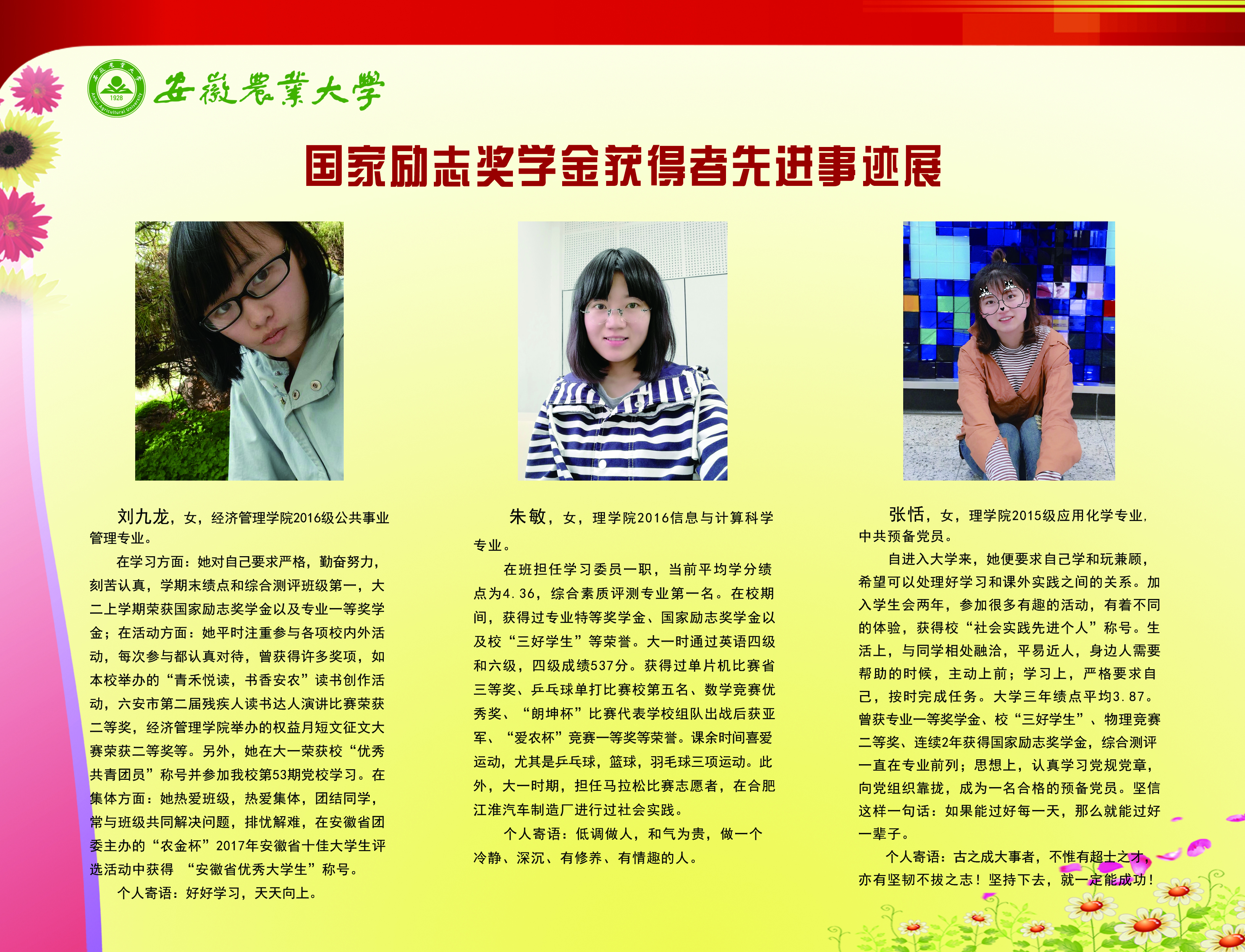 上一条:安徽农业大学2017-2018学年国家奖学金、国家励志奖学金暨第十一届“自立自强大学生”风采展 下一条:安徽农业大学 2012-2013学年“国家奖学金、国家励志奖学金获得者” 暨第六届“自立自强大学生”先进事迹展