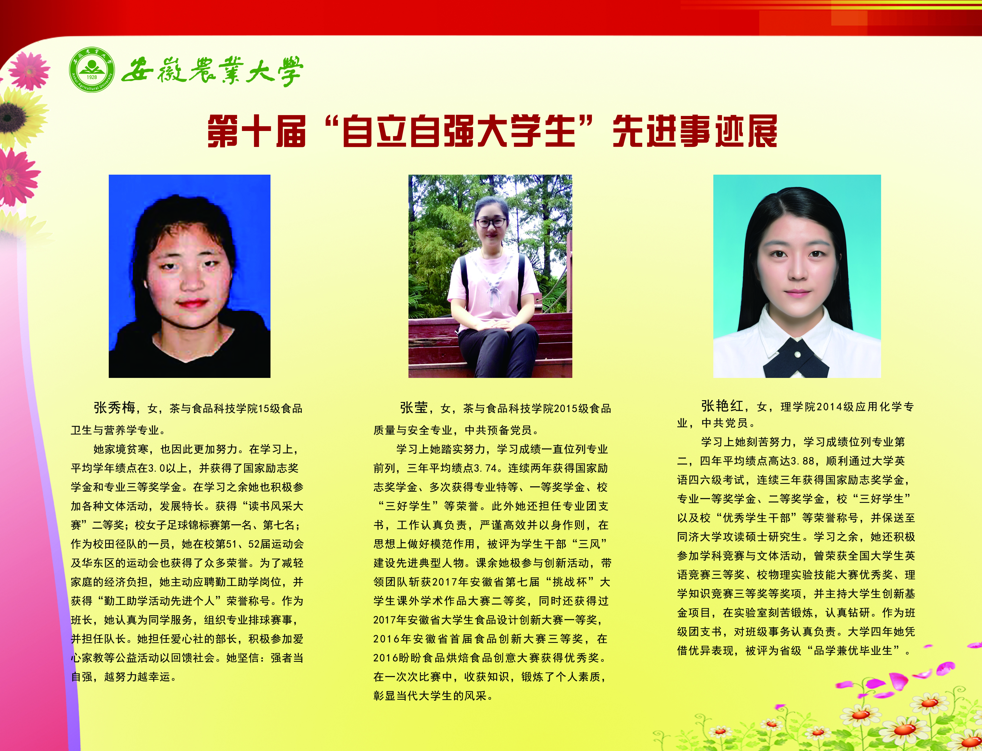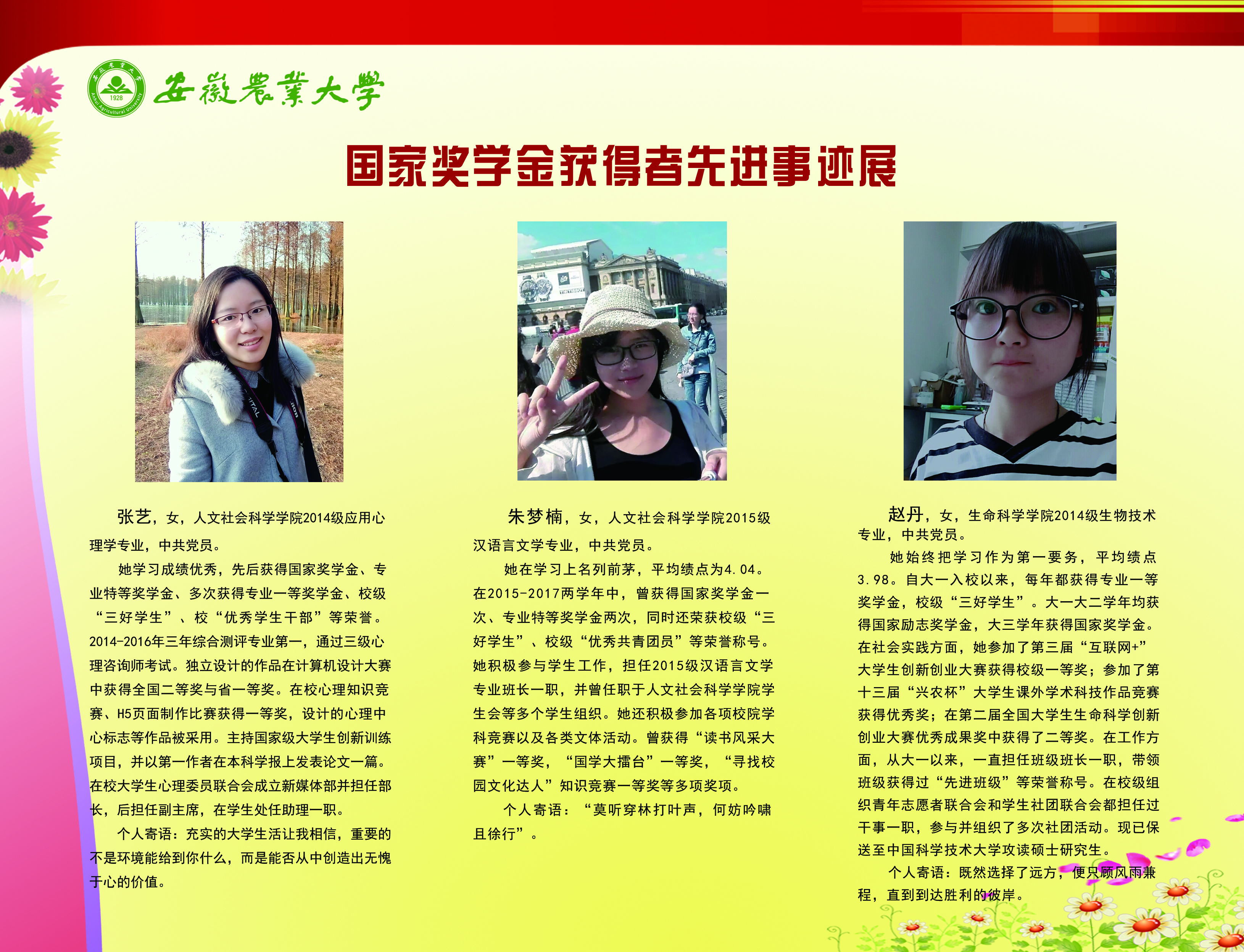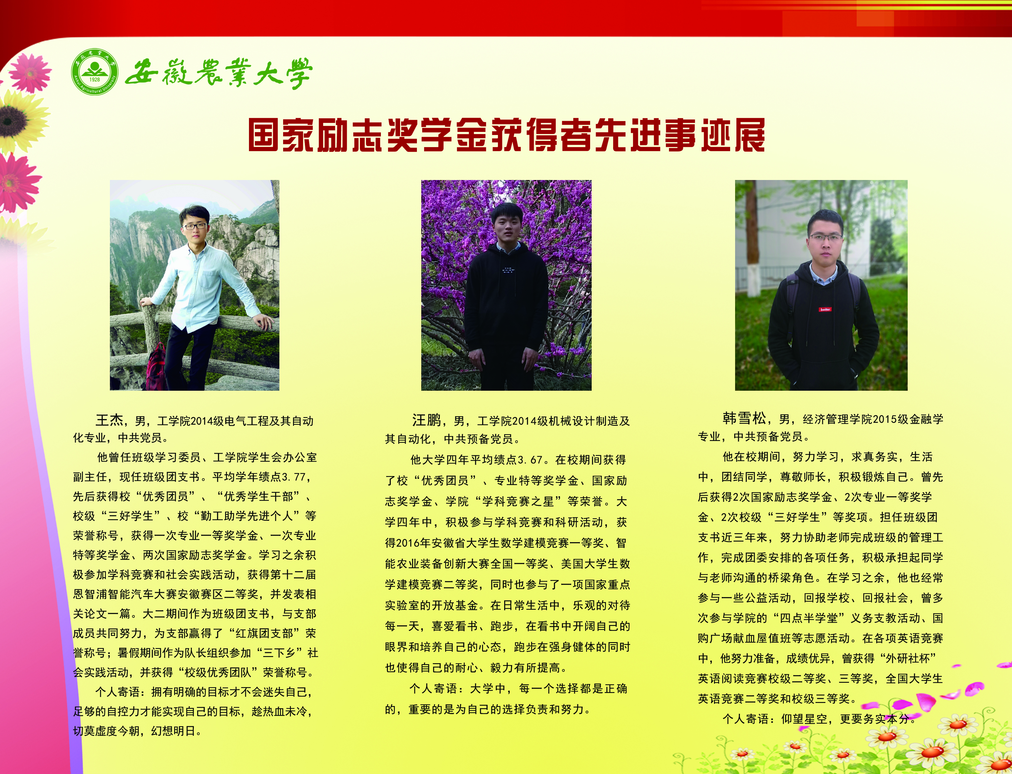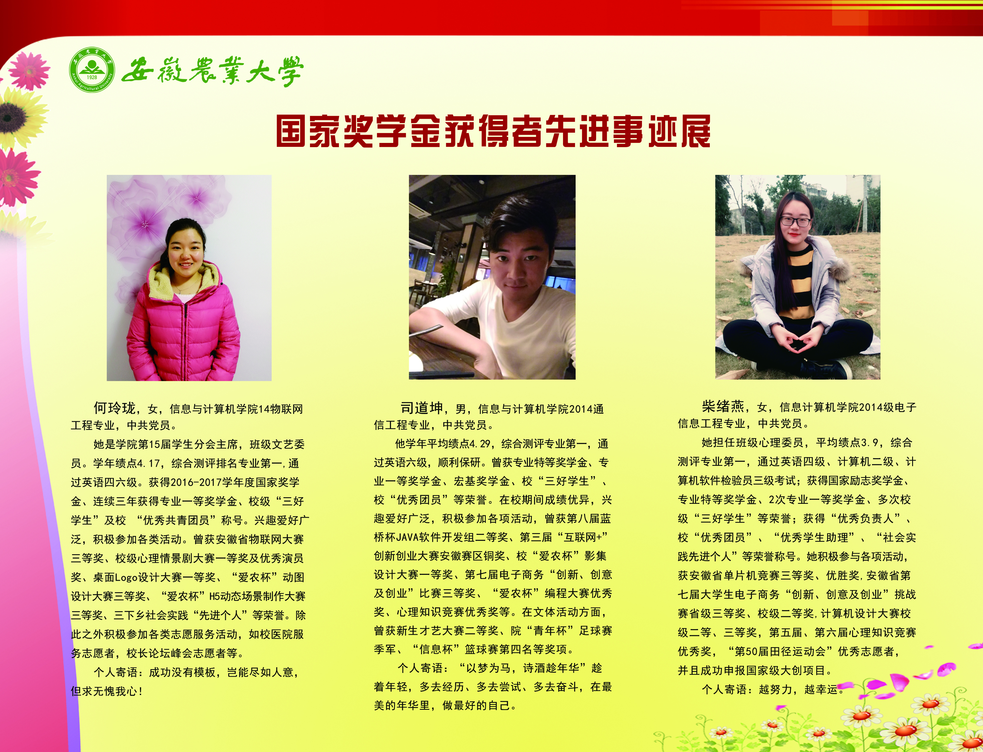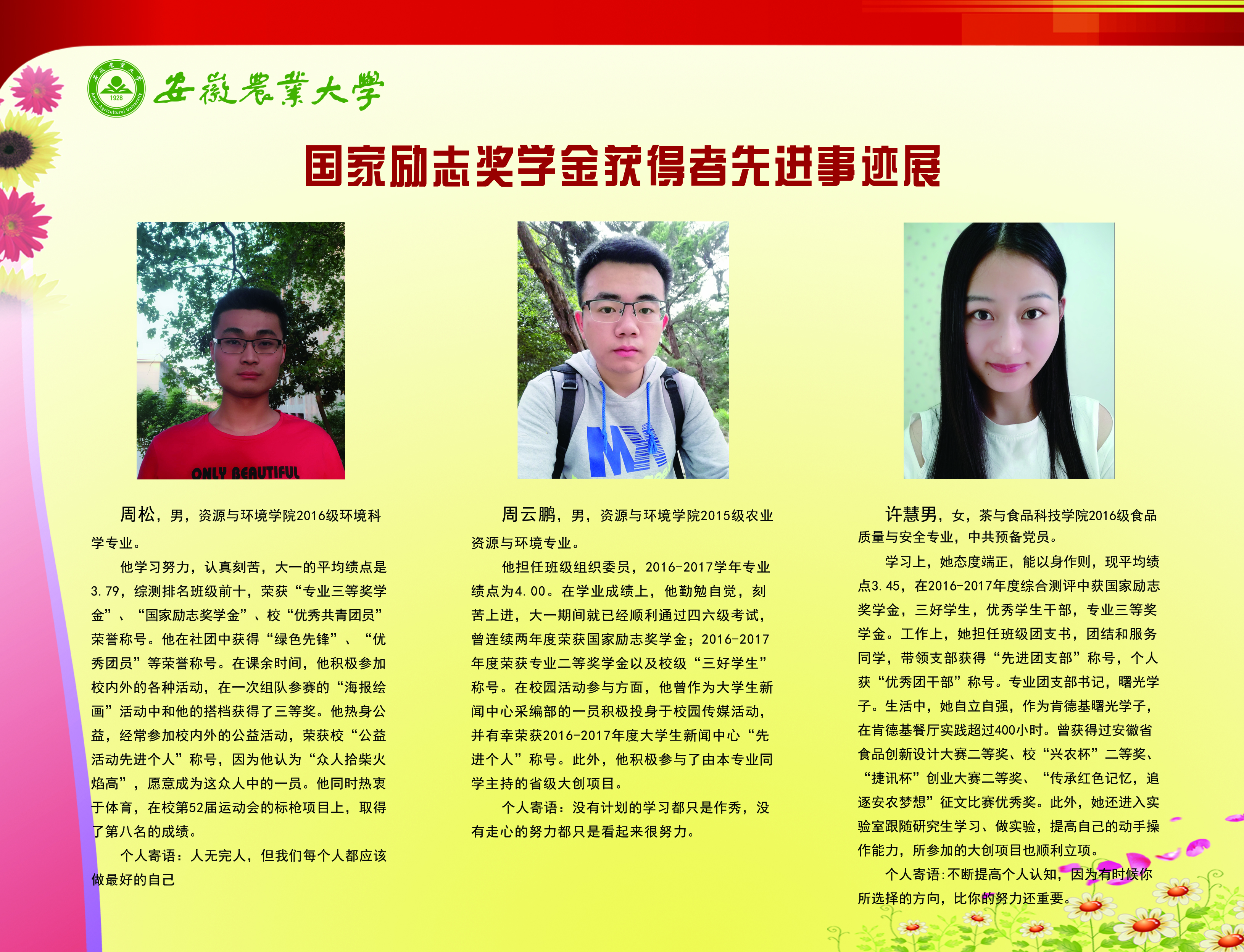 上一条:安徽农业大学2017-2018学年国家奖学金、国家励志奖学金暨第十一届“自立自强大学生”风采展 下一条:安徽农业大学 2012-2013学年“国家奖学金、国家励志奖学金获得者” 暨第六届“自立自强大学生”先进事迹展