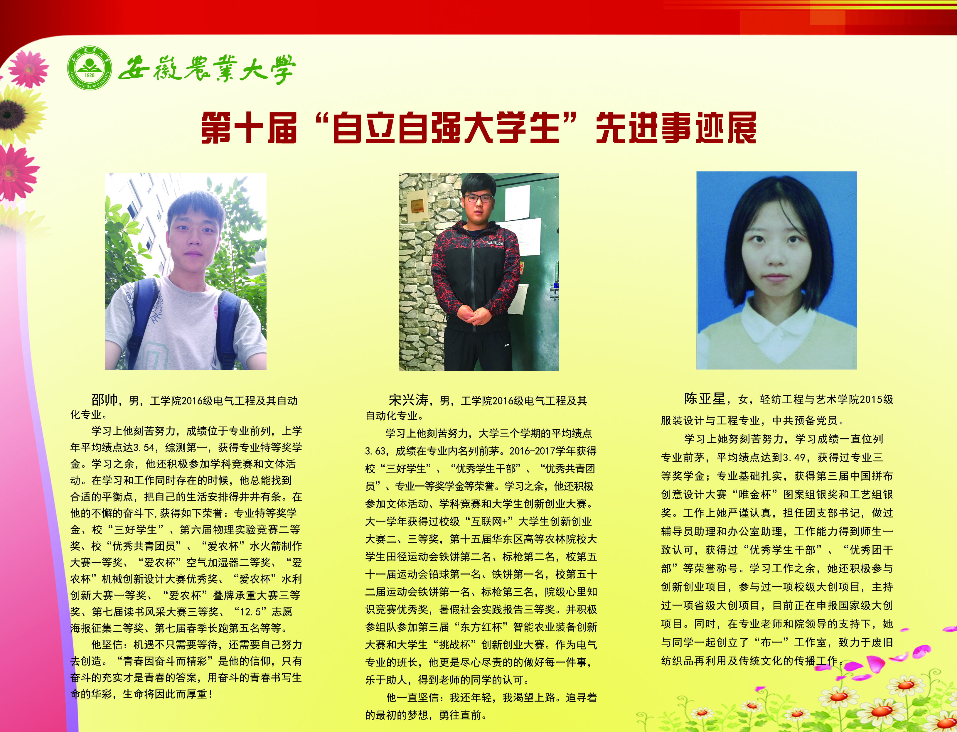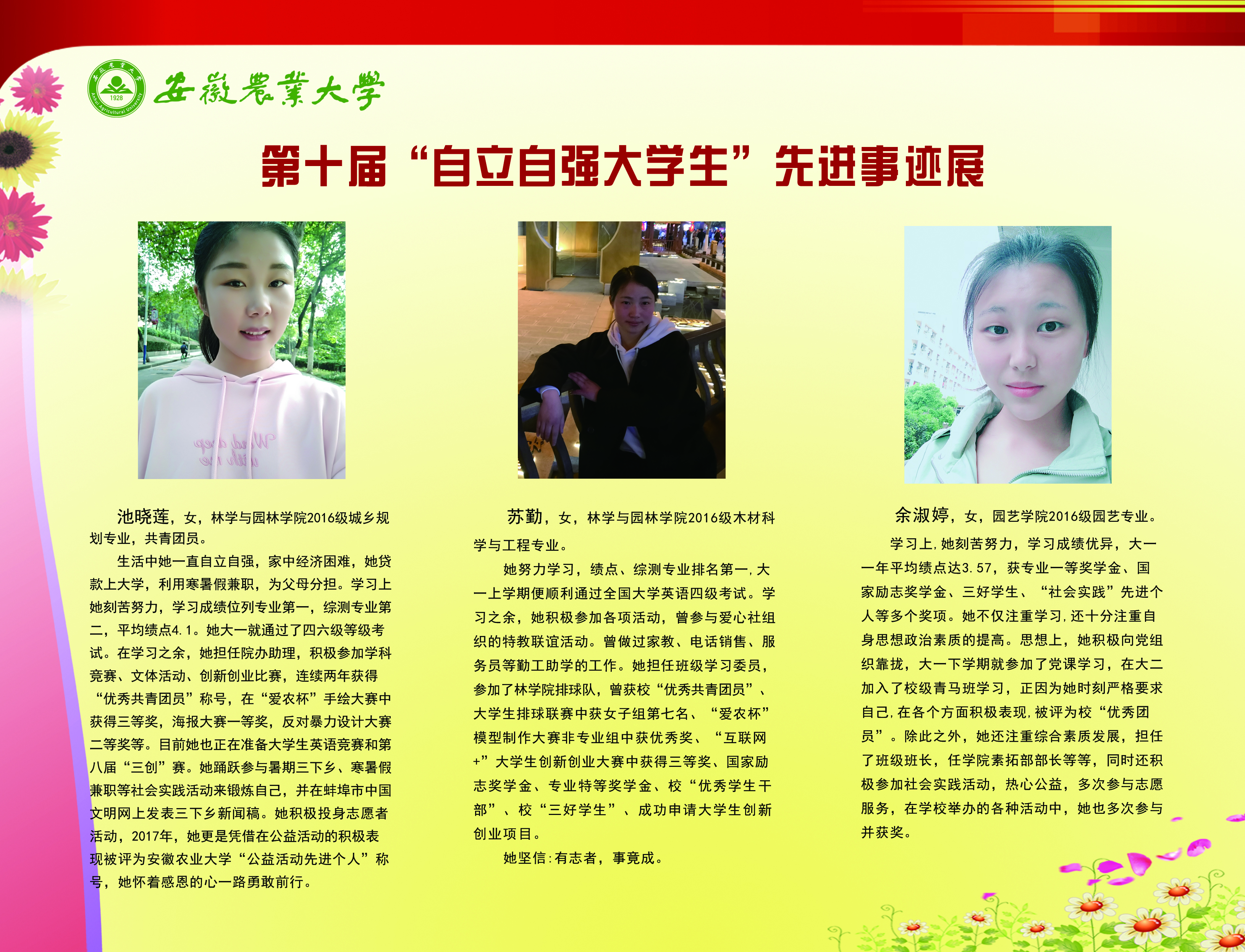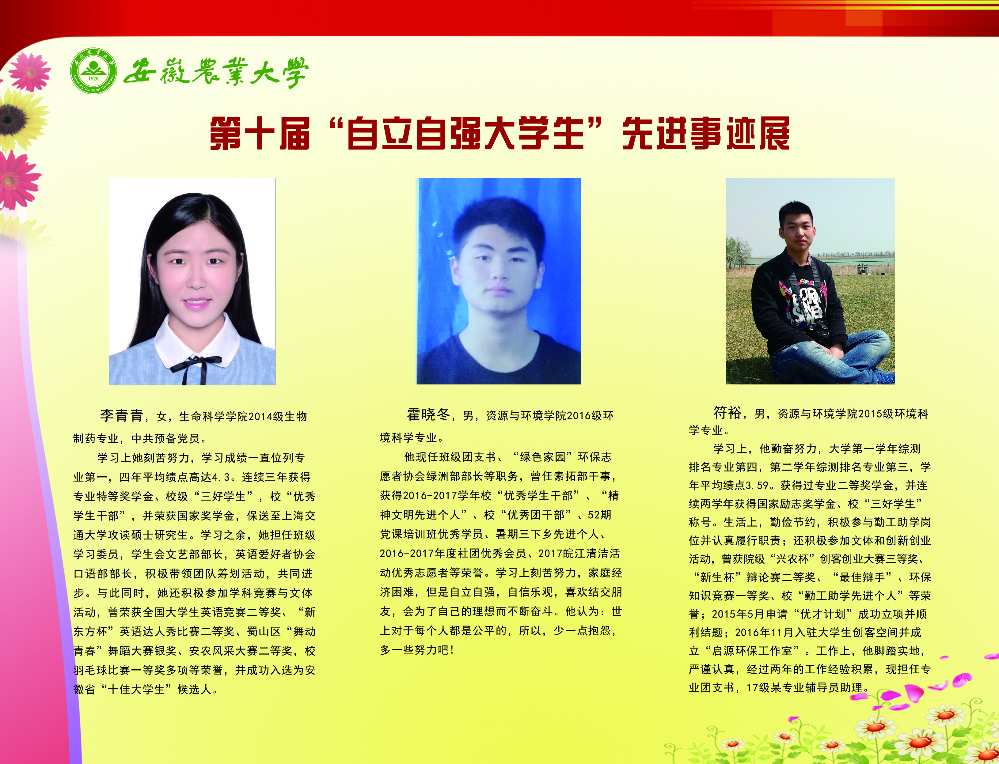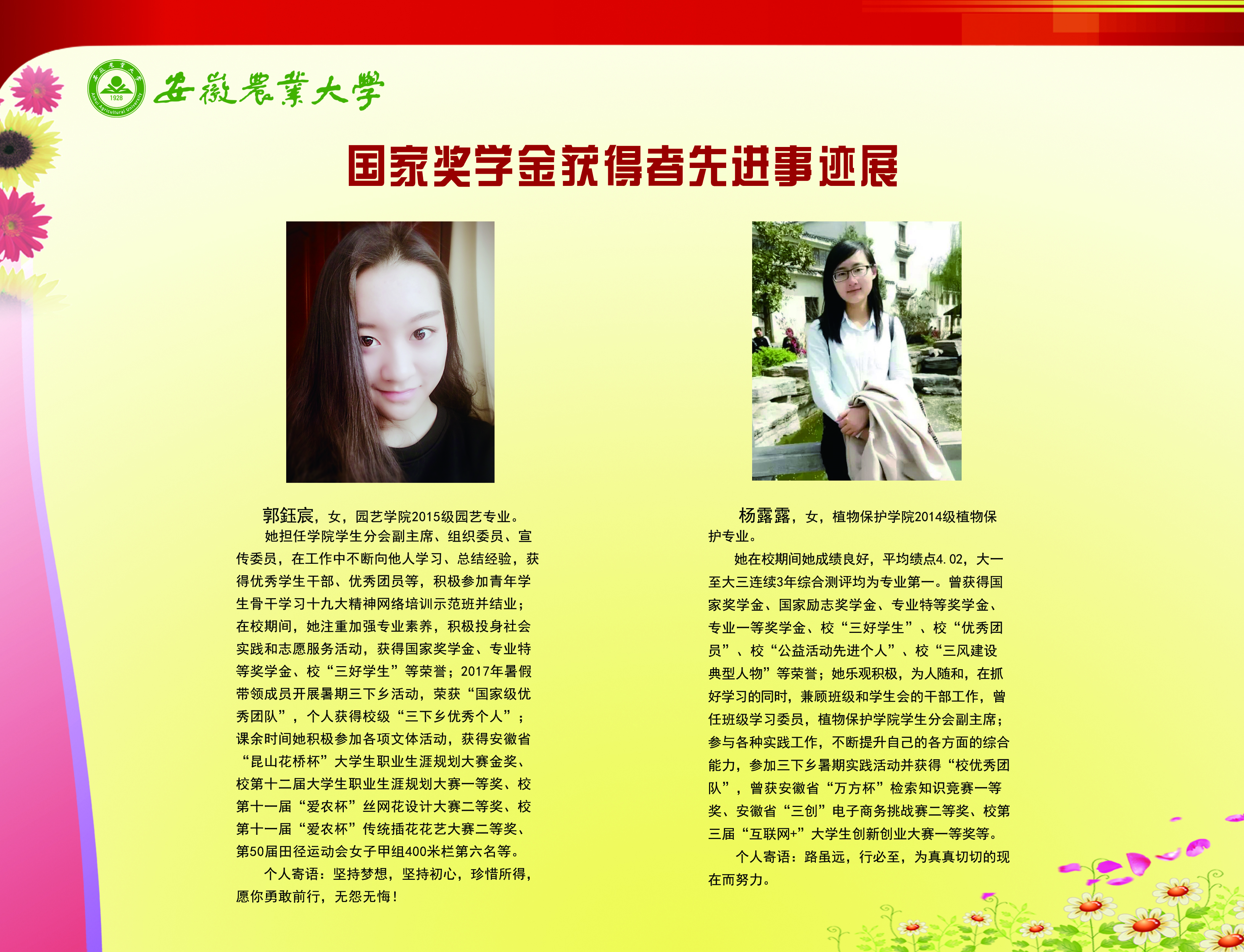 上一条:安徽农业大学2017-2018学年国家奖学金、国家励志奖学金暨第十一届“自立自强大学生”风采展 下一条:安徽农业大学 2012-2013学年“国家奖学金、国家励志奖学金获得者” 暨第六届“自立自强大学生”先进事迹展