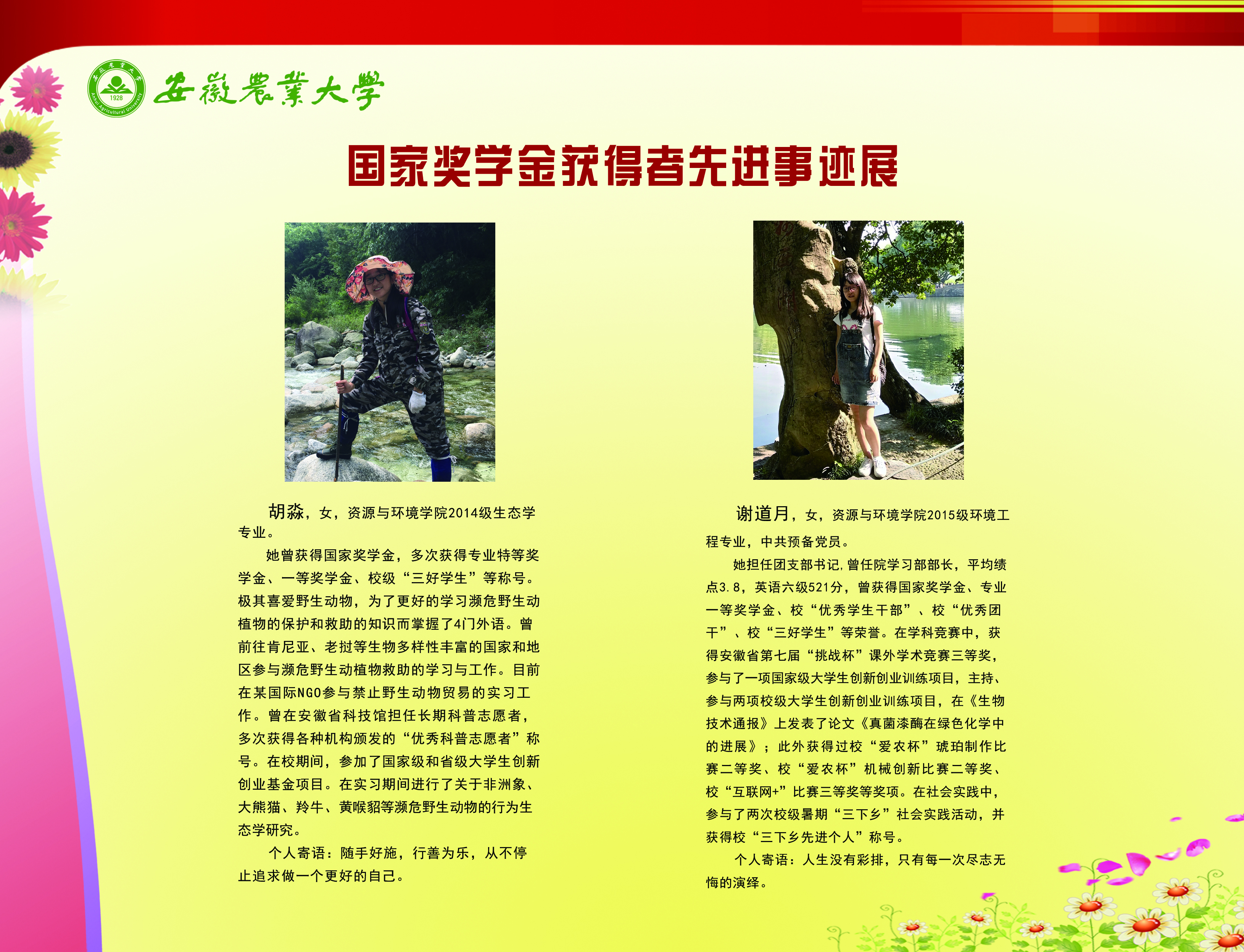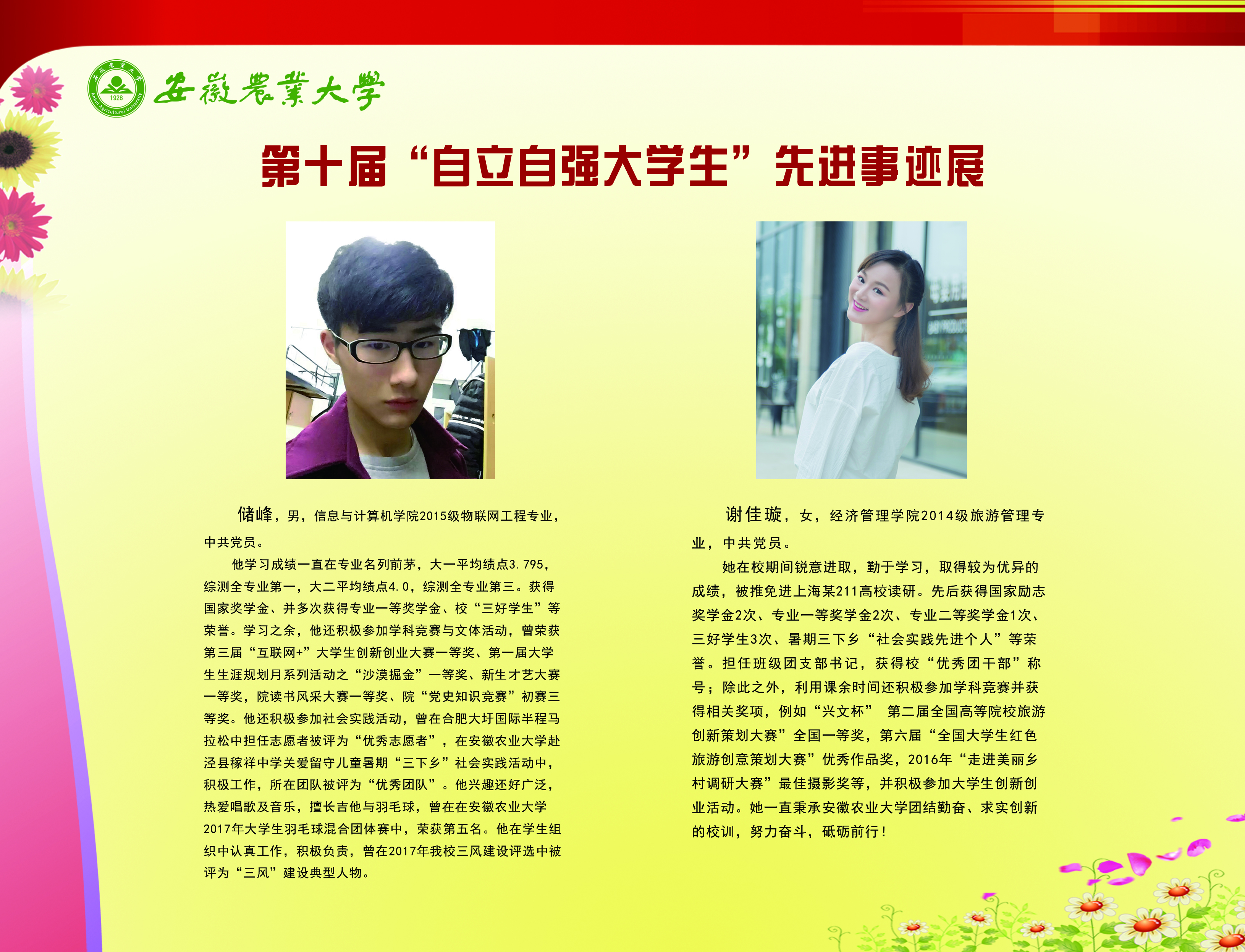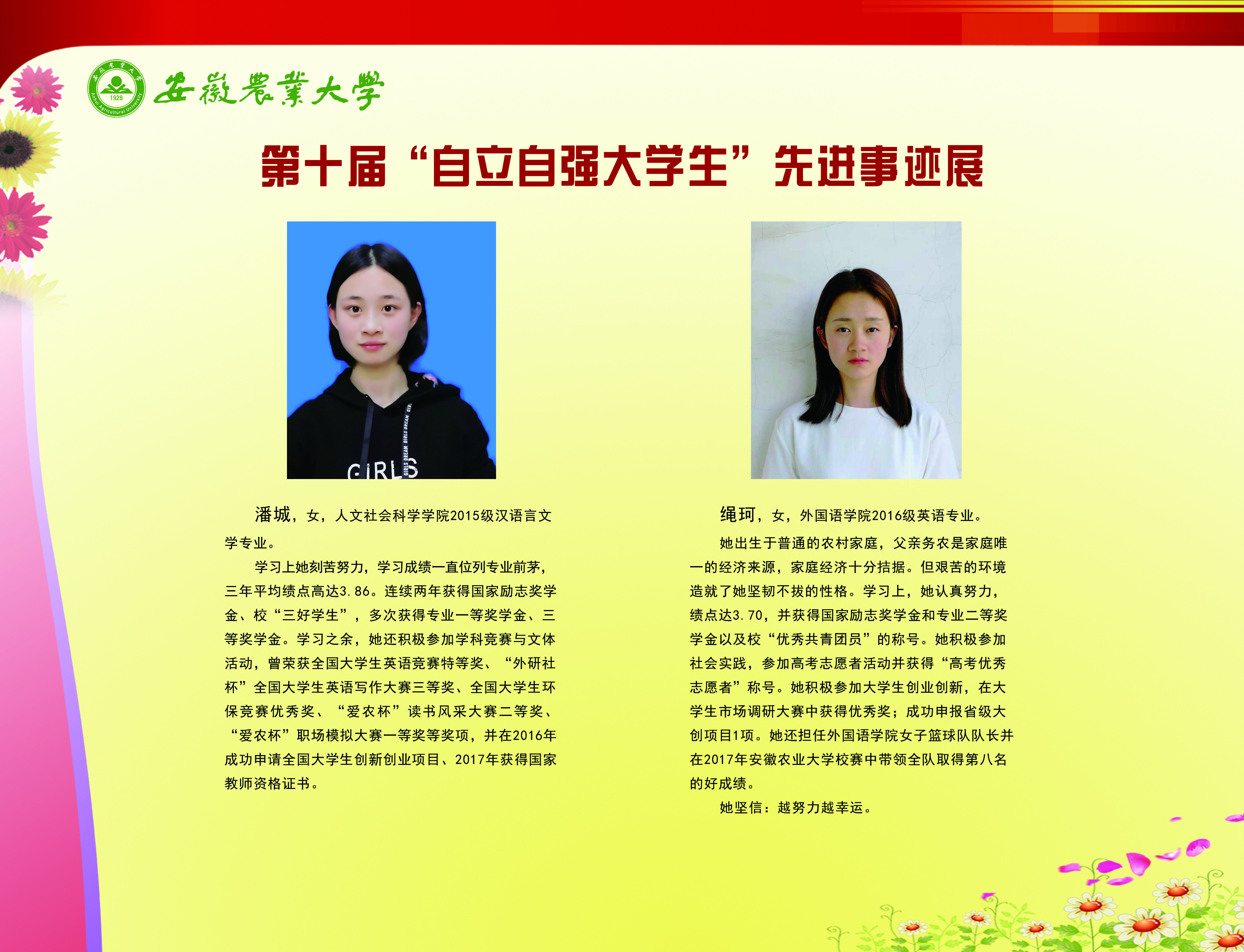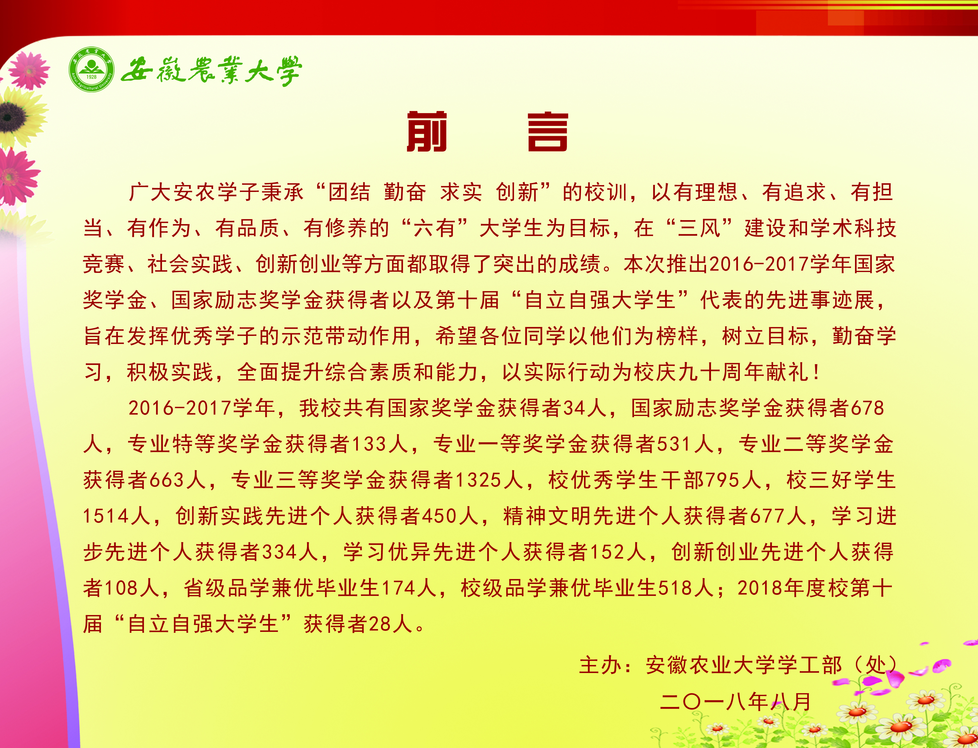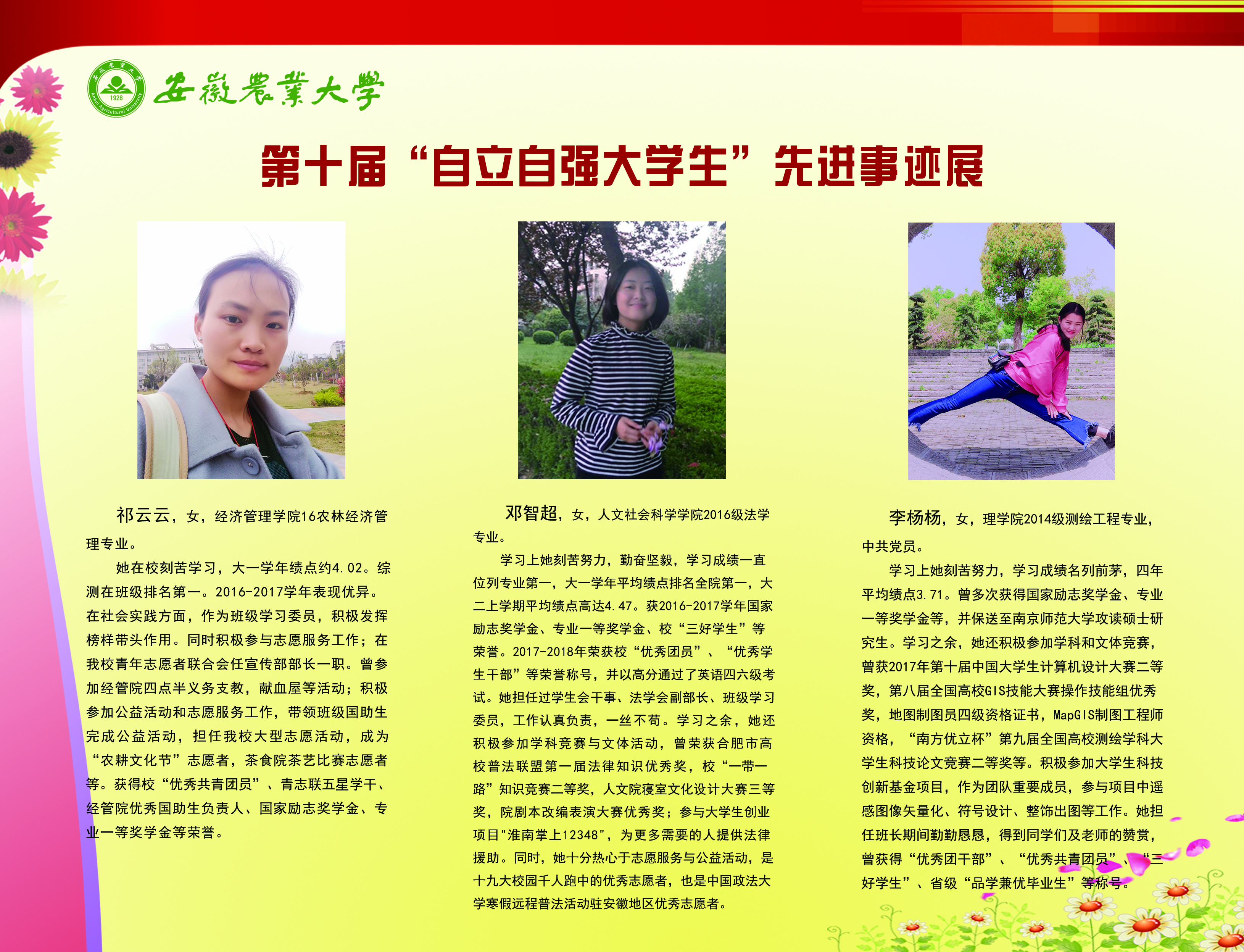 上一条:安徽农业大学2017-2018学年国家奖学金、国家励志奖学金暨第十一届“自立自强大学生”风采展 下一条:安徽农业大学 2012-2013学年“国家奖学金、国家励志奖学金获得者” 暨第六届“自立自强大学生”先进事迹展
