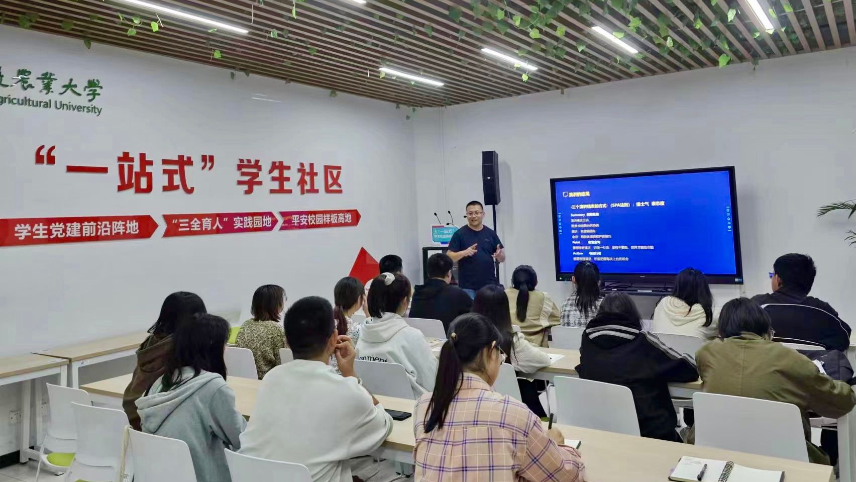 10月27日晚7点,国家二级创业咨询师丁朝阳老师在一站式社区开展了《大学生演讲与表达及PPT设计制作》专题讲座。好的开场白是成功的一半,一名优秀的演讲者会像磁铁一样吸引住观众的眼球,而想要讲得出彩,必须多听多练,才能厚积薄发。丁朝阳从演讲表达的结构、演讲表达的技巧、ppt设计的常识和ppt设计的技巧四个方面进行了细致的讲解,激发了参训学生的求知学习兴趣。