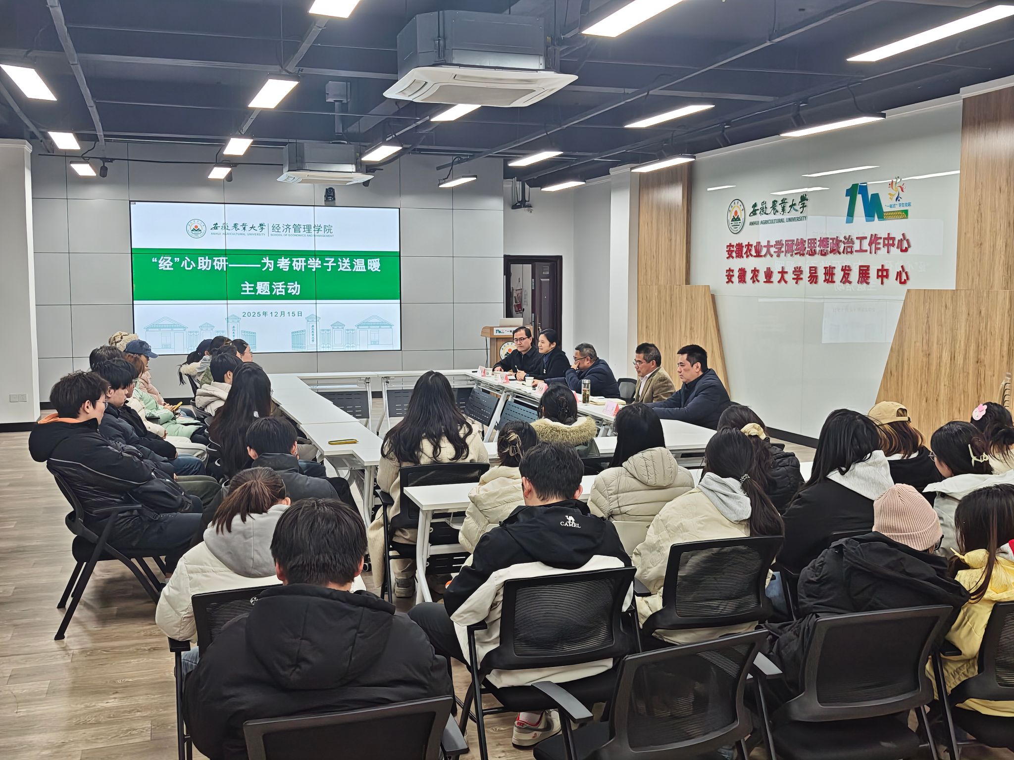 12月15日下午,学院在“一站式”学生社区南区举办为考研学子送温暖主题活动,2022级经济学和电子商务专业共46名考研学生参加。校财务处、审计处、资产经营公司等校直部门主要负责人为即将踏上考场的考研学子送上精心准备的暖心礼包。座谈过程中,老师们与学子们亲切交流,叮嘱大家在最后冲刺阶段既要稳住复习节奏,巩固知识要点,也要注意劳逸结合,调整作息状态,以饱满的精神面貌迎接考试,同时鼓励大家坚定信心,从容应考,学校和学院永远是大家最坚实的后盾。