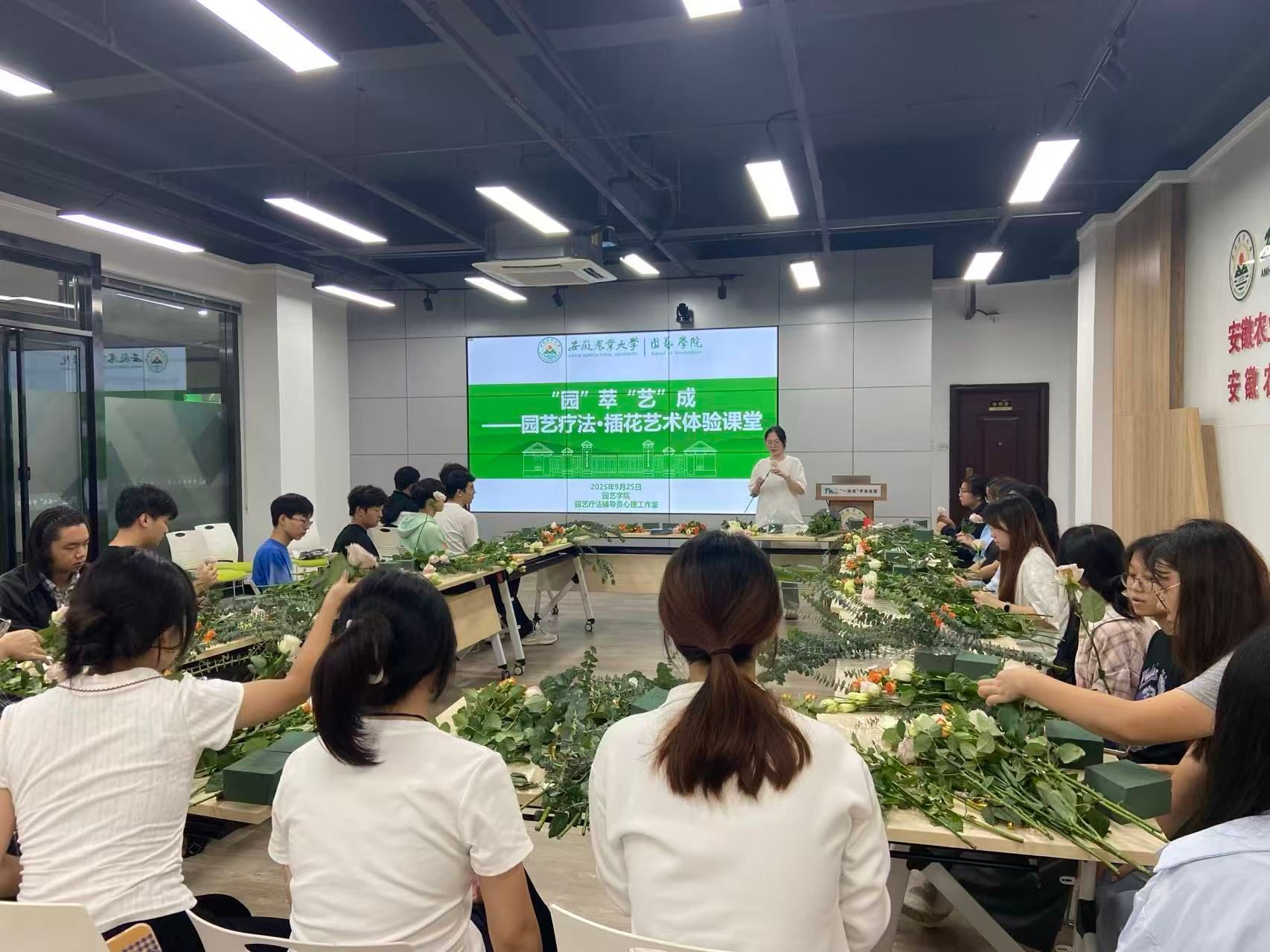 “园”萃“艺”成。9月25日,学院在“一站式”学生社区南区开展“园艺疗法”插花艺术体验课堂。活动由园艺学院“园艺疗法”辅导员心理工作室主办,由2024级风景园林专业硕士研究生许菲菲主讲,2024级园艺观赏1班全体学生参与。许菲菲详细讲解了插花艺术的由来、分类以及插花艺术园艺疗法的重要作用等知识。在许菲菲的指导下,同学们围绕“共植花香”主题进行自由创作。“插花活动让我专注于花朵的芬芳,在欣赏美、创造美的过程中我感受到了心灵的疗愈。”来自2024级园艺观赏1班的梁蕊同学如是说。(文图:花荣越 初审:孙筠淼 复审:叶辉 终审:程玉峰)