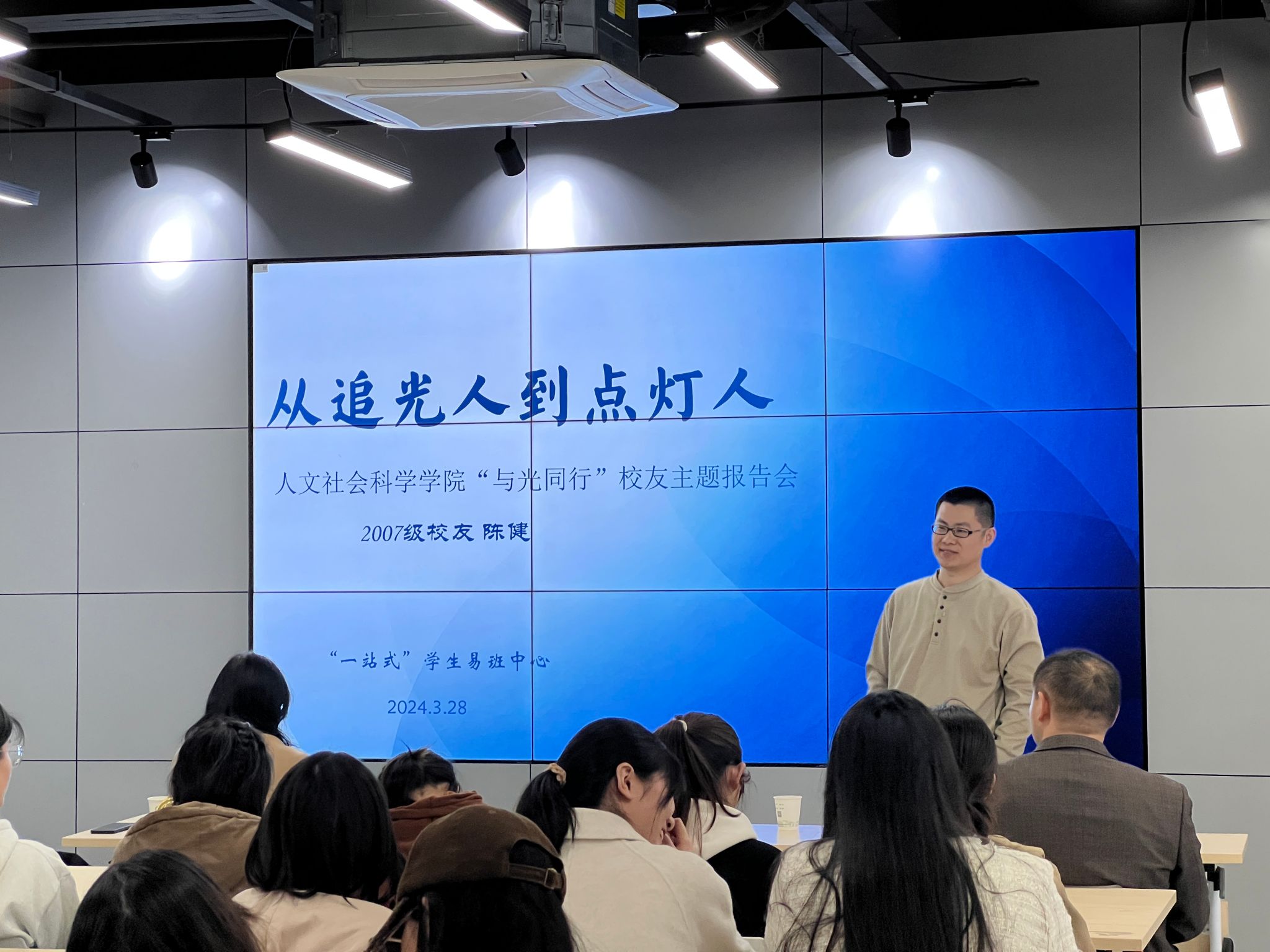 本网讯 为进一步优化就业指导服务,帮助学生树立正确的就业观、择业观,3月28日下午,人文社会科学学院邀请到2011届汉语言文学专业校友,现任杭州安恒信息技术股份有限公司(合肥)公司总经理陈健开展就业专场报告会。学院党委副书记单国雷、中文系教授沈琳及学生代表出席本次活动。